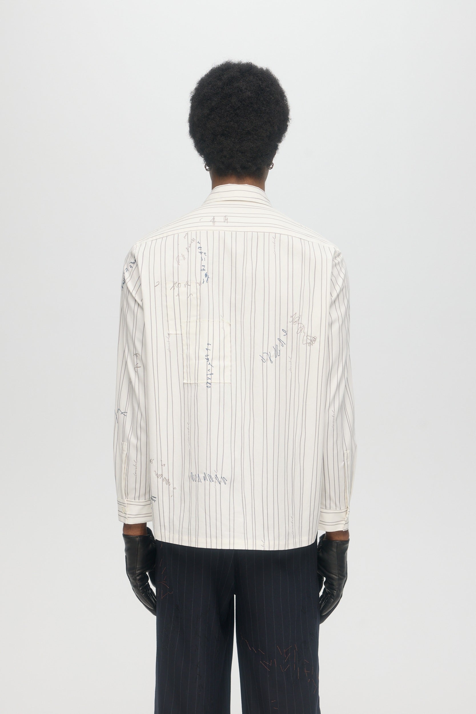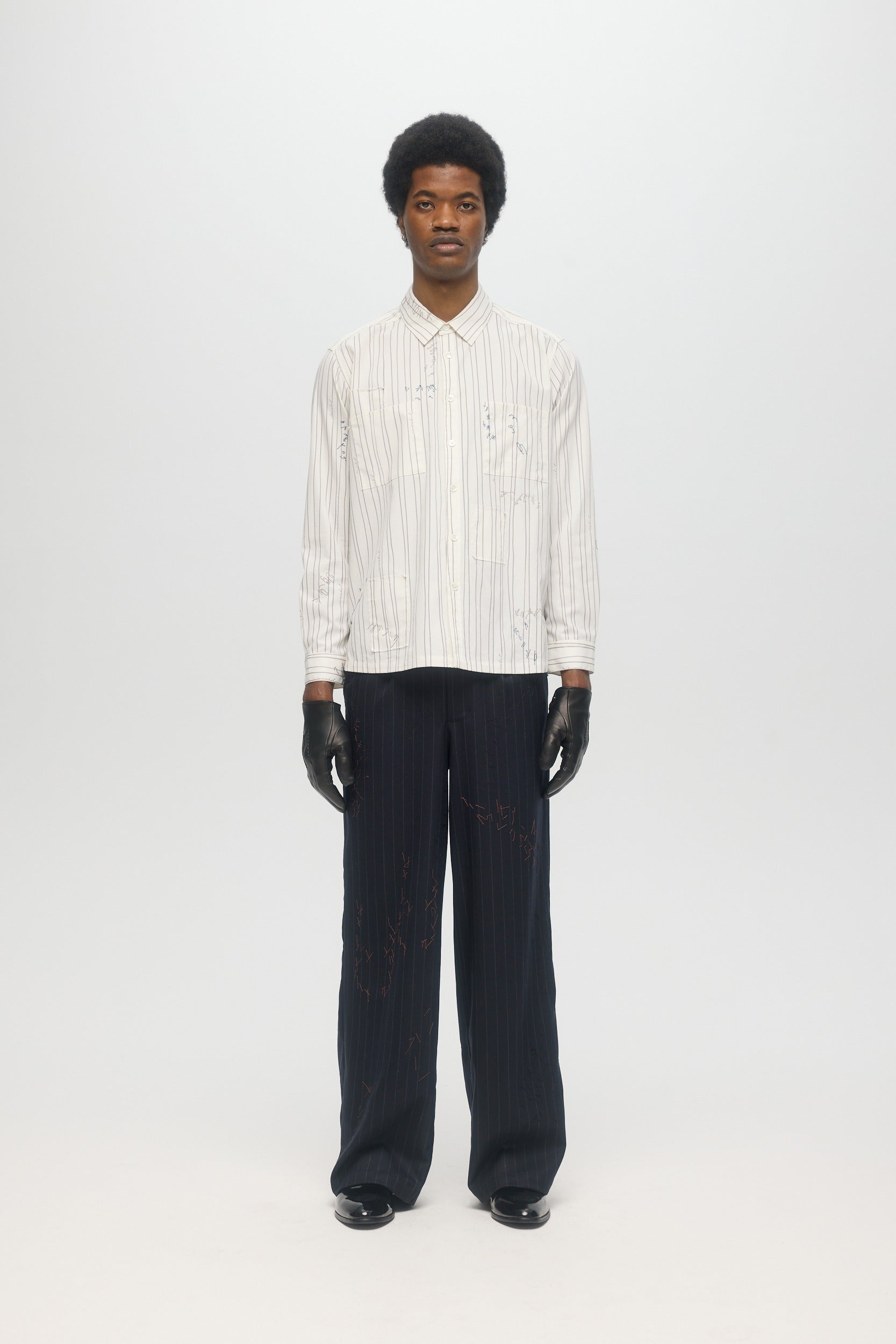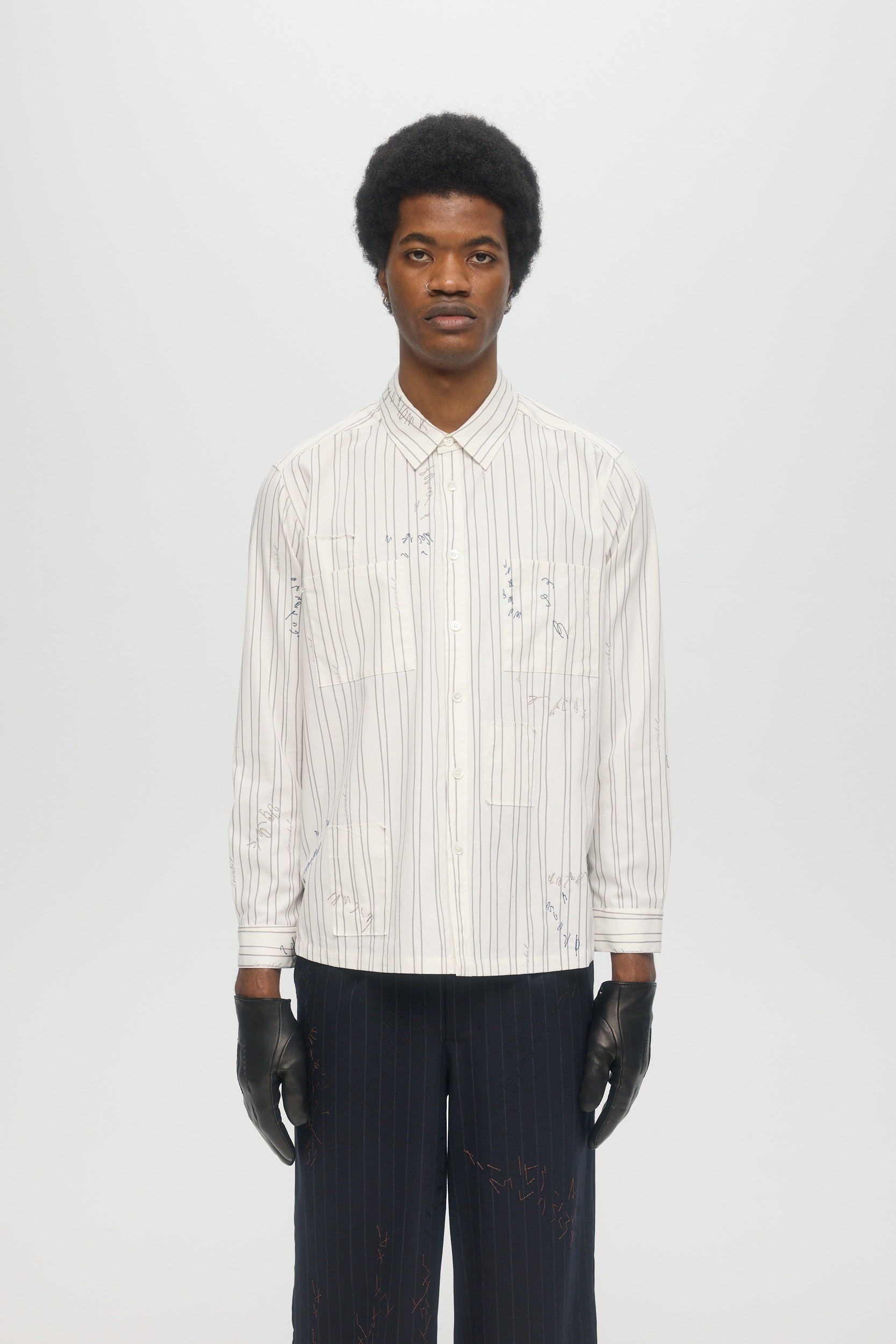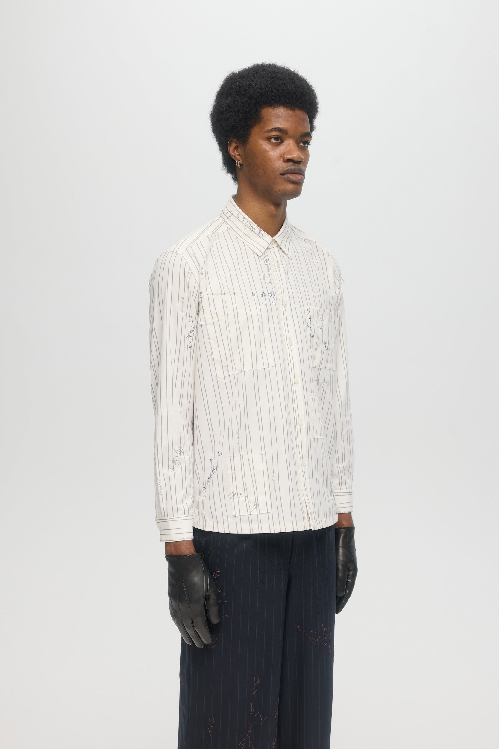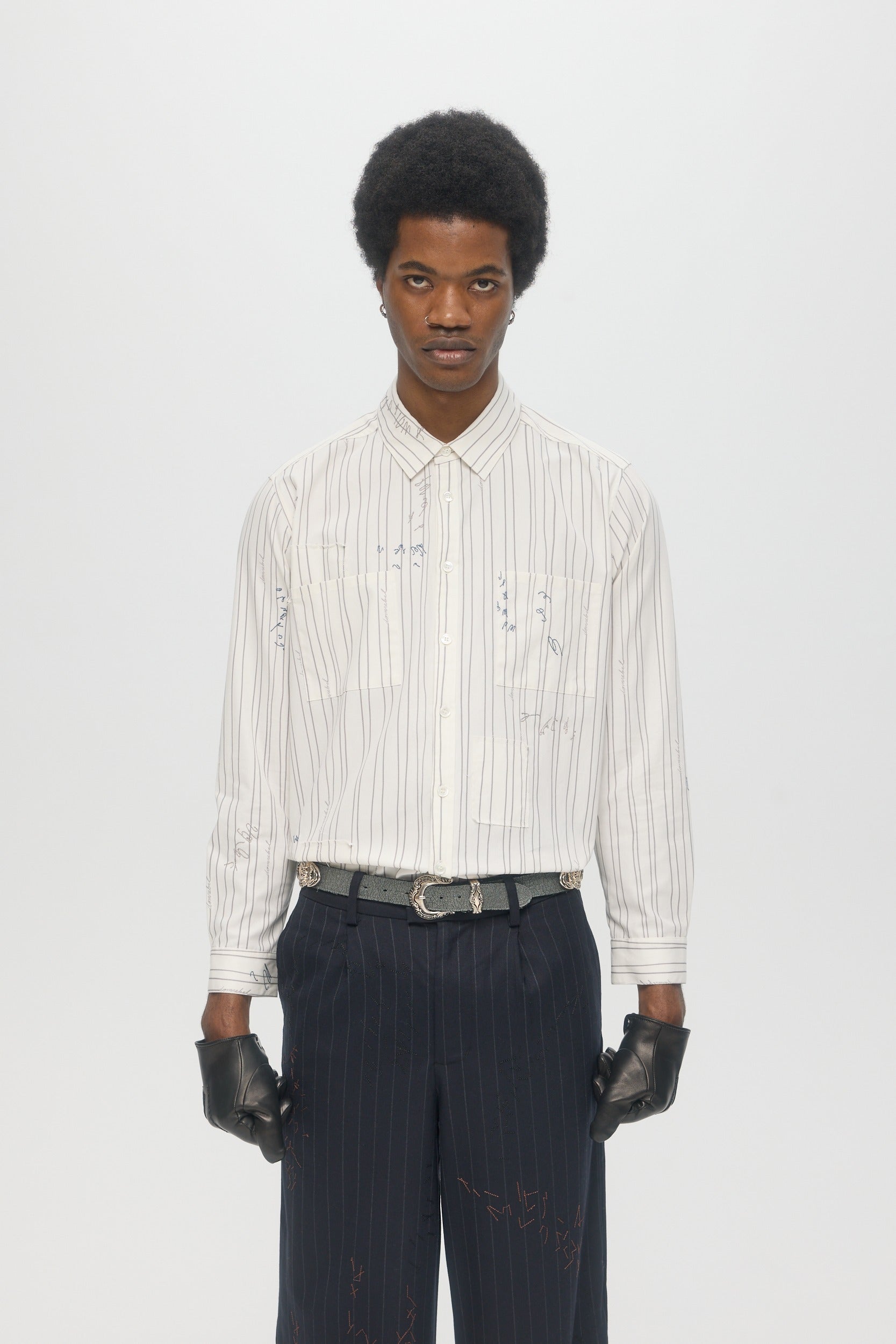 The Mending longsleeve shirt features printed hand-drawn imperfect pinstripes throughout, with subtle DOMREBEL brand names incorporated within the pinstripes. Decorative repair details are embroidered throughout the piece. Featuring mother-of-pearl buttons and a regular collar, the fit is slim and timeless, with a slightly shorter sleeve.