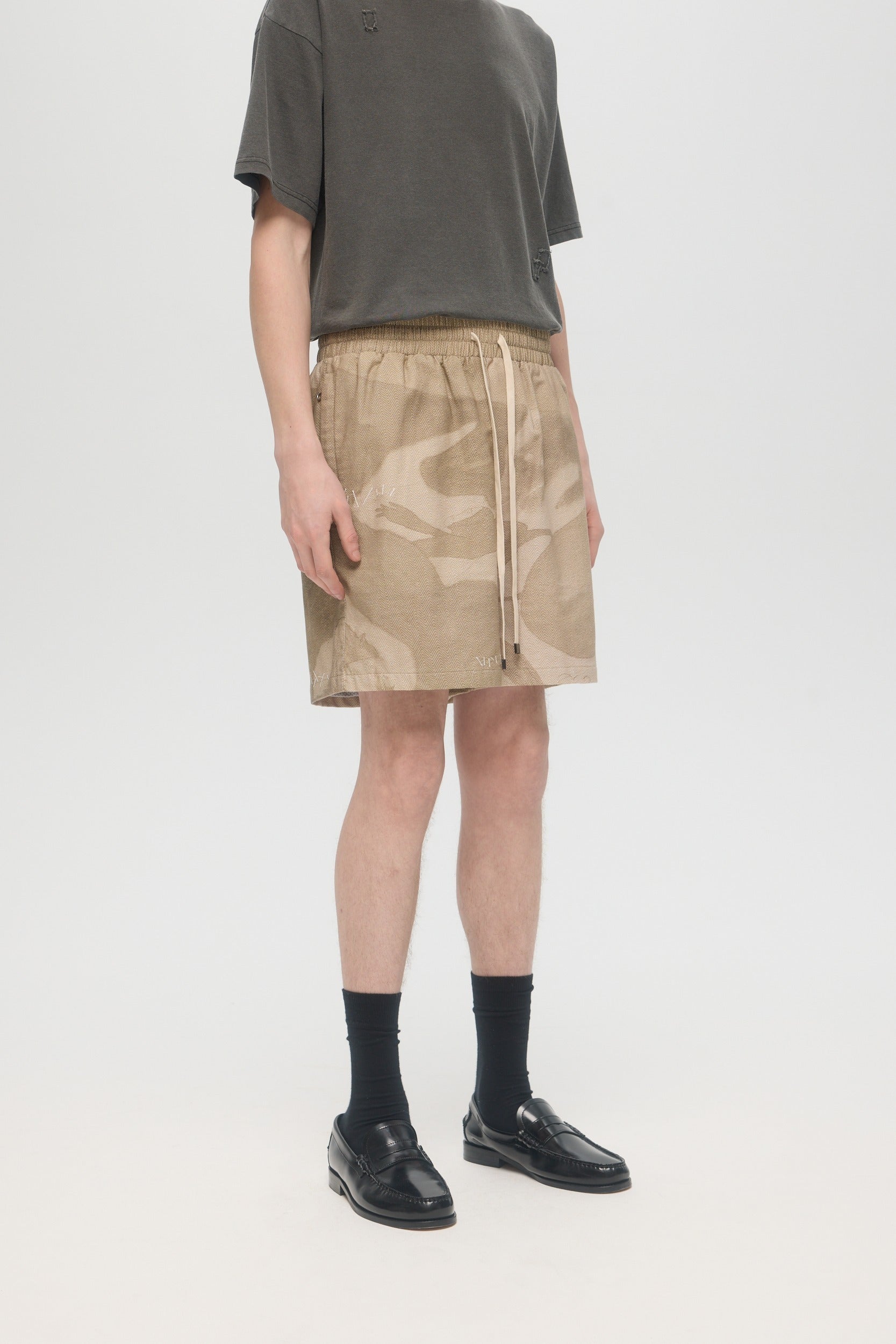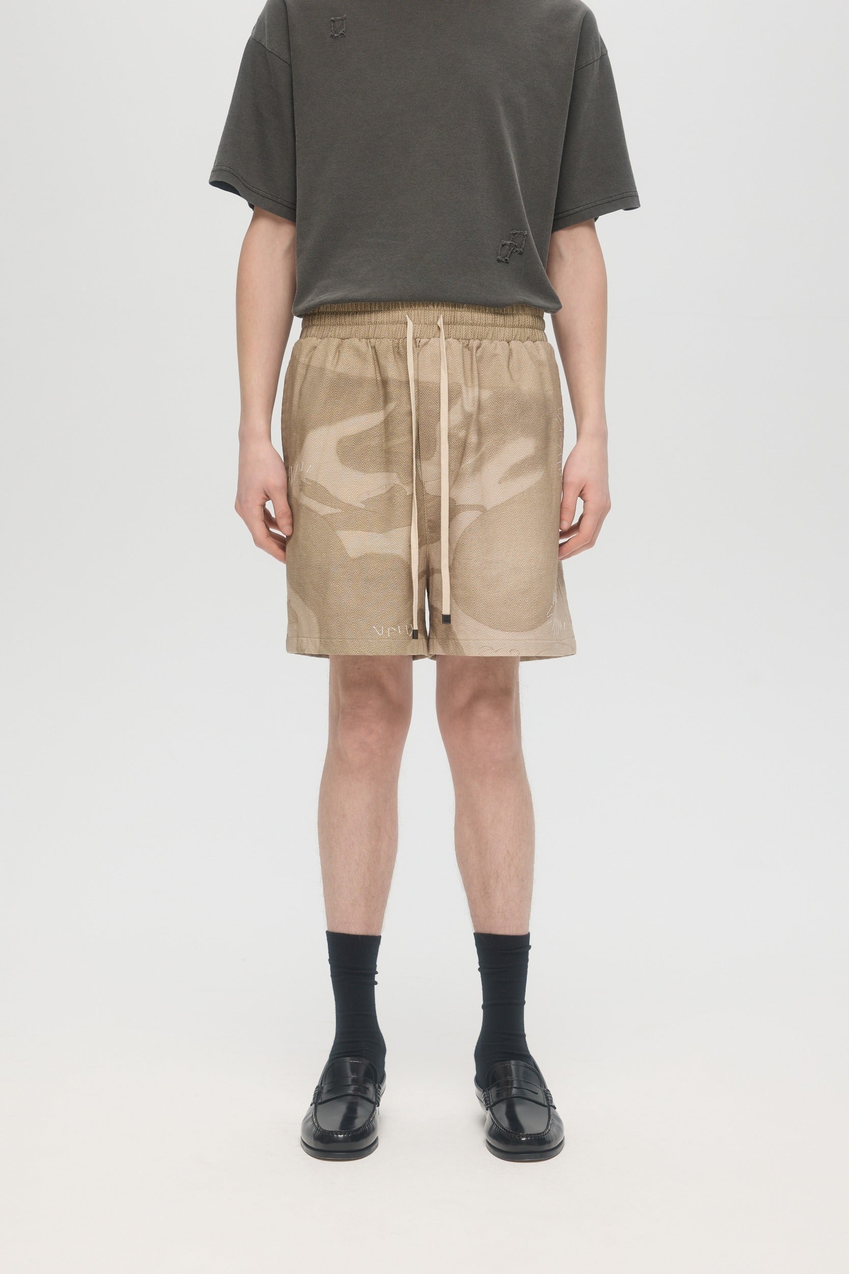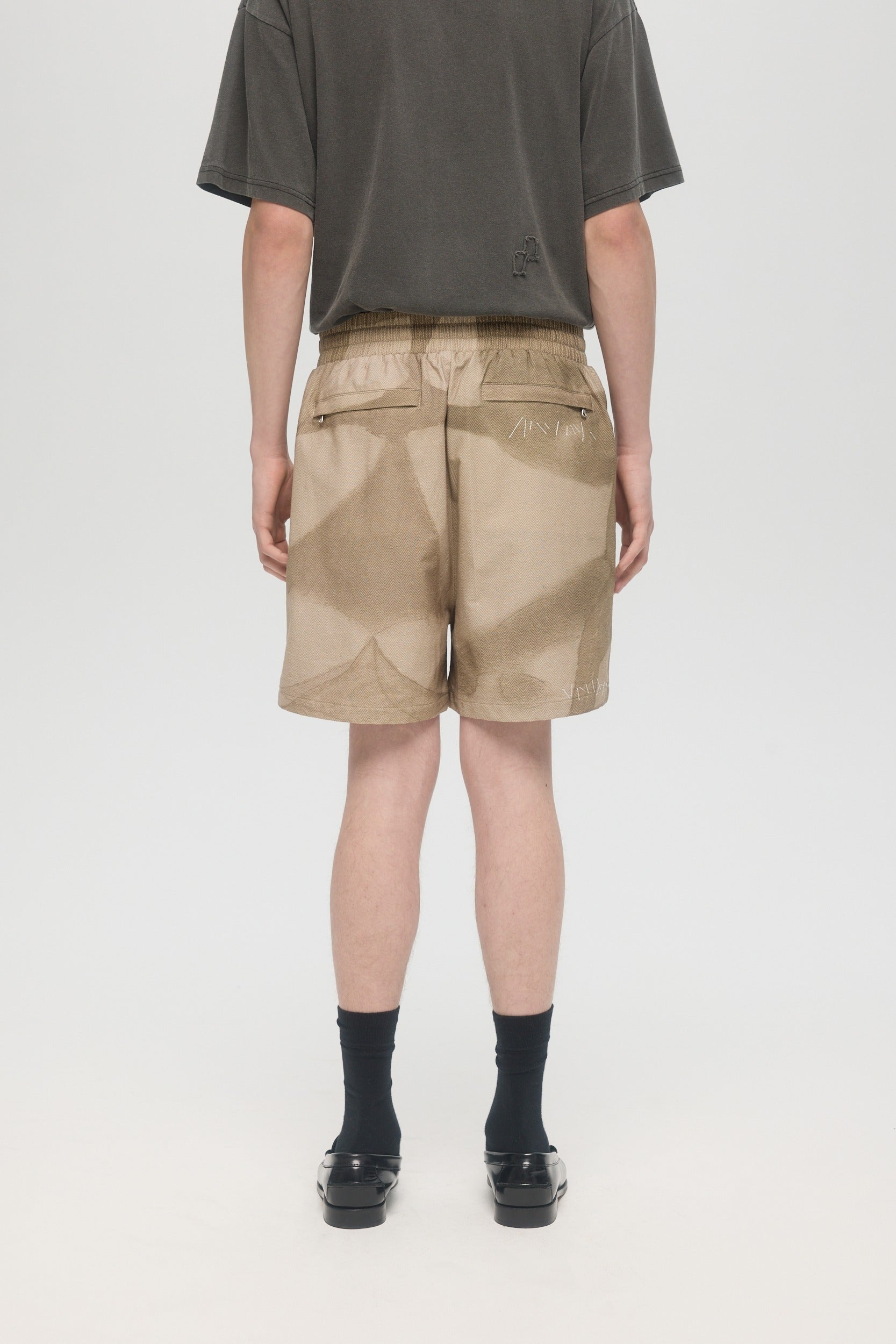 The Hillside shorts are made in an elevated basketball short construction, with fully lined mesh, side and back zip pockets, and an elastic waistband. Original DOMREBEL studio artwork is printed throughout, with a trompe l'oeil herringbone pattern, on a versatile cotton textile that matches with the Hillside shirt. Fit is relaxed and true to size.