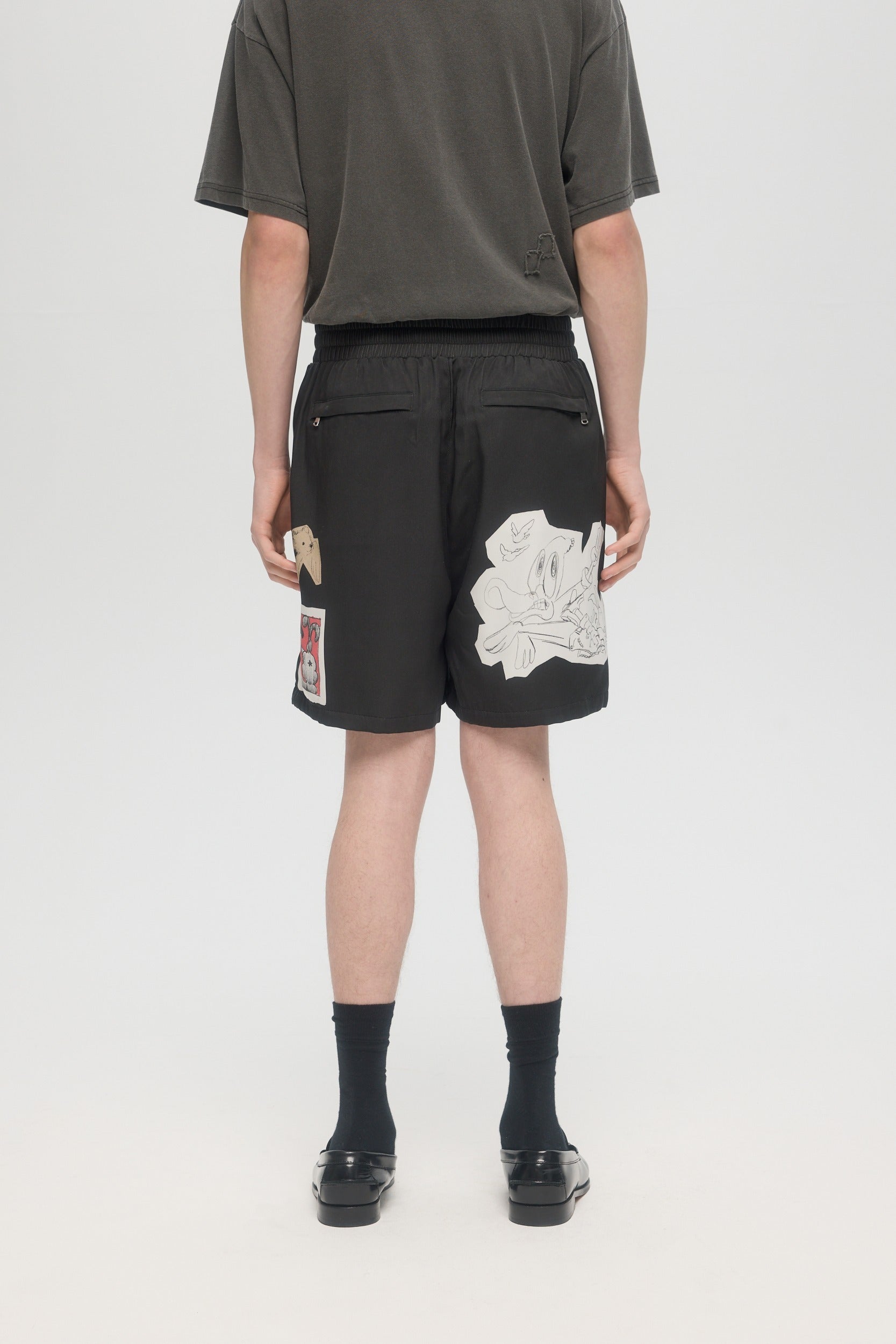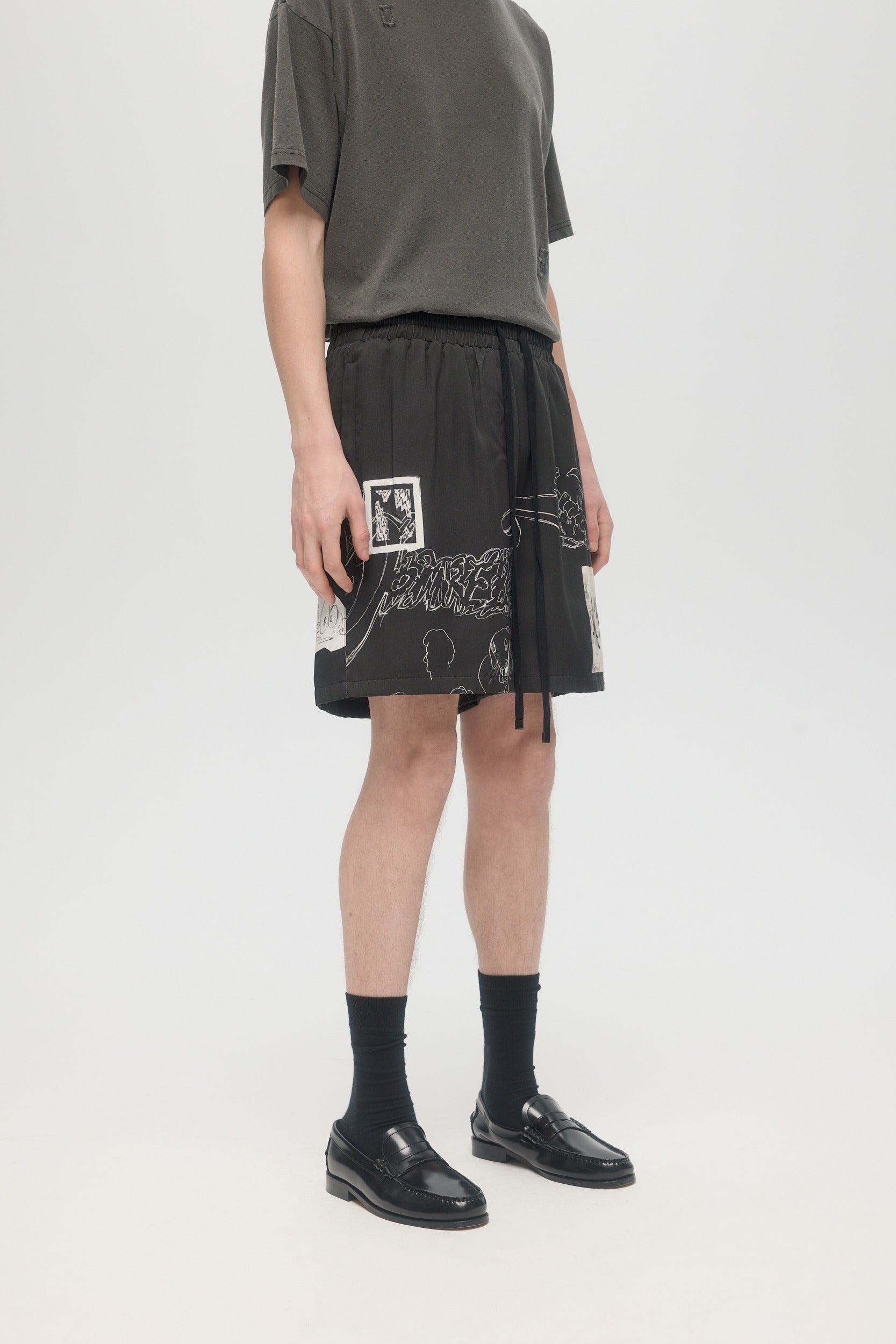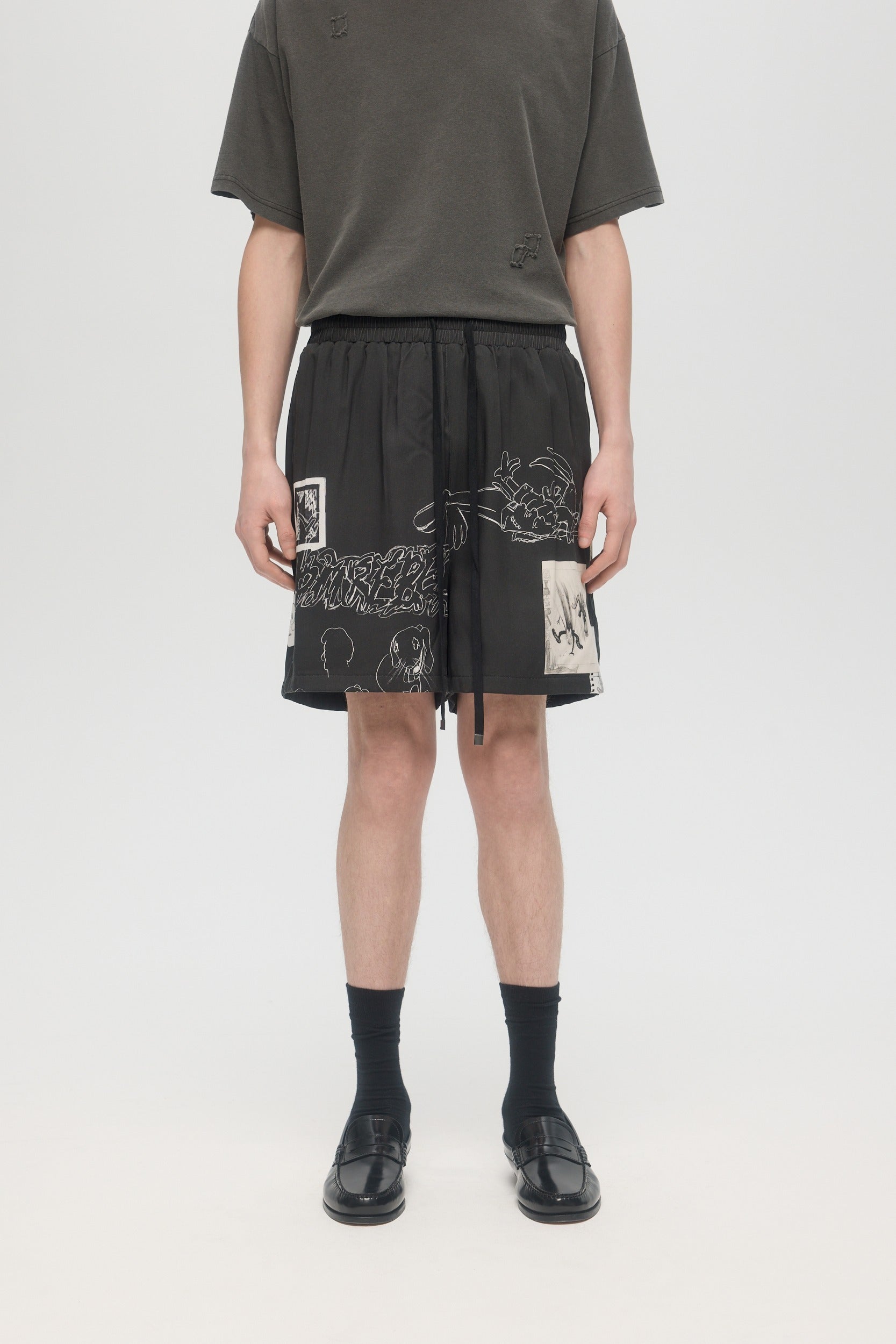 The Assemblage shorts are made in an elevated basketball short construction, with fully lined mesh, side and back zip pockets, and an elastic waistband. Original DOMREBEL studio artworks are printed throughout, on our popular rayon tencel twill fabric. Fit is relaxed and true to size. Matches well with the Assemblage shirt.