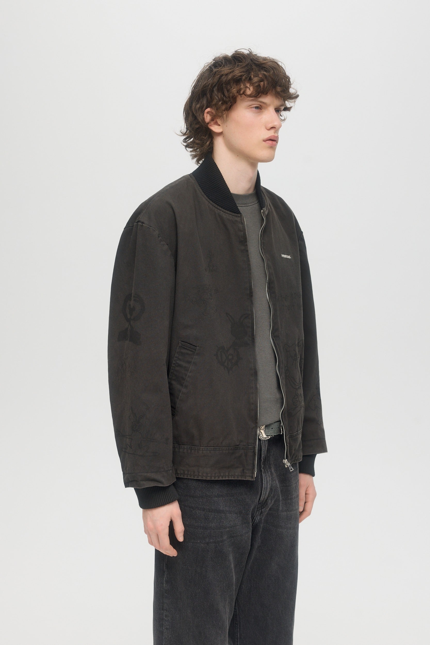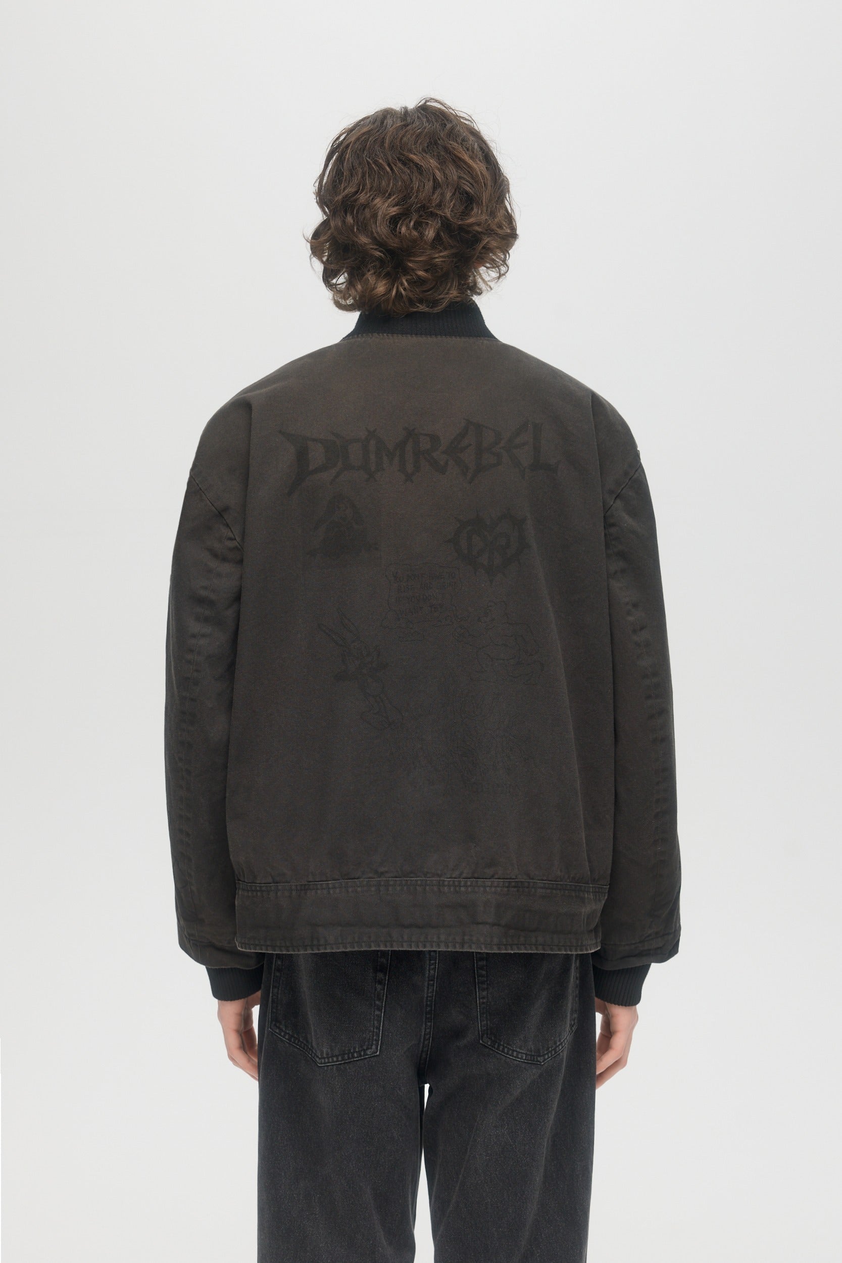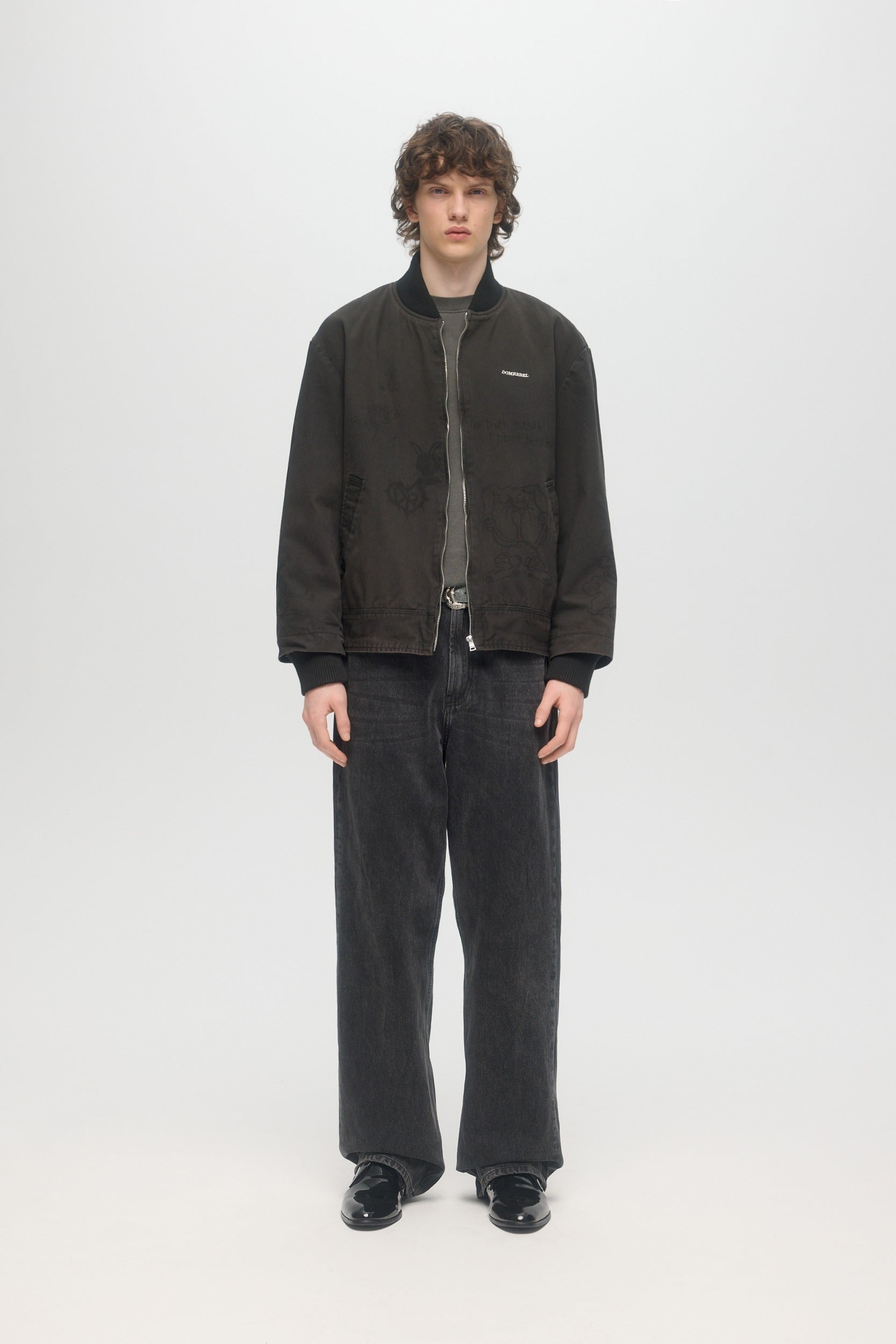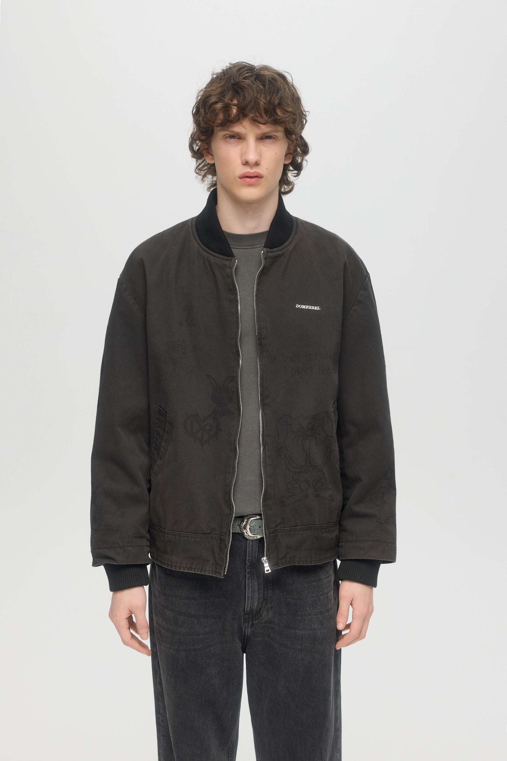 The College jacket is a heavy-washed rib-collar bomber jacket with original DOMREBEL studio drawings printed throughout. Featuring heavy vintage wash treatment and fading throughout. Zip front closure, with size zip pockets. Fits regular and relaxed. Please note all pieces are unique and feature various faded areas, which is inherent to the vintage treatment process.