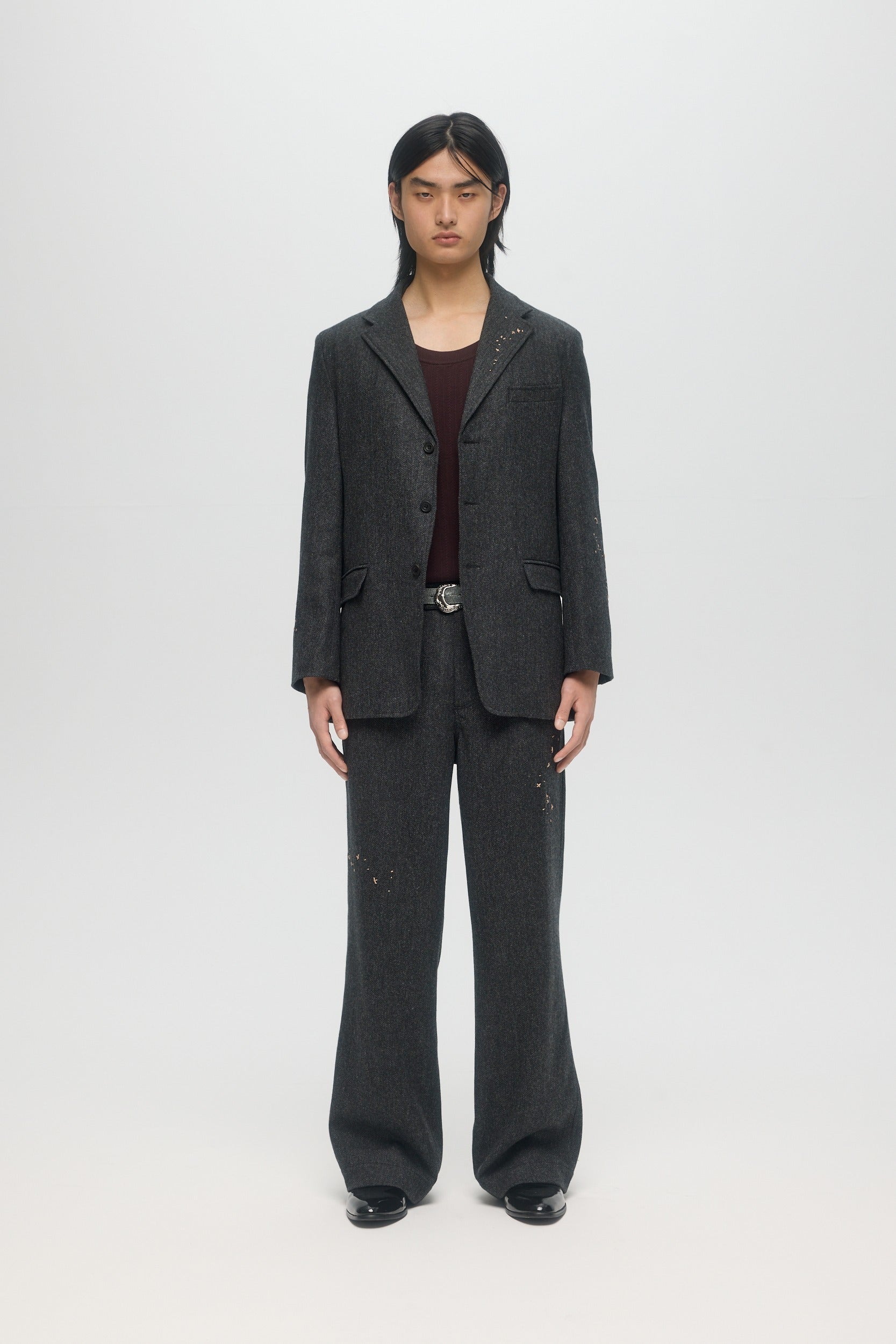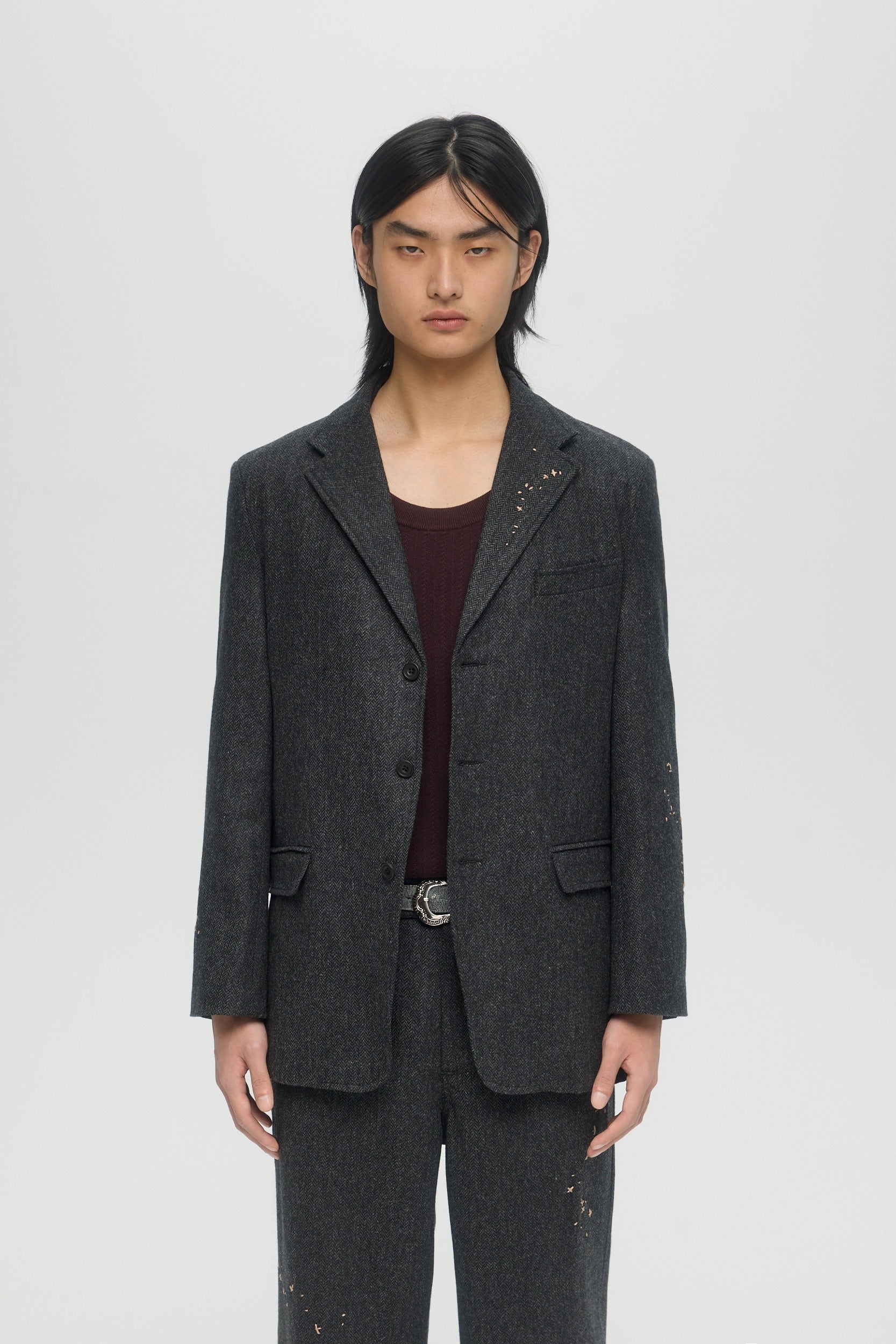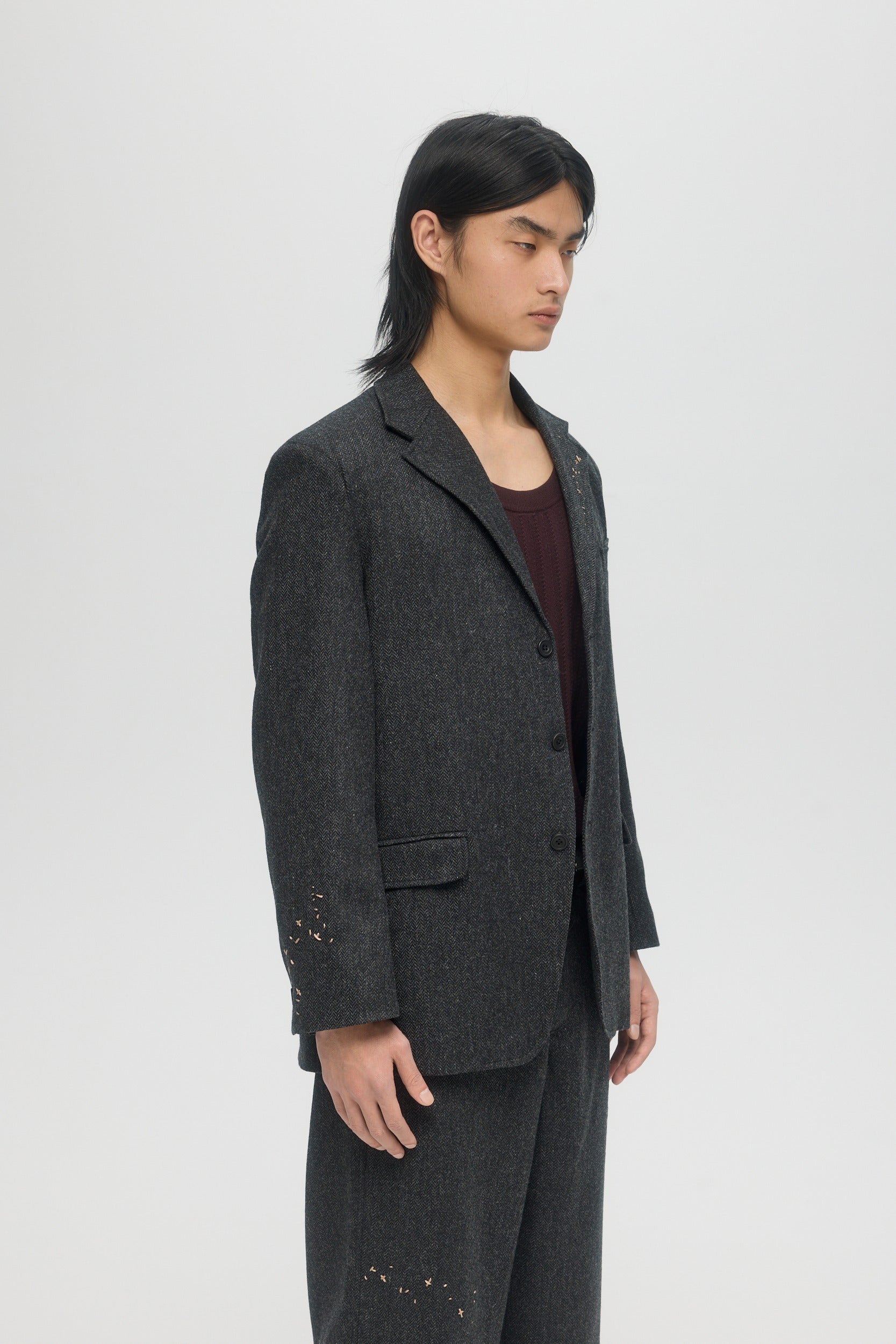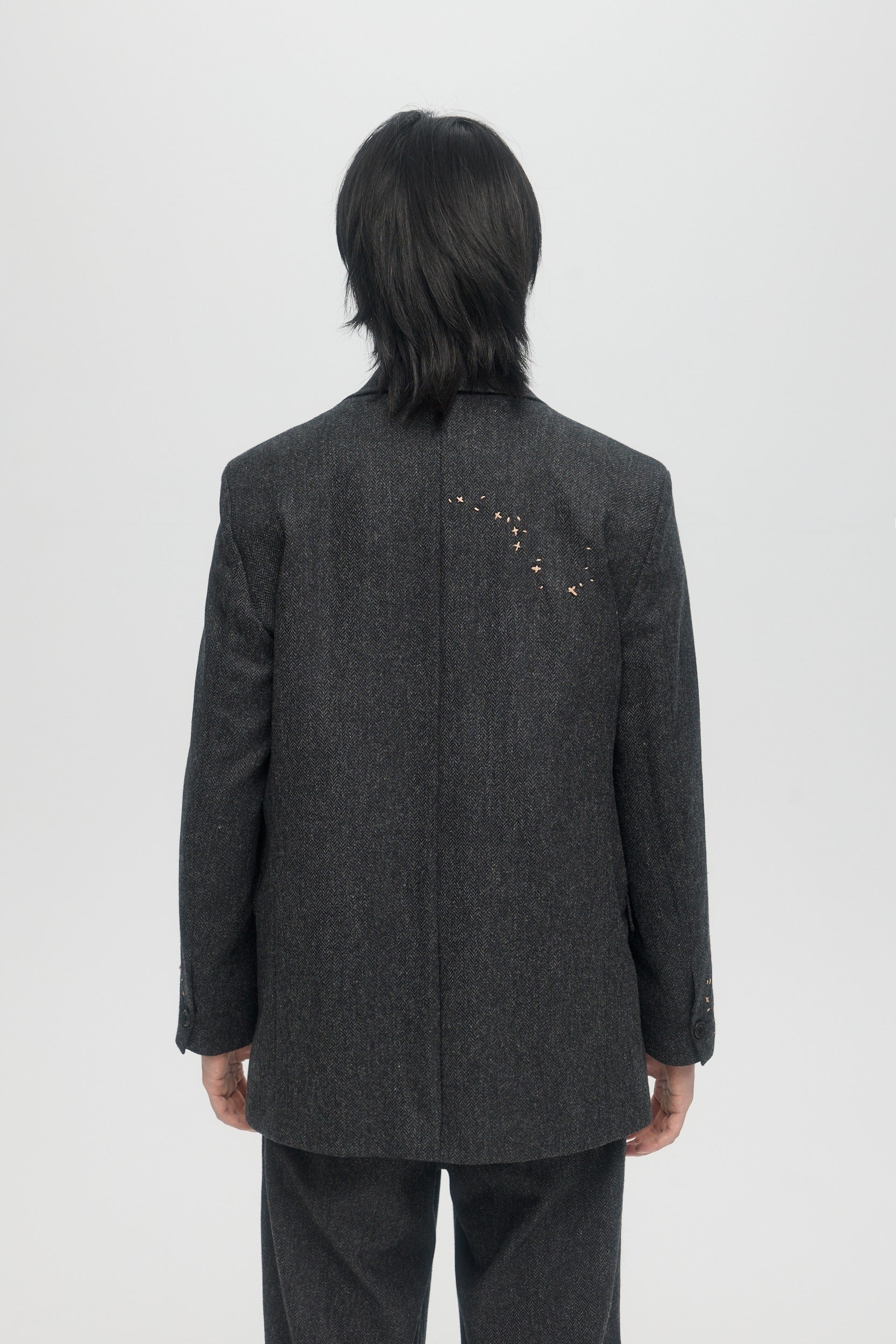 Handmade in London, the Creator Suit Blazer is part of a suit set with matching trousers, and is made from a luxurious UK wool herringbone fabric. The 3-button single-breast blazer is detailed throughout with hand-embroidered mending stitchwork. In a nod to traditional British craftsmanship, the piece is hand-crafted throughout, with functional cuff buttons and hand-sewn shoulder padding. Horn buttons at the front and cuffs.