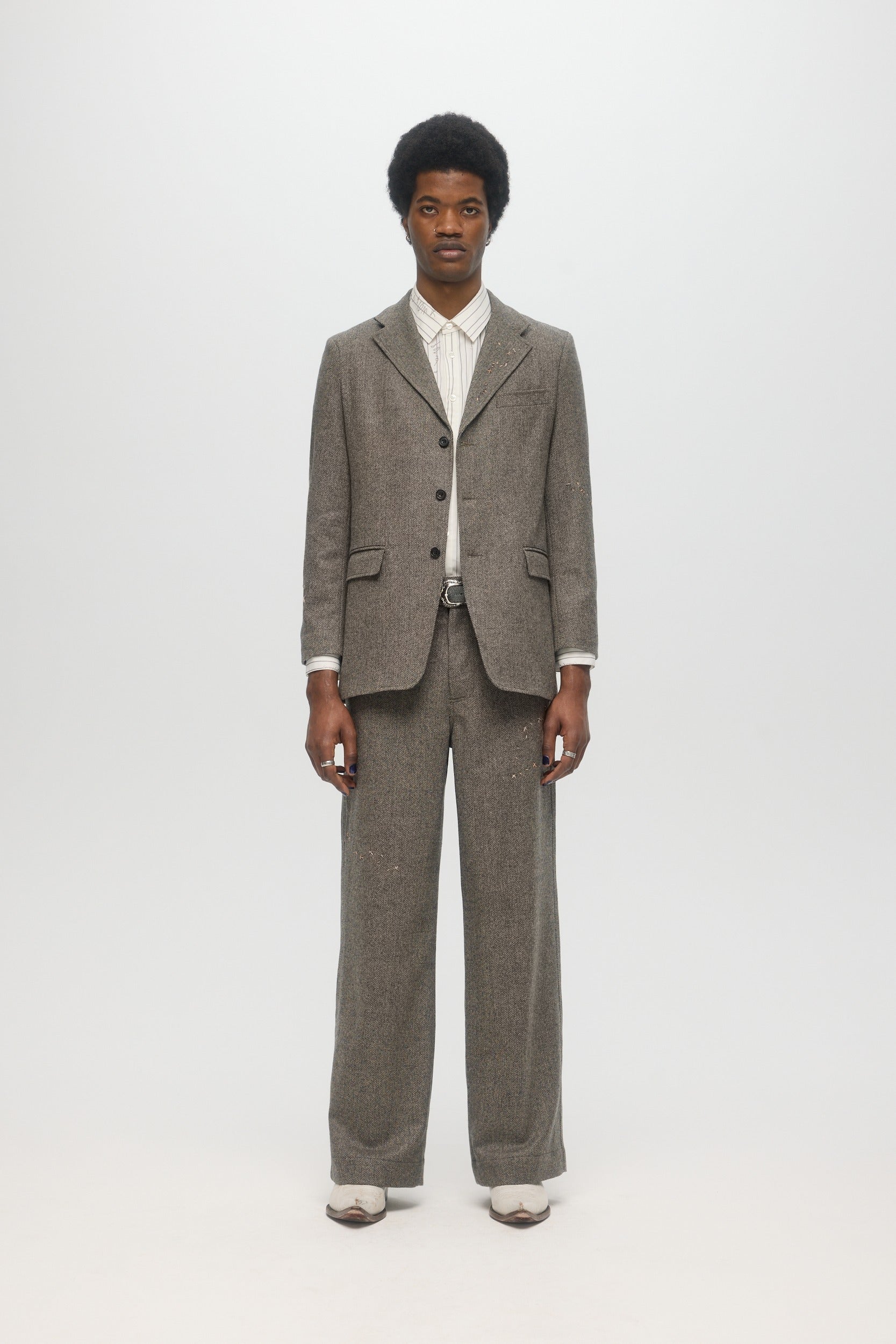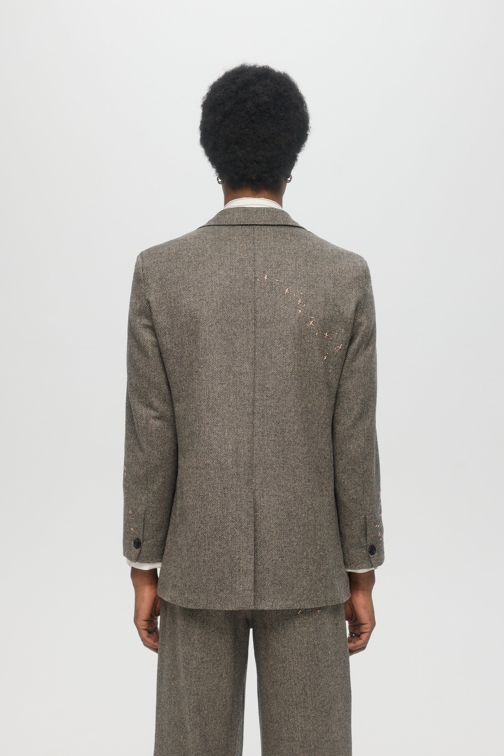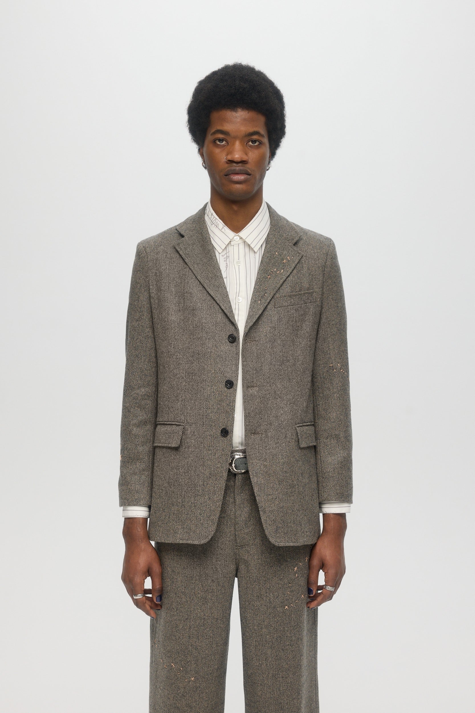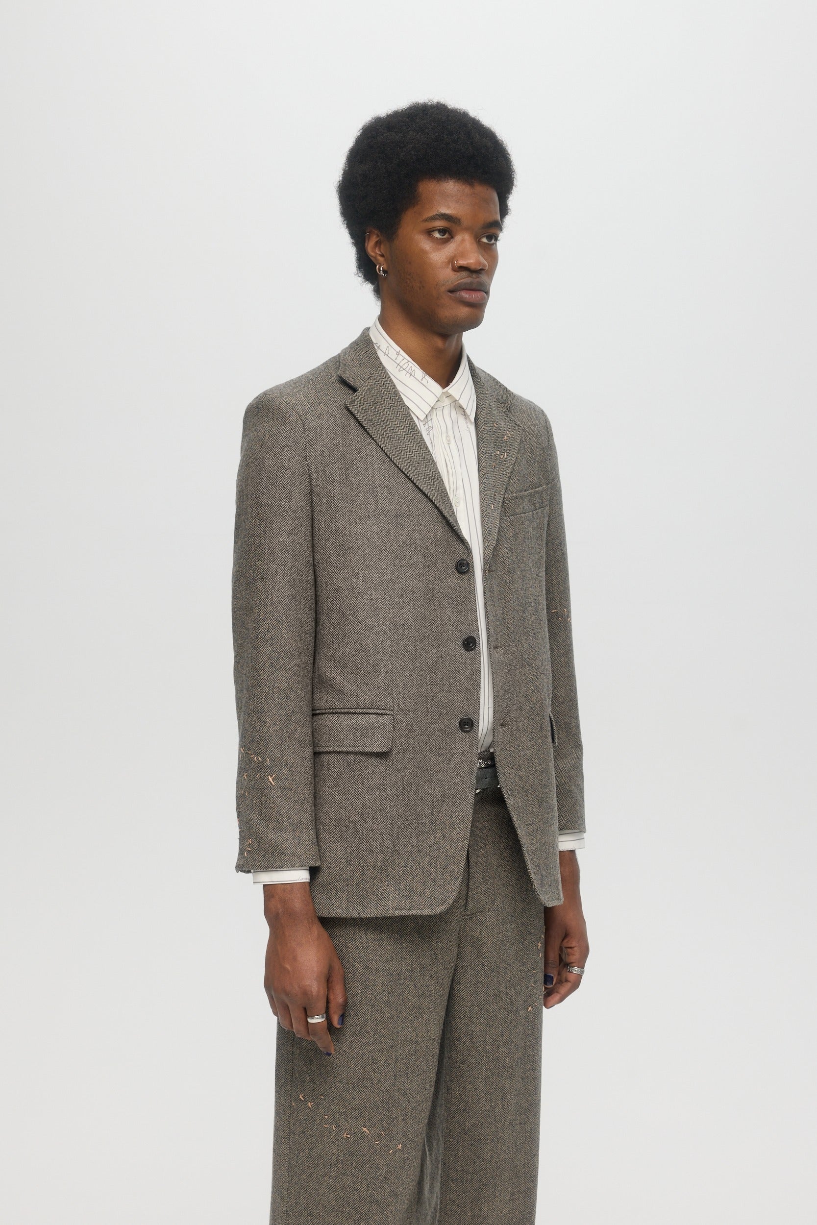 Handmade in London, the Creator Suit Blazer is part of a suit set with matching trousers, and is made from a luxurious UK wool herringbone fabric. The 3-button single-breast blazer is detailed throughout with hand-embroidered mending stitchwork. In a nod to traditional British craftsmanship, the piece is hand-crafted throughout, with functional cuff buttons and hand-sewn shoulder padding. Horn buttons at the front and cuffs.
