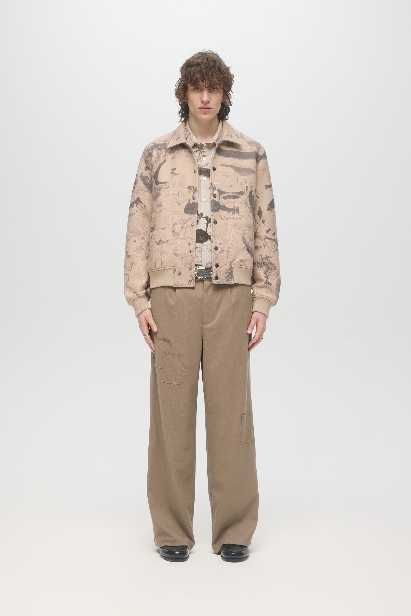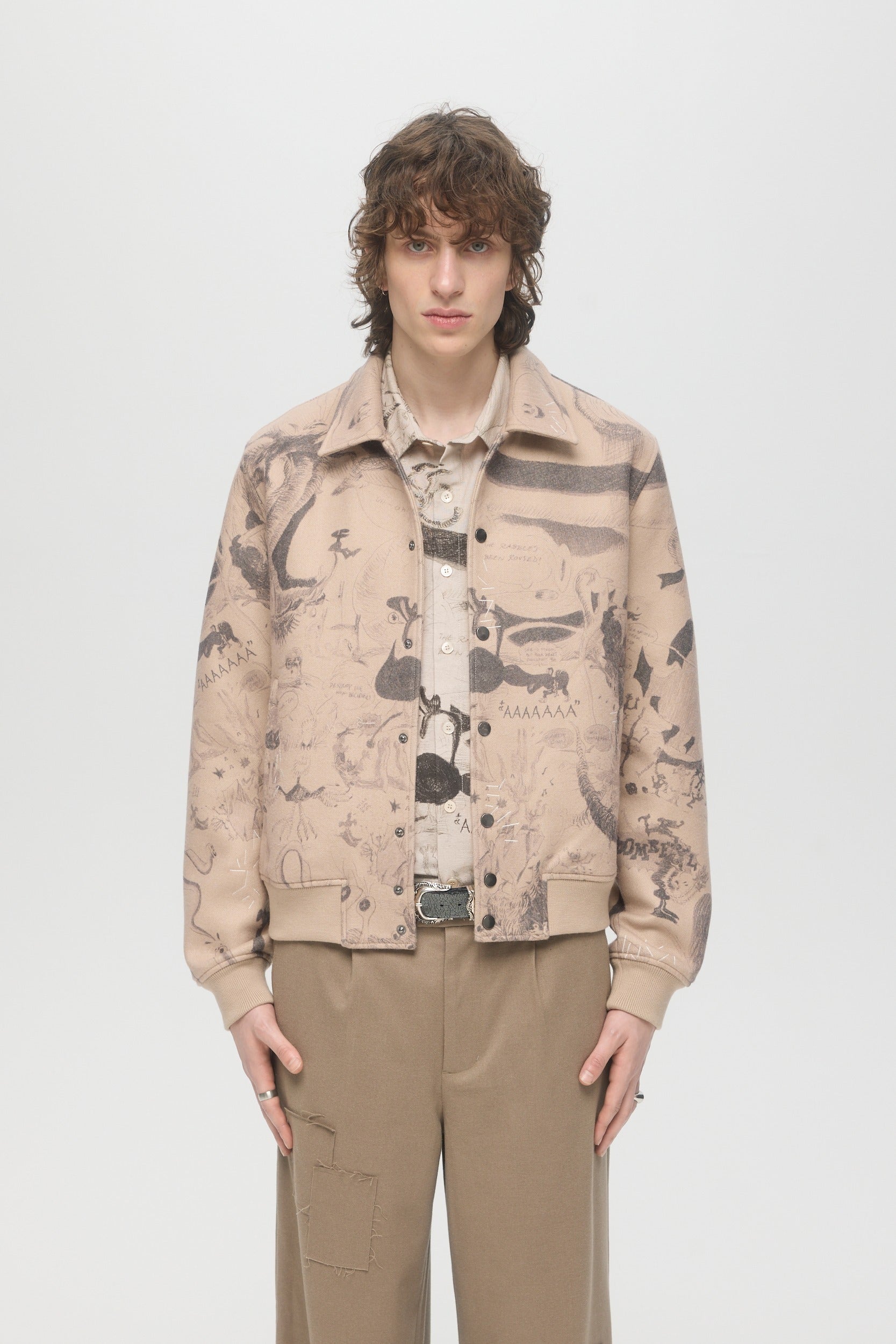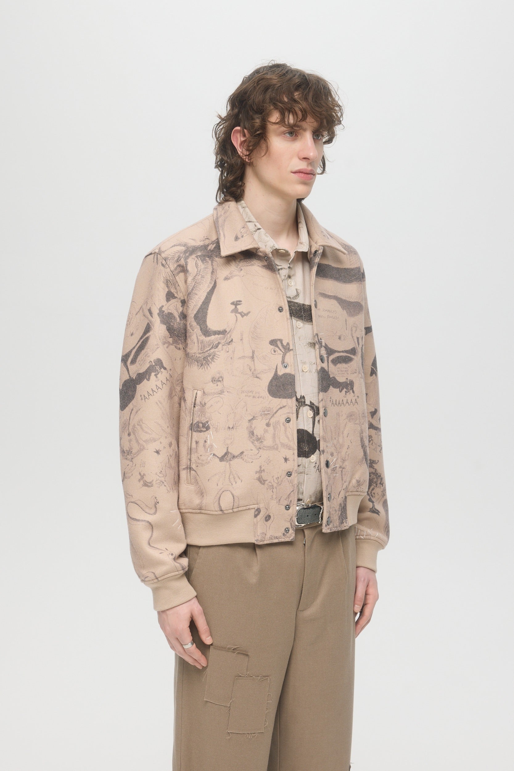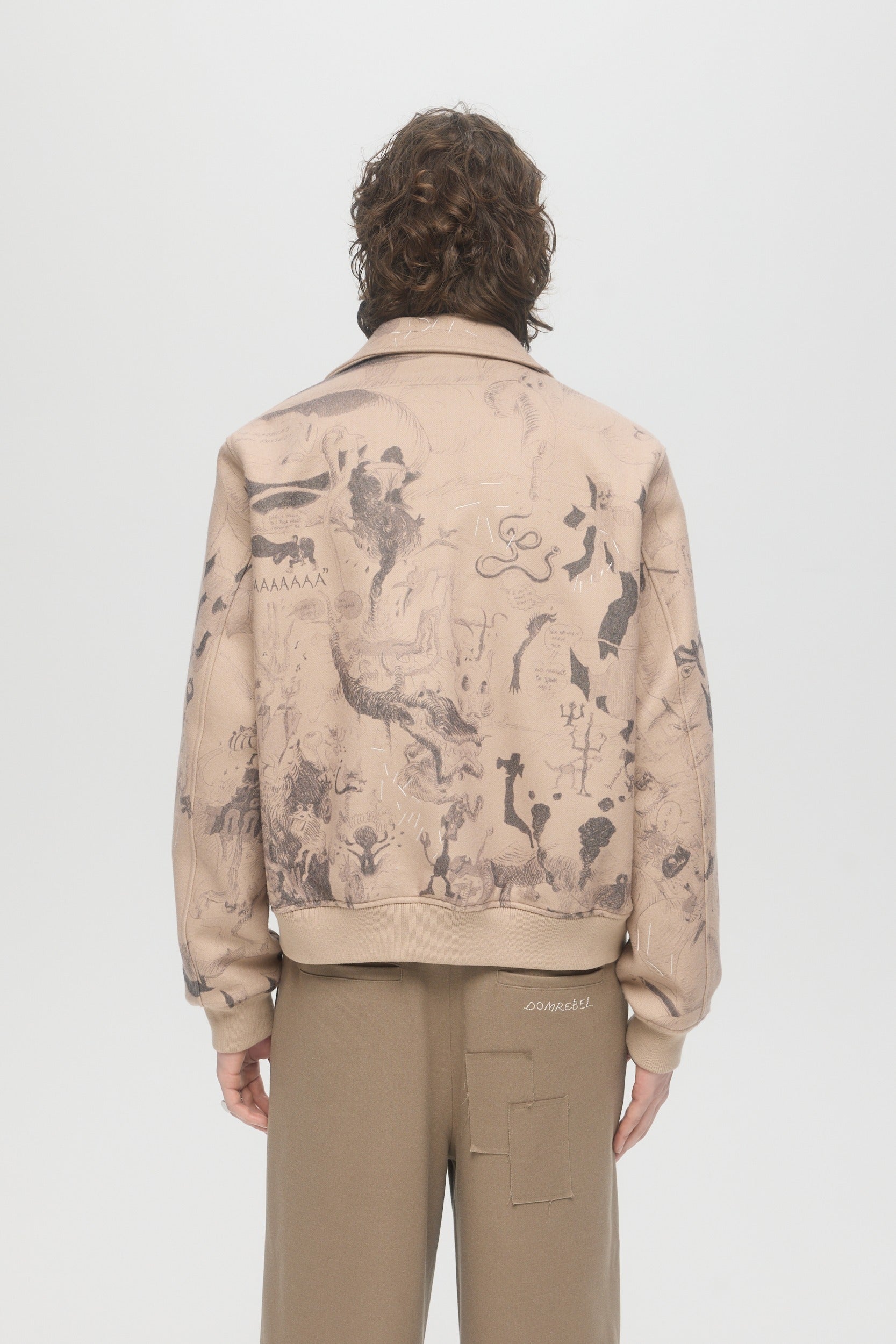 The Megalo jacket is a spread-collar bomber jacket with original DOMREBEL studio artworks printed throughout. The artwork is printed on a felted textile, and the jacket features front snap button closures, side zip pockets, concealed inner pocket, and rib cuffs and waist. The fully-lined piece fits regular, but can be sized up for a more relaxed fit.