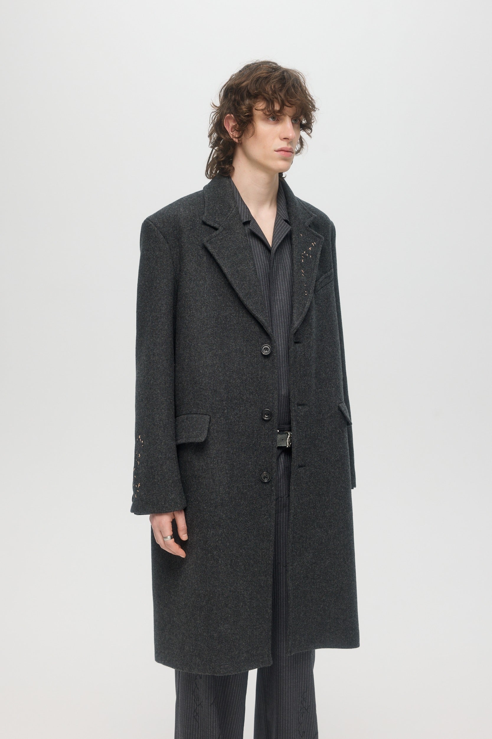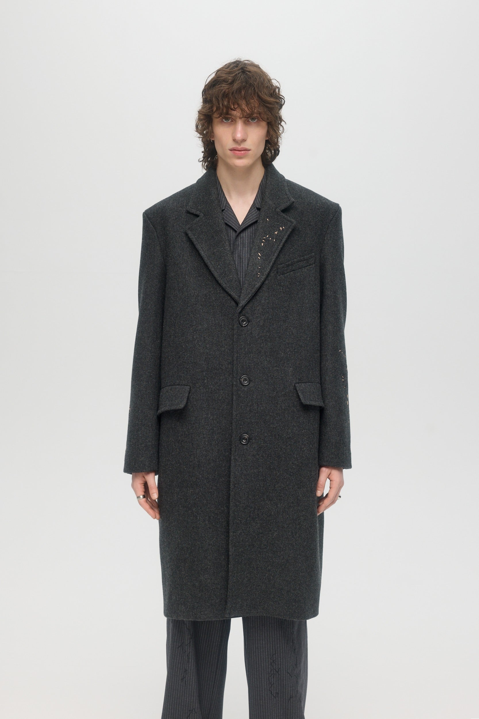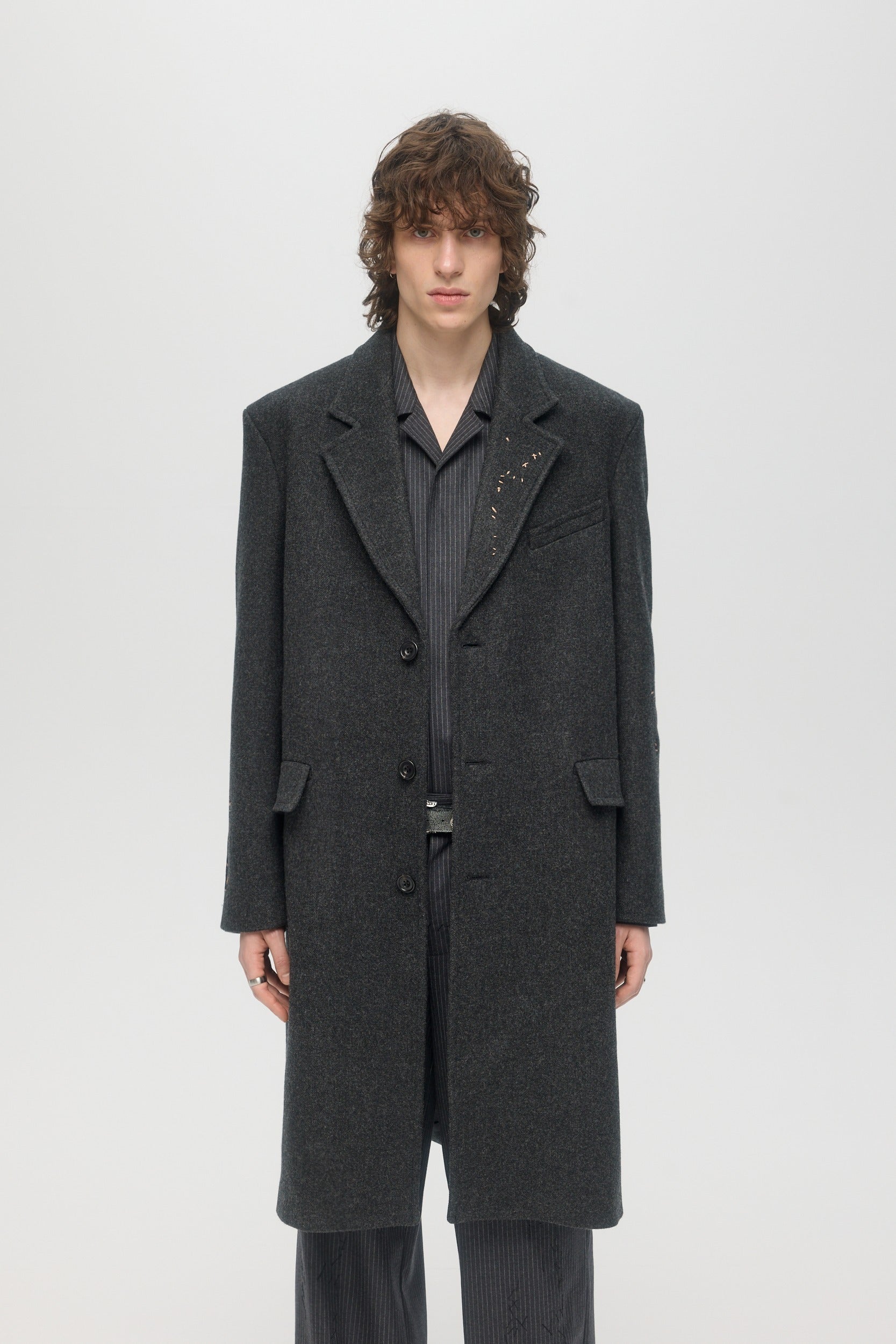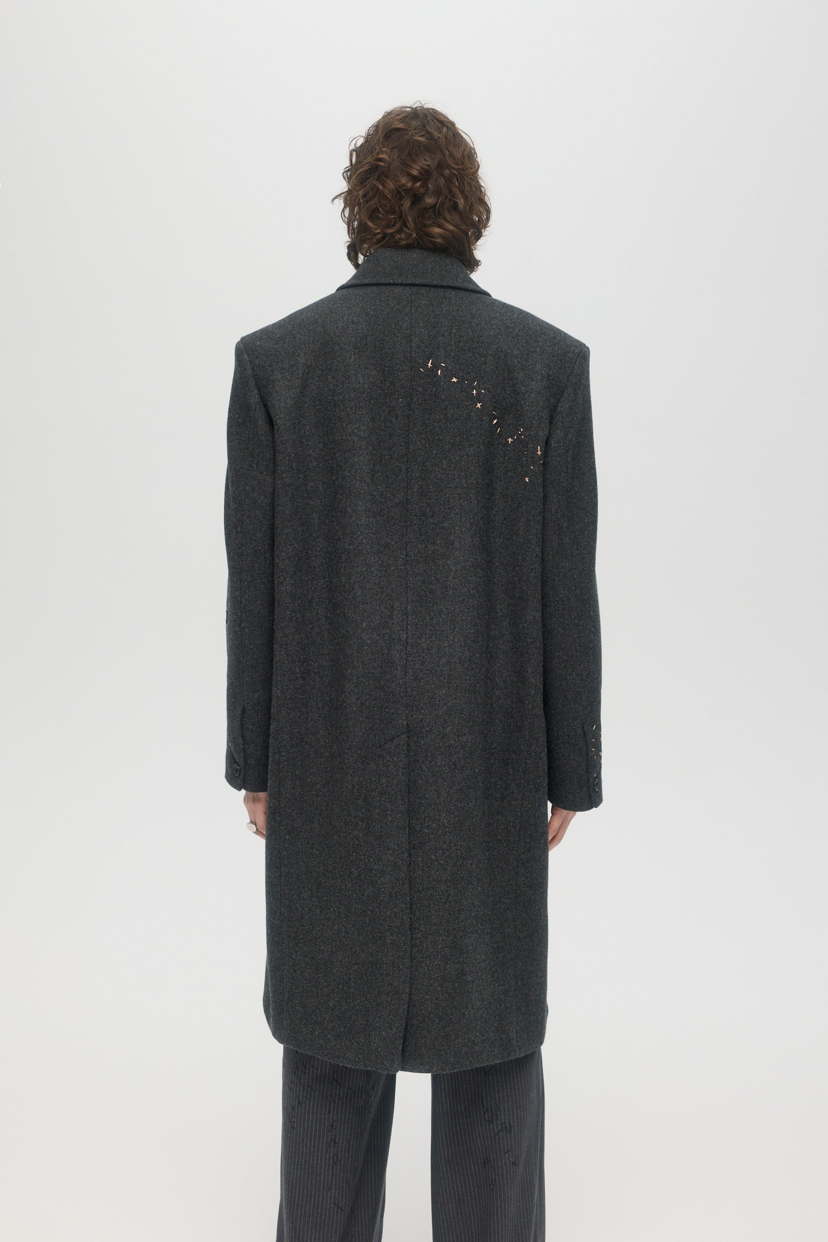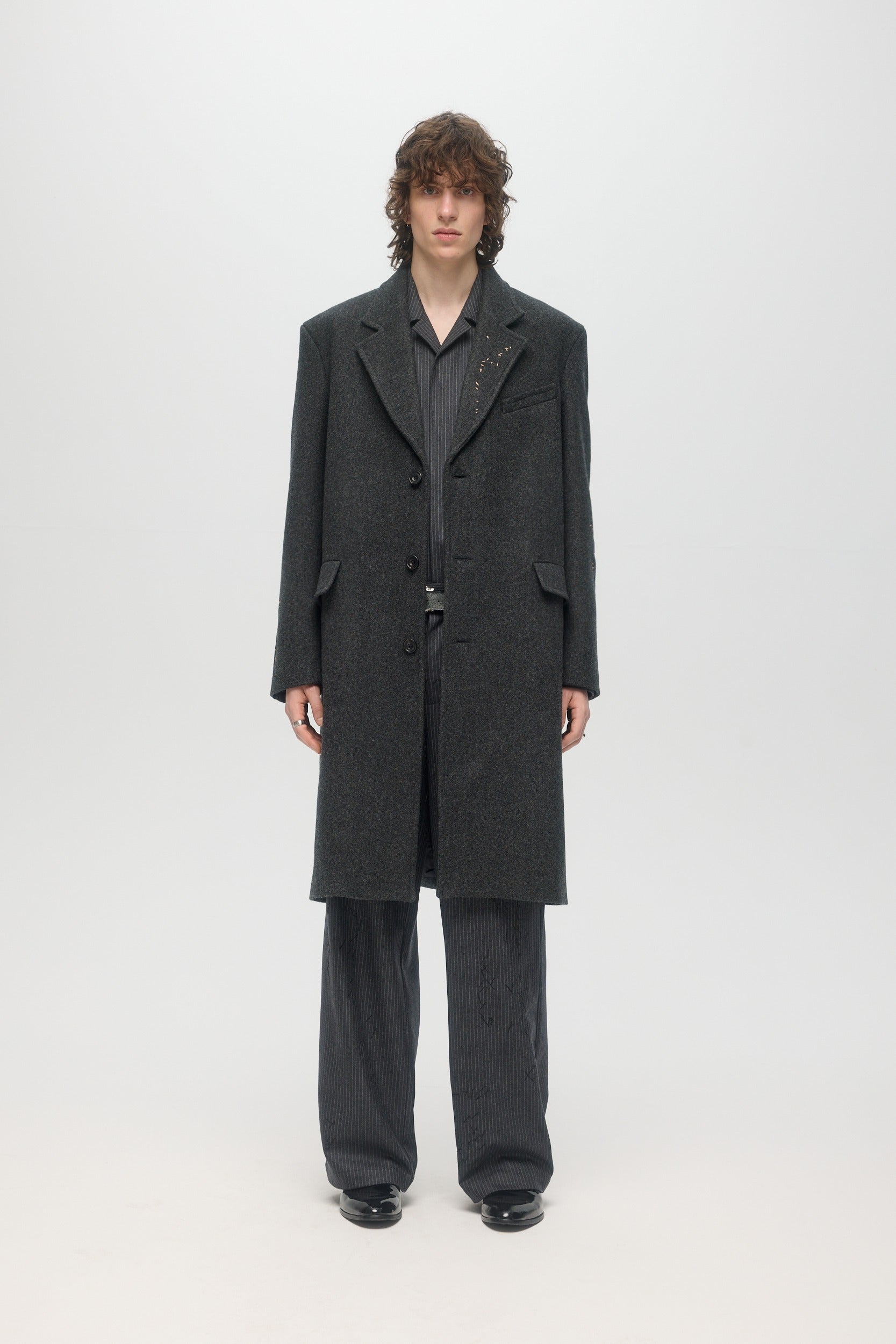 Handmade in London, the Artist Coat is made from a luxurious UK wool herringbone fabric, and detailed throughout with hand-embroidered stitchwork. The fully-lined coat has a tailored fit, with structured shoulders and a straight body. Horn buttons at the front and cuffs. This very limited edition piece is a nod to traditional British craftsmanship, with subtle DOMREBEL subversive details.
