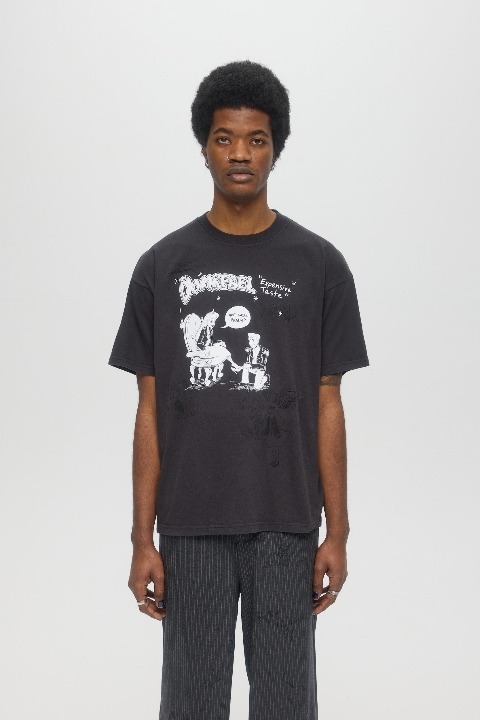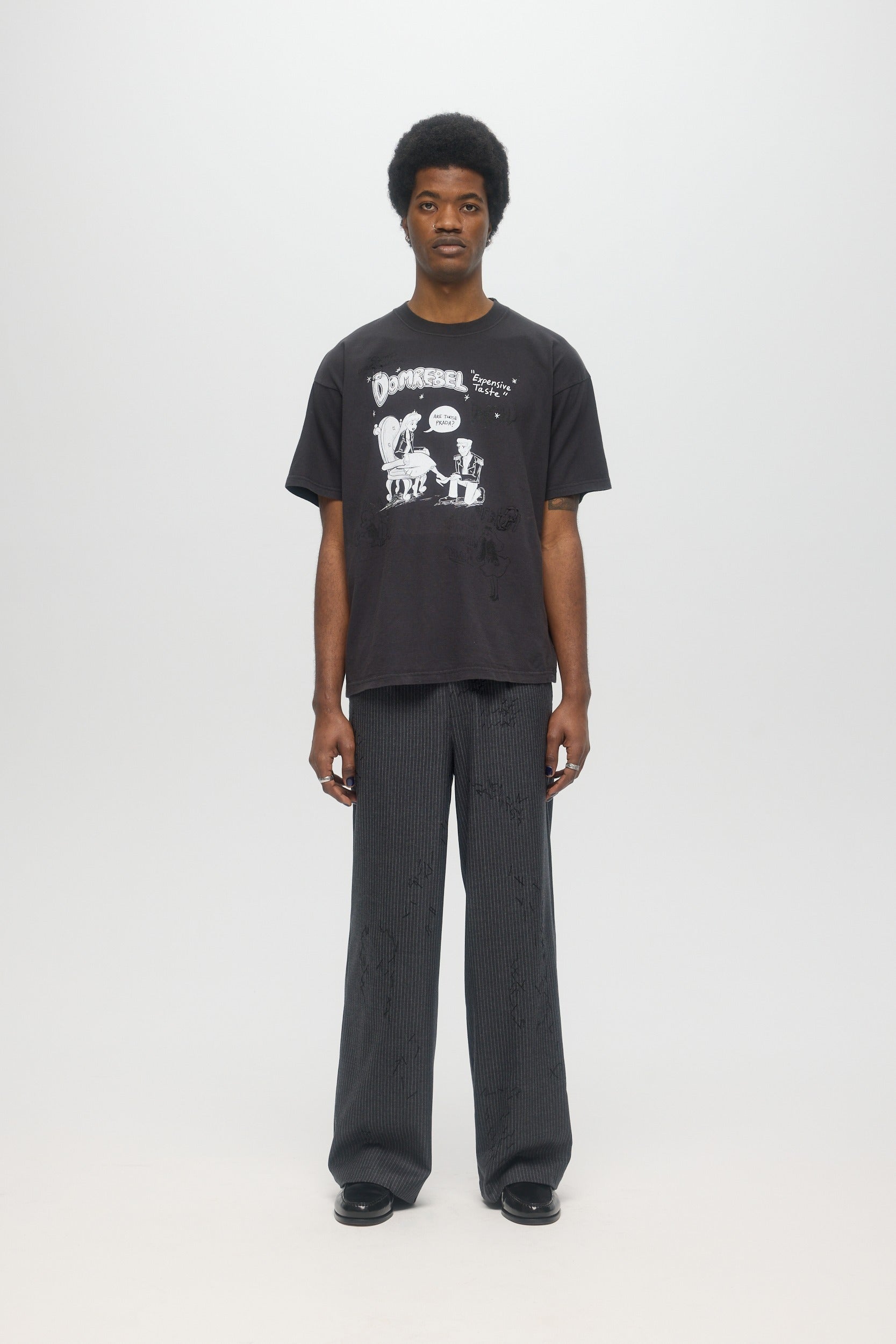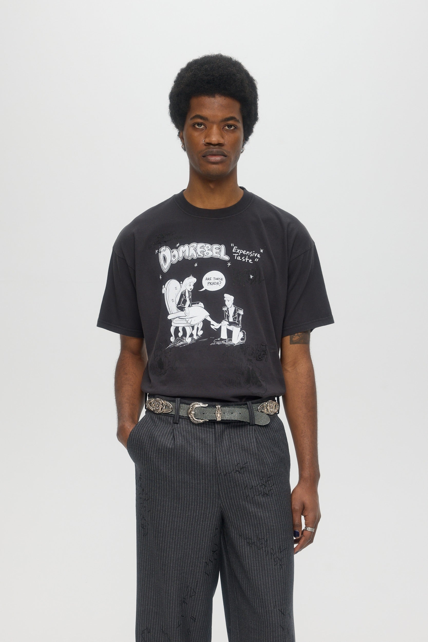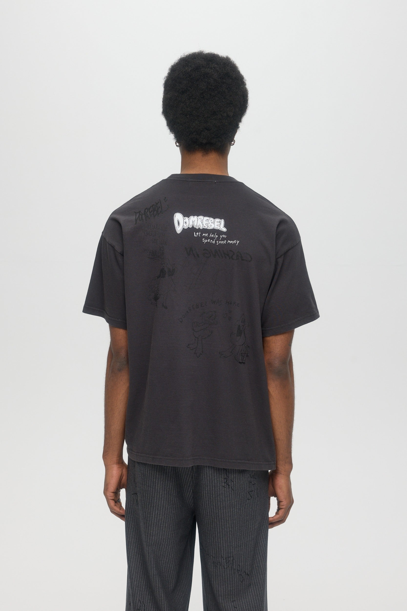 Our crowd-favorite t-shirt fit is made from custom cotton jersey, milled and constructed in Canada. Original DOMREBEL hand-drawn artworks screen-printed on front and back. We built this fit with a higher, cleaner rib neckline, and a very slight drop in the shoulder for the perfect fit. Fit is regular and true to size. Heavy vintage wash process.