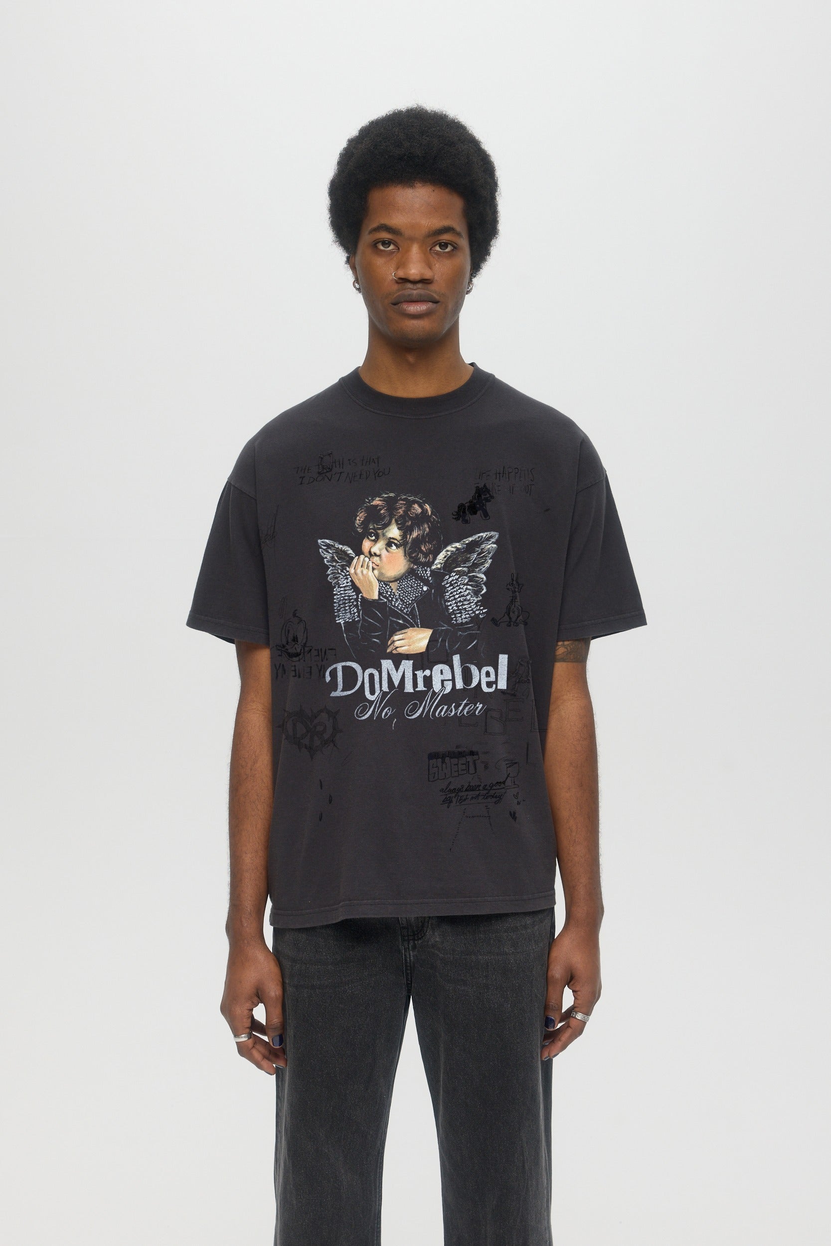 Our crowd-favorite t-shirt fit is made from custom cotton jersey, milled and constructed in Canada. Original DOMREBEL hand-drawn artworks screen-printed on front and back. We built this fit with a higher, cleaner rib neckline, and a very slight drop in the shoulder for the perfect fit. Fit is regular and true to size. Heavy vintage wash process.