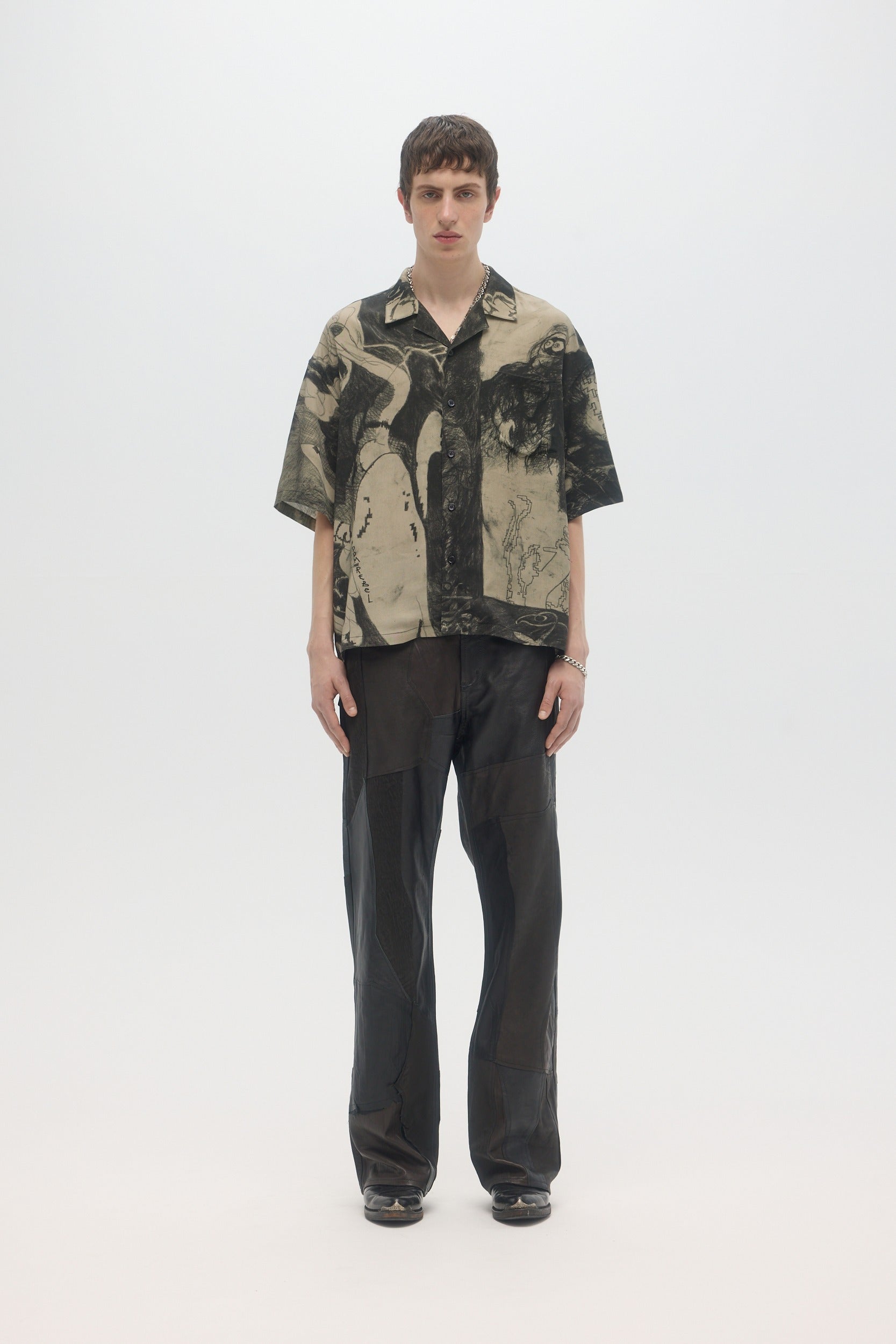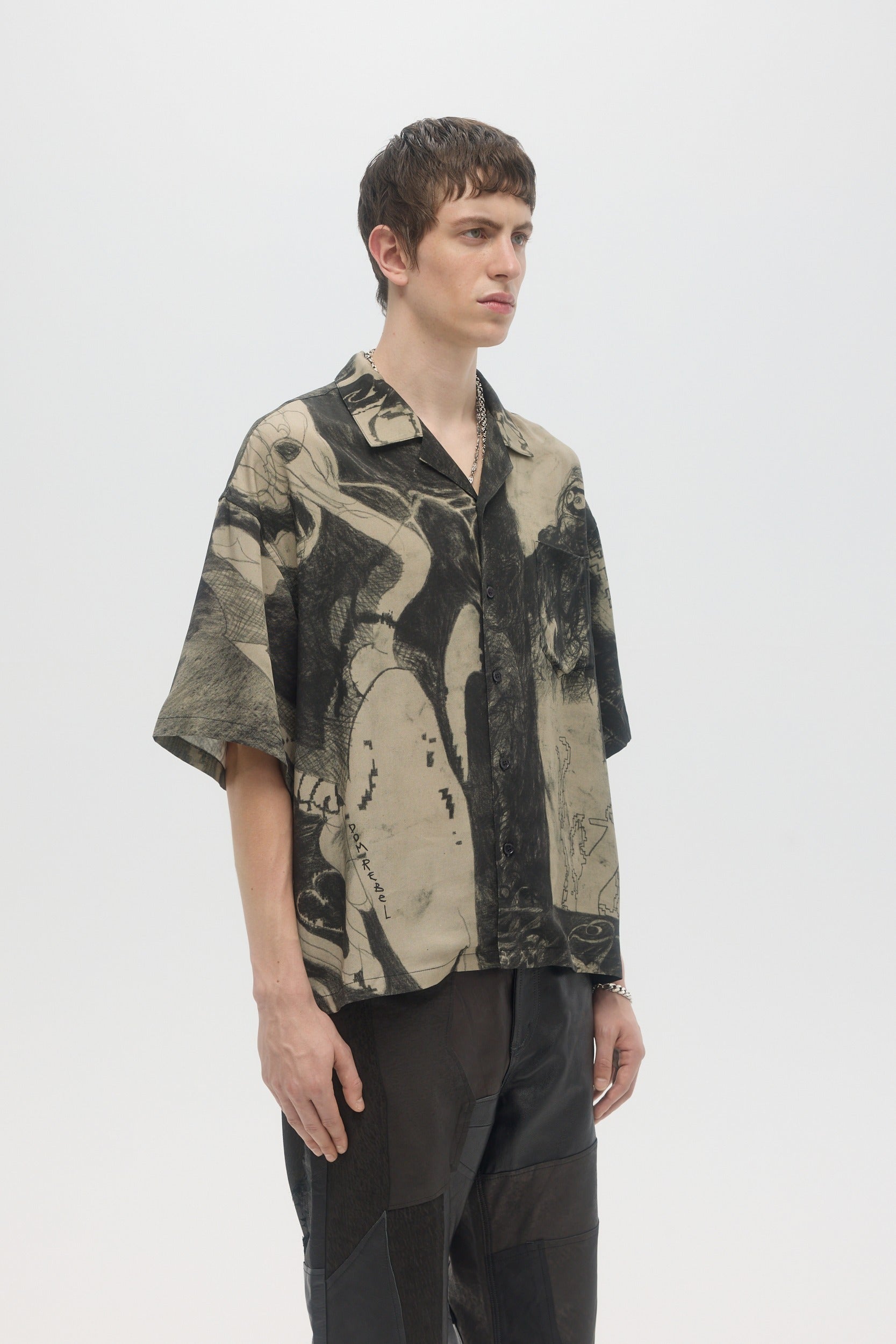 The Extrovert open spread camp collar shirt is printed with original DOMREBEL studio artworks, and made in a comfortable rayon tencel twill textile. Featuring mother-of-pearl buttons and an open spread collar, the fit is relaxed and timeless, with a slightly elongated arm and a boxy body. Fits regular and true to size.