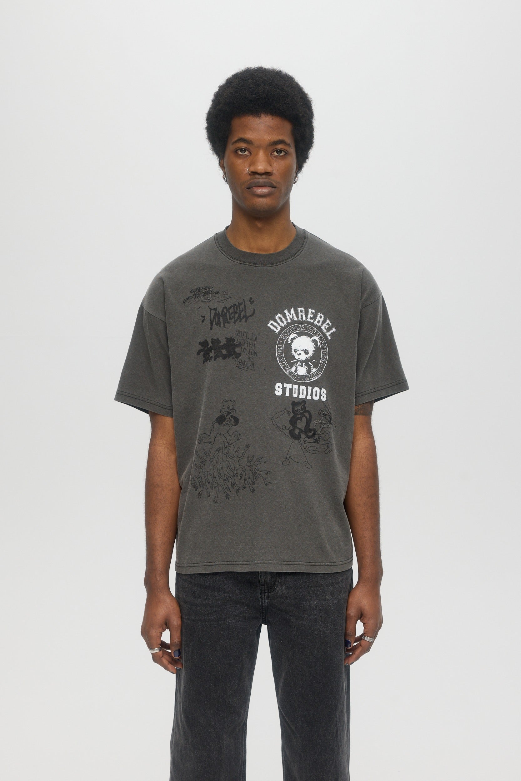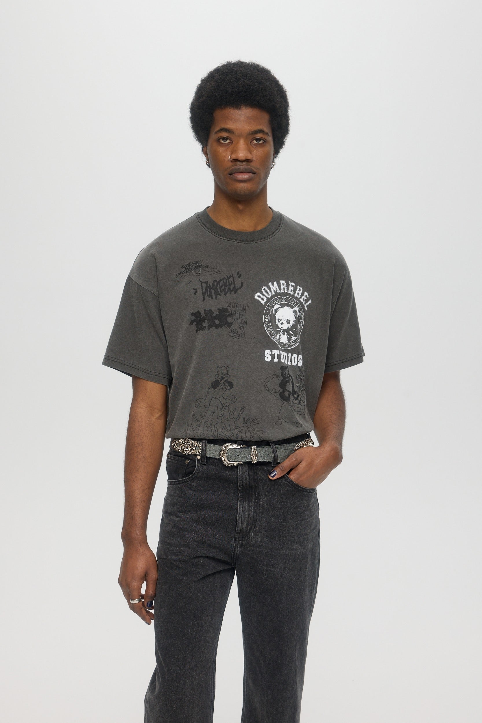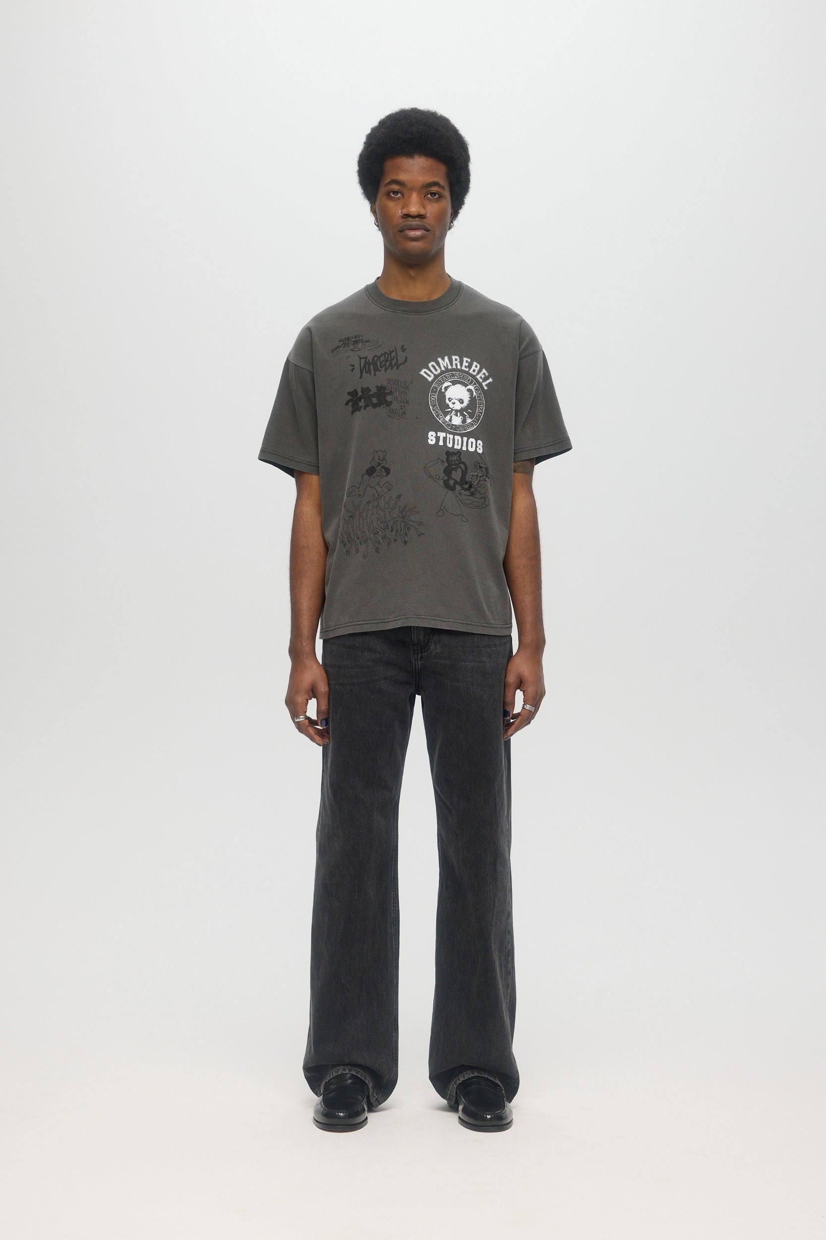Our crowd-favorite t-shirt fit is made from custom cotton jersey, milled and constructed in Canada. Original DOMREBEL hand-drawn artworks screen-printed on front and back. We built this fit with a higher, cleaner rib neckline, and a very slight drop in the shoulder for the perfect fit. Fit is regular and true to size. Heavy vintage wash process.