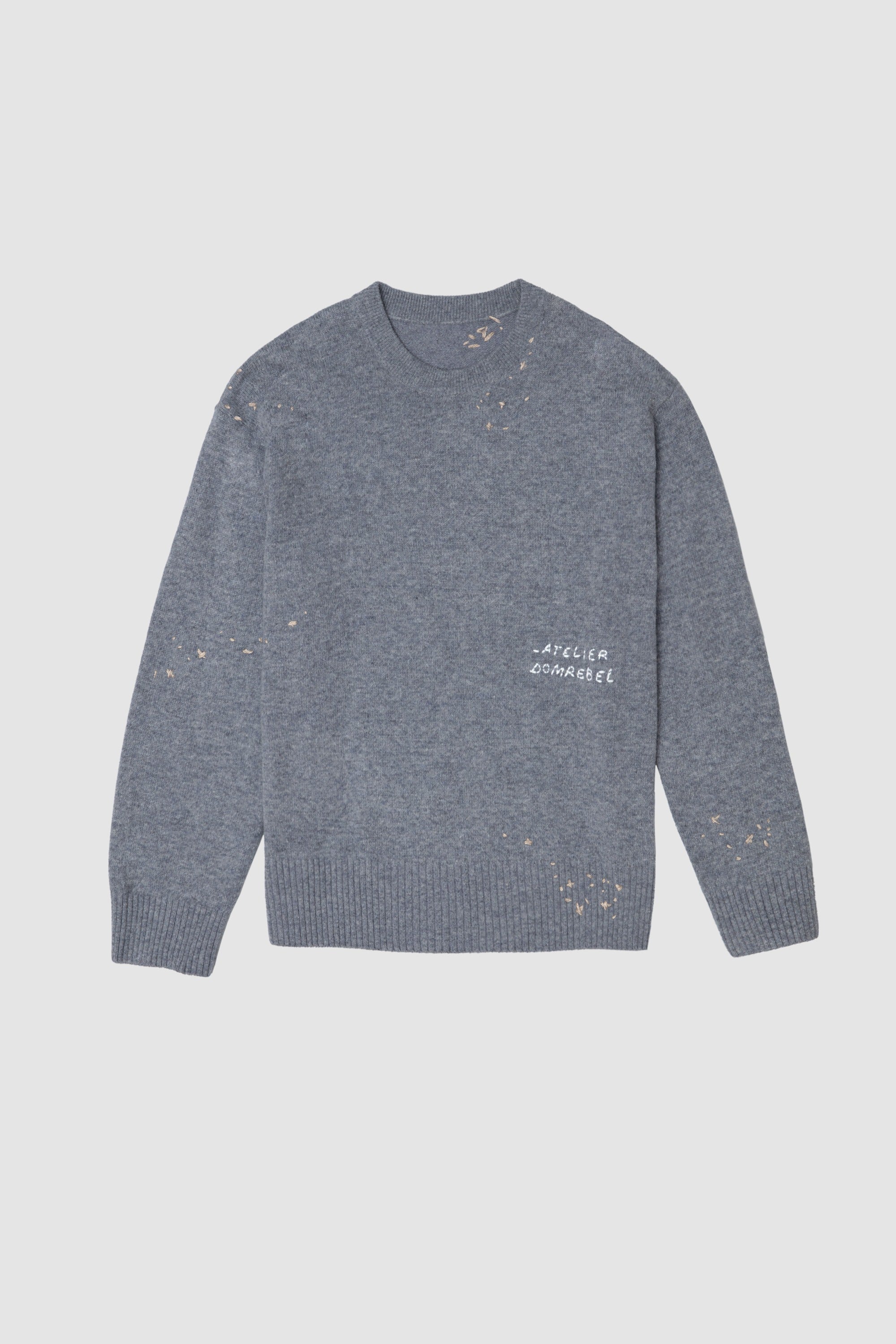 The Office knit crewneck is made from a comfortable 7-gauge wool-blend, the perfect weight for year-round versatility. Featuring hand-stitched crochet thread details throughout, and an "Atelier DOMREBEL" embroidery on front. Fits regular and true to size.