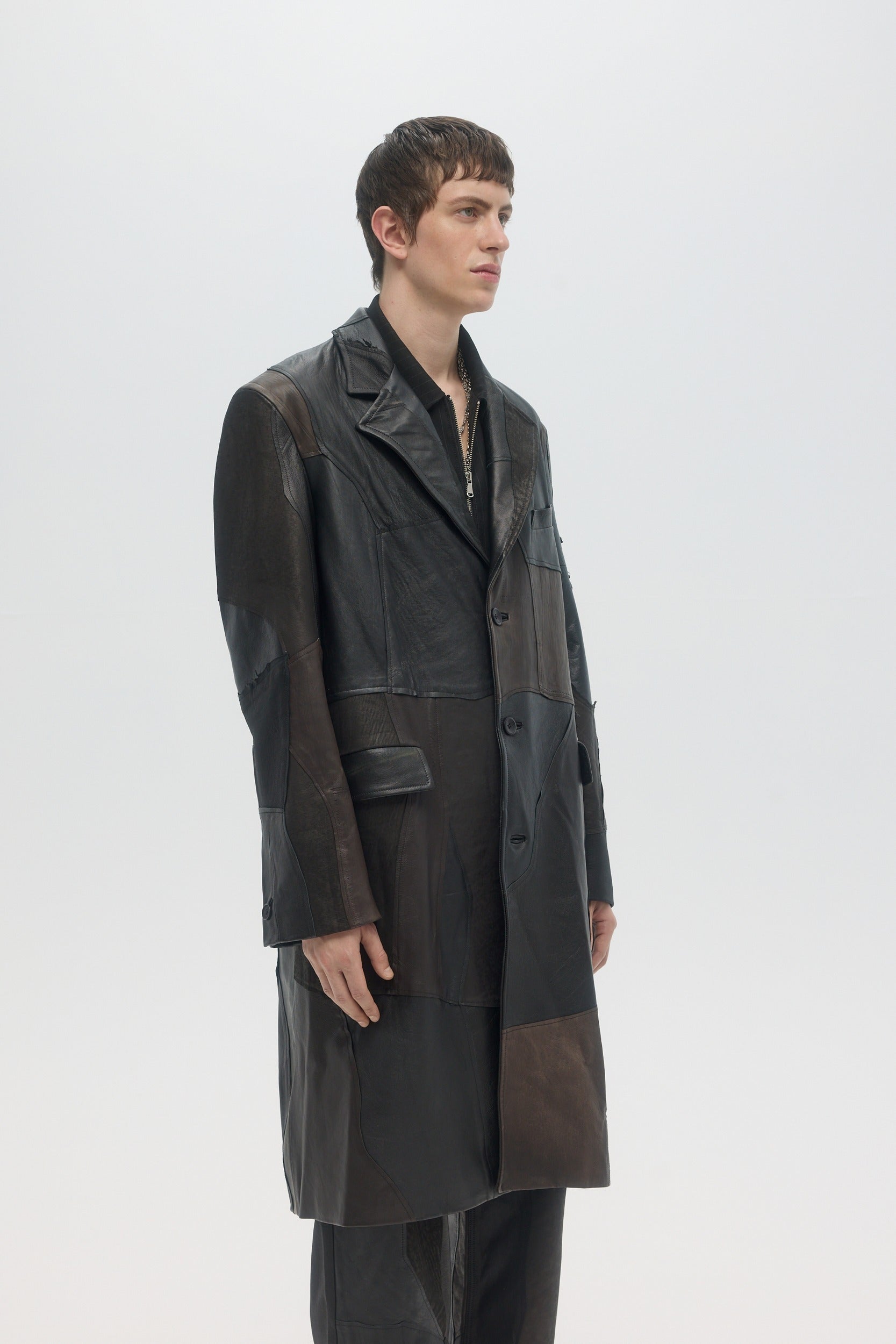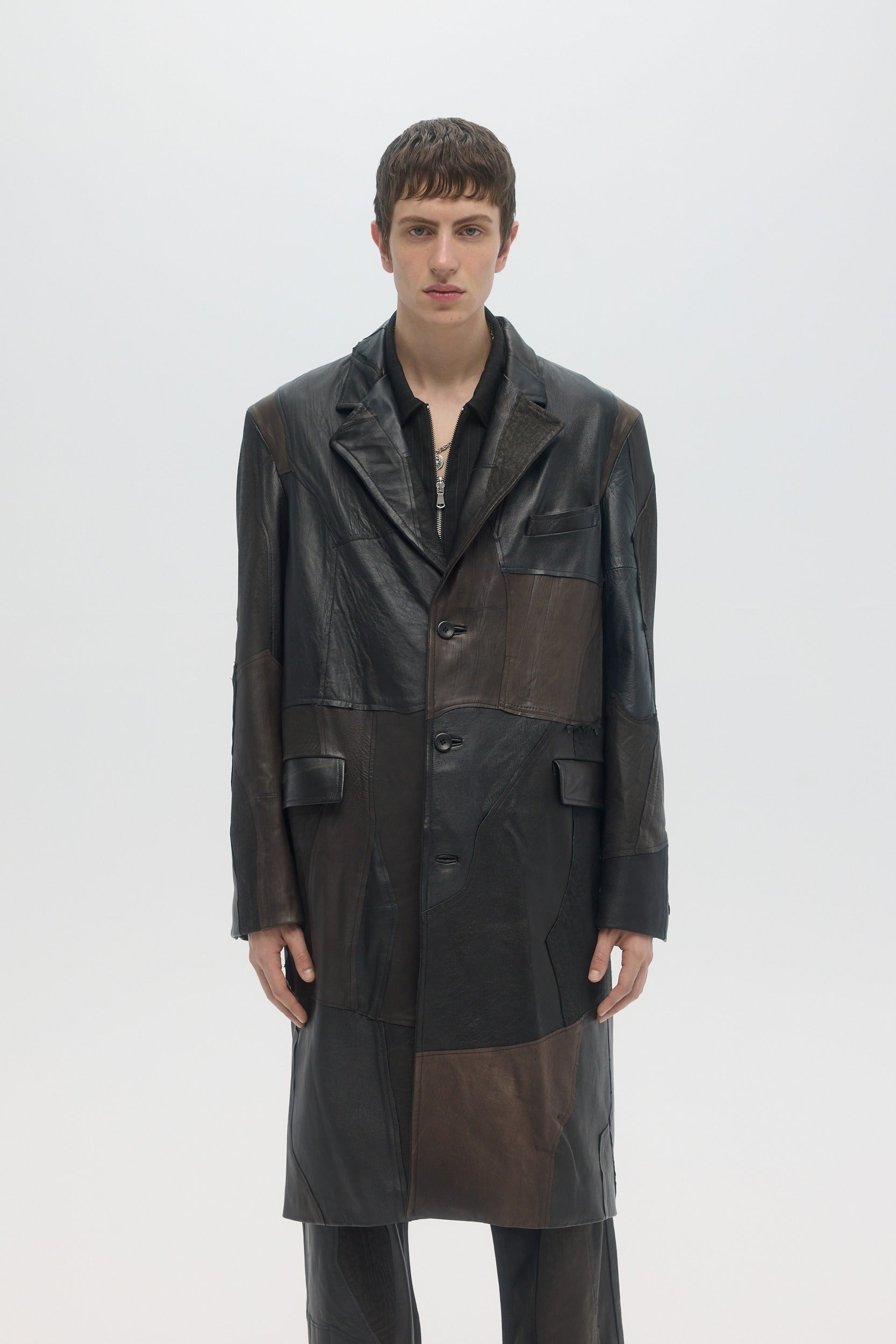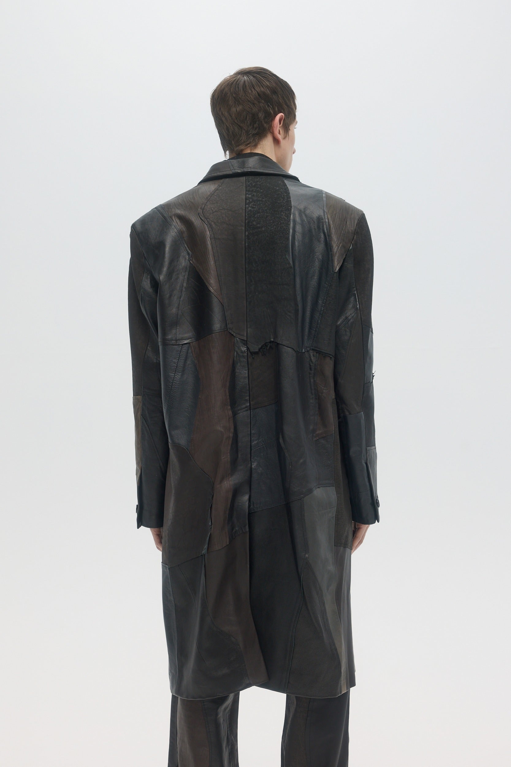 Handmade in Montréal, the Artisanal Clubseat Coat is made from upcycled deadstock and vintage leather pieces, sourced from pre-worn leather items, cut into raw-edge panels and hand-sewn throughout. The fully-lined coat has a tailored fit, with structured shoulders and a straight body. Horn buttons at the front and cuffs. This very limited edition piece is one of a kind, and all imperfections and details are hand-made and inherent to the artisanal process. Color shades of every leather piece vary throughout, embracing the natural patina that they inherited through previous wears.