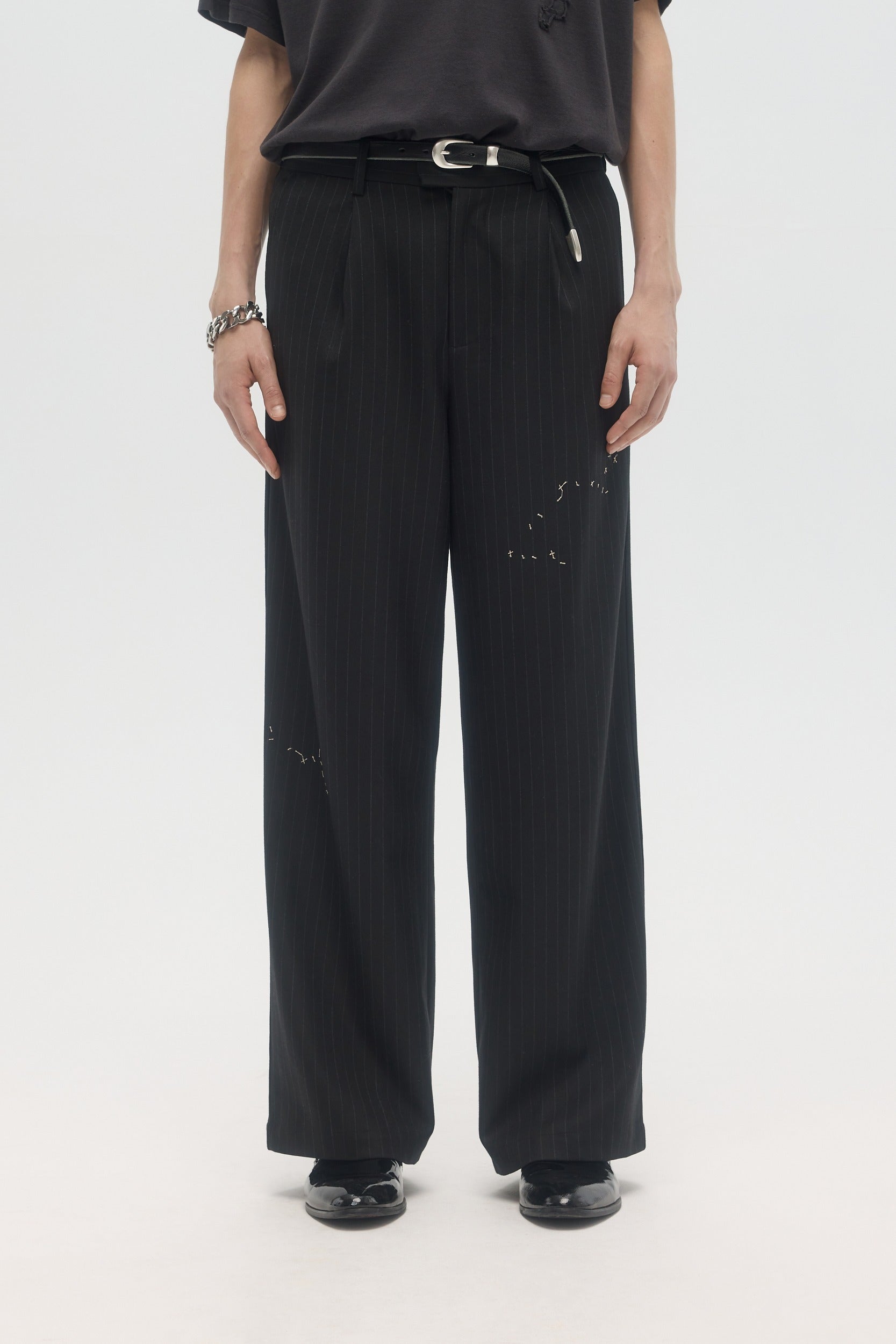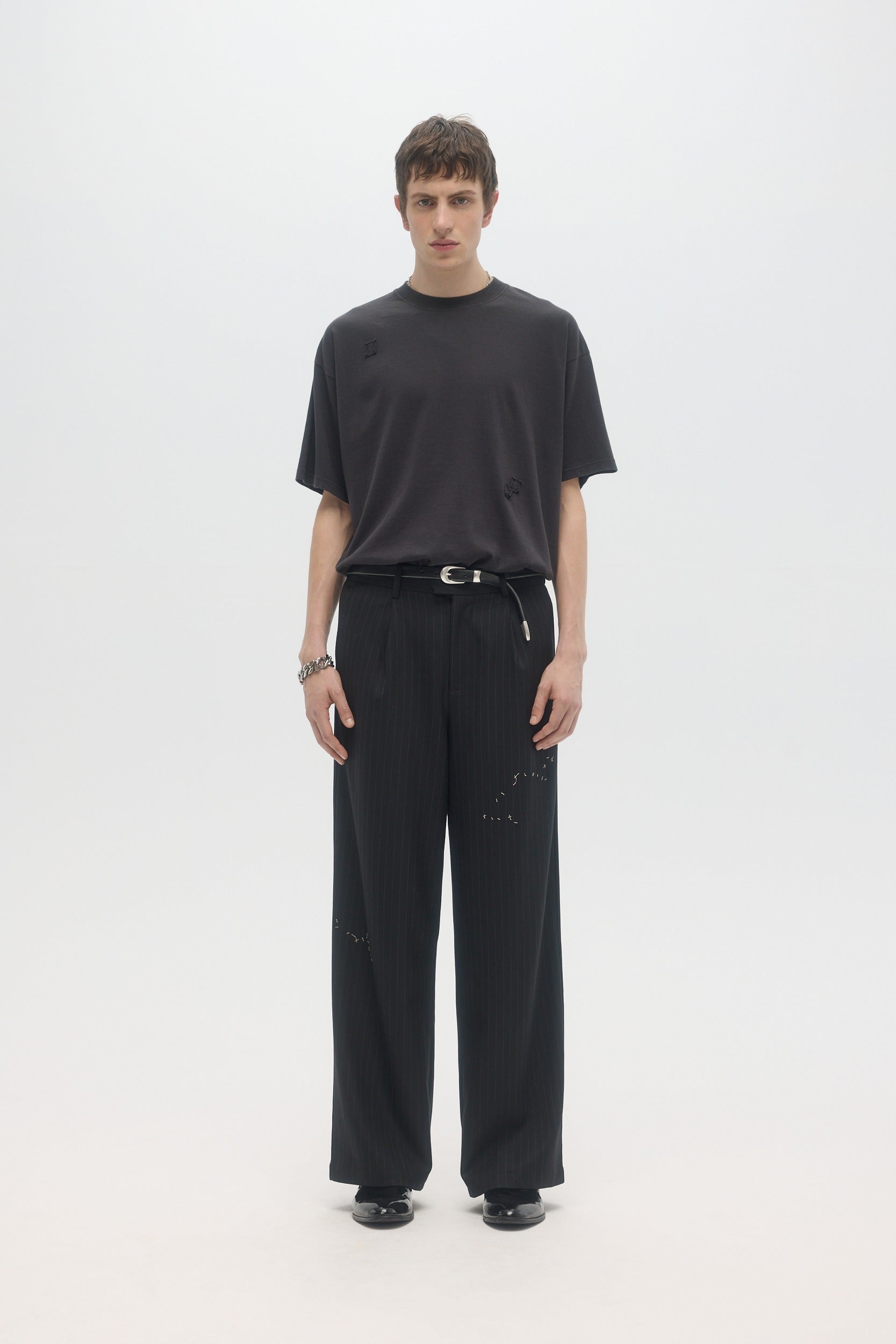 The Backstage trousers are made in a lightweight wool-blend pinstripe fabric that is great for year-round wearability. Featuring repair embroidery details throughout, the fit is regular in the upper and has a relaxed leg through the lower part of the pants. Elevate your look by pairing it with one of our leather jackets, or the matching Backstage jacket for a smart statement vibe.