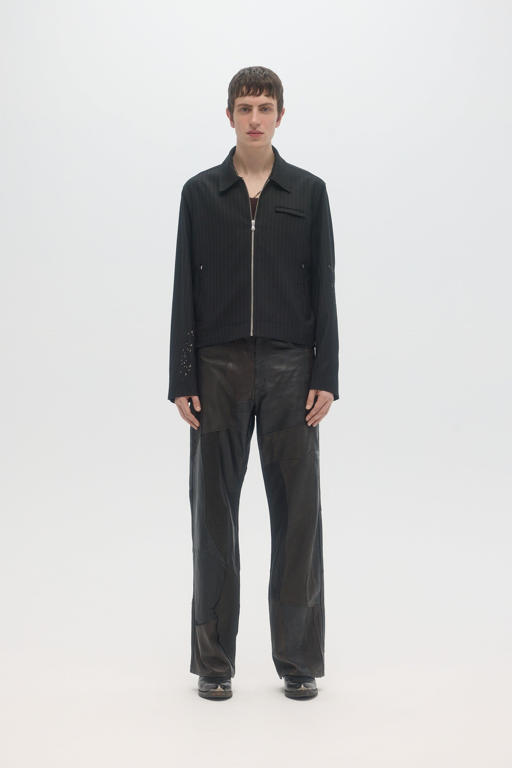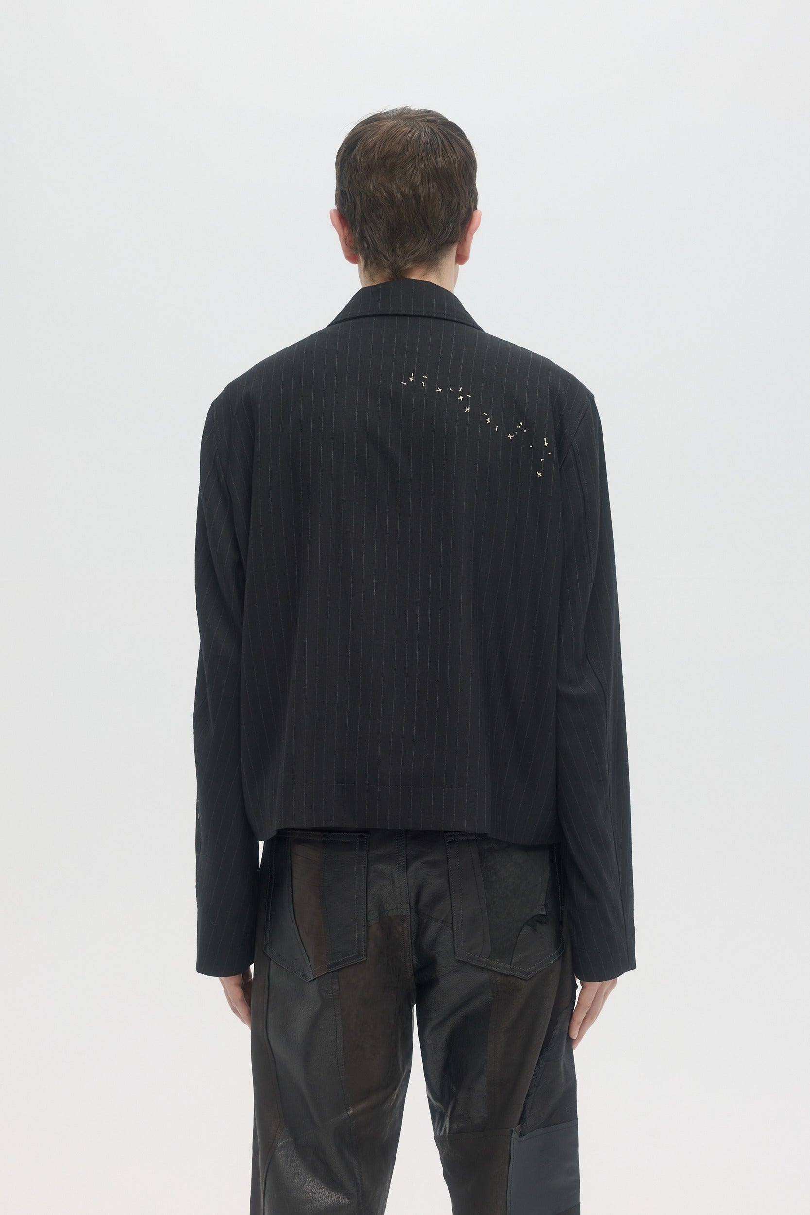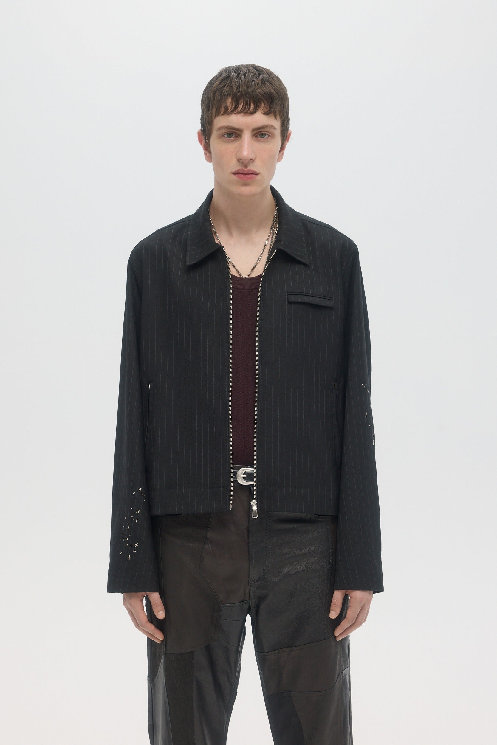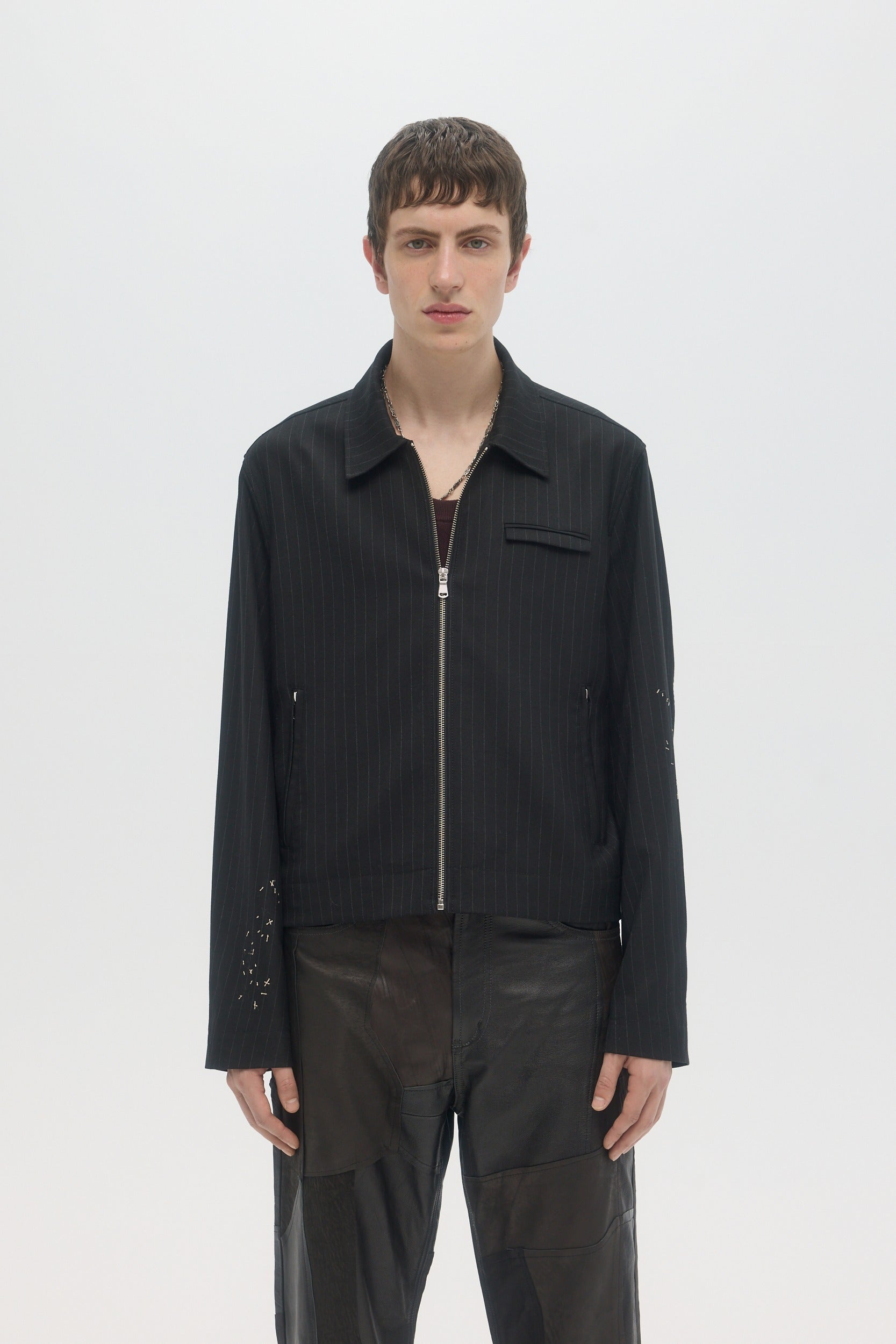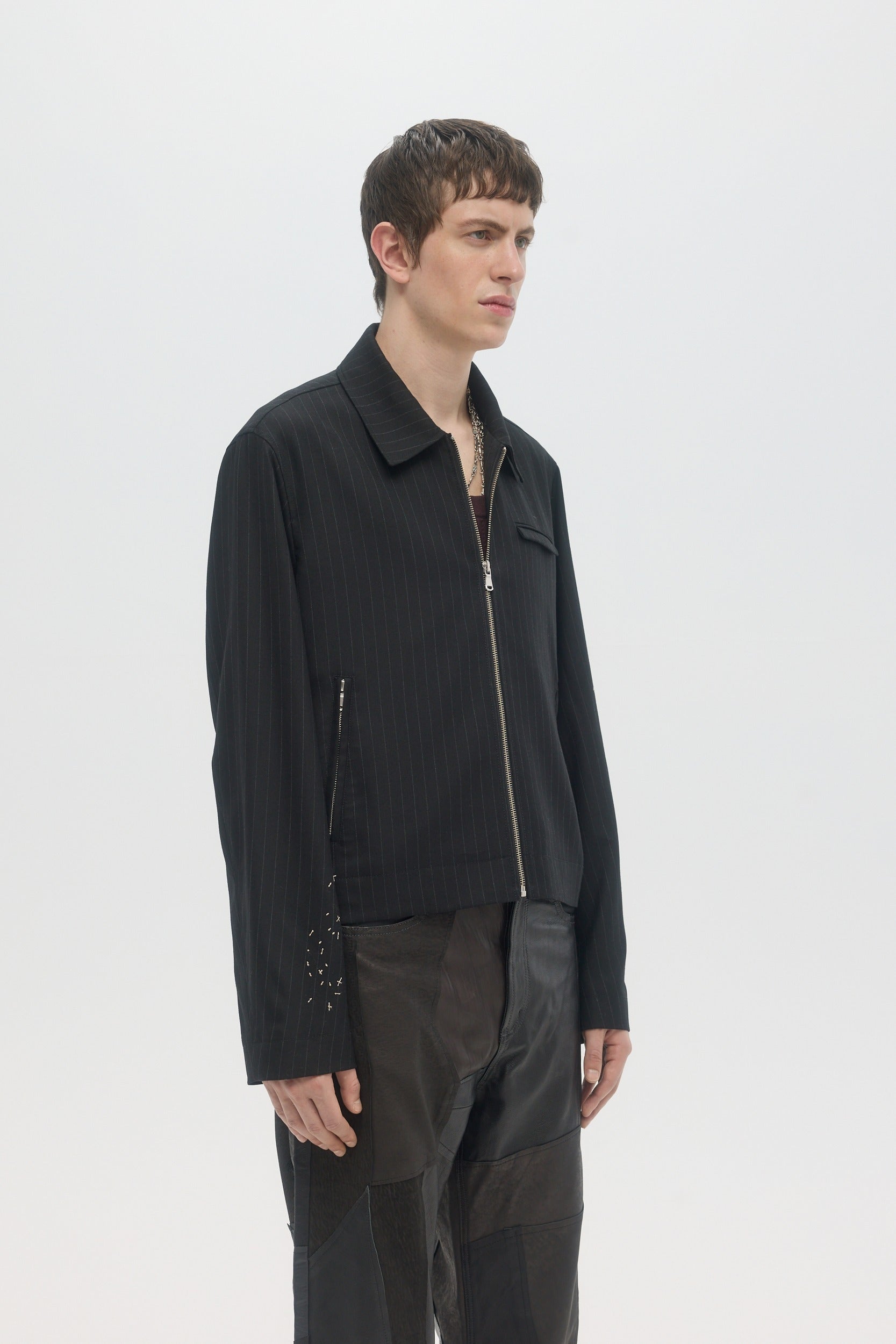 The Backstage jacket has a relaxed cropped fit, and is a new wardrobe staple at DOMREBEL. The zip front jacket features a spread collar, relaxed sleeves and a slightly boxy profile. Side zip pockets and chest zip pocket, with a concealed inner pocket. Constructed in a lightweight pinstripe wool blend textile, this versatile piece can be worn indoors and outdoors all year round. Fits true to size.