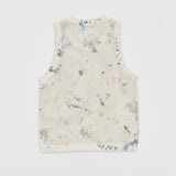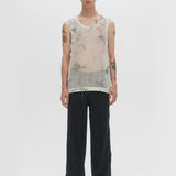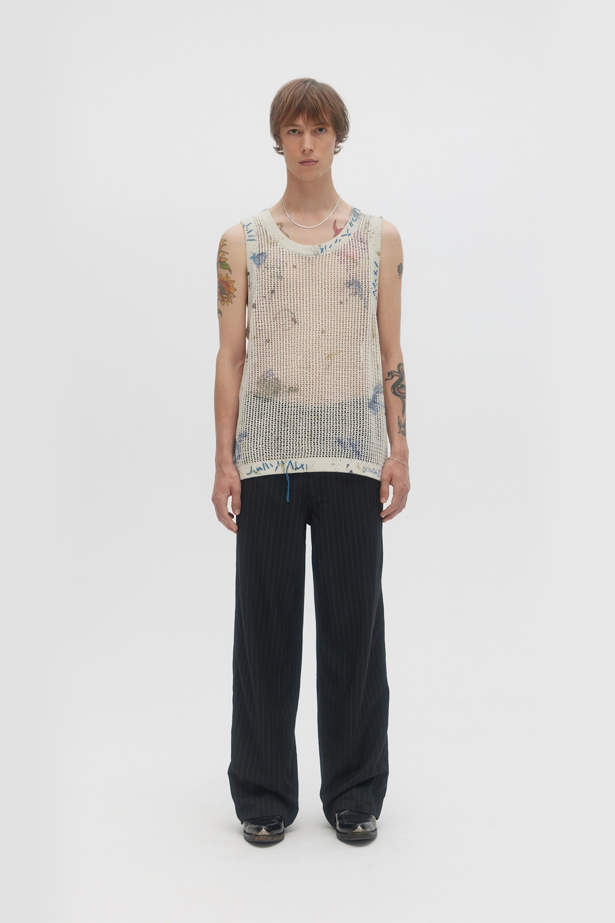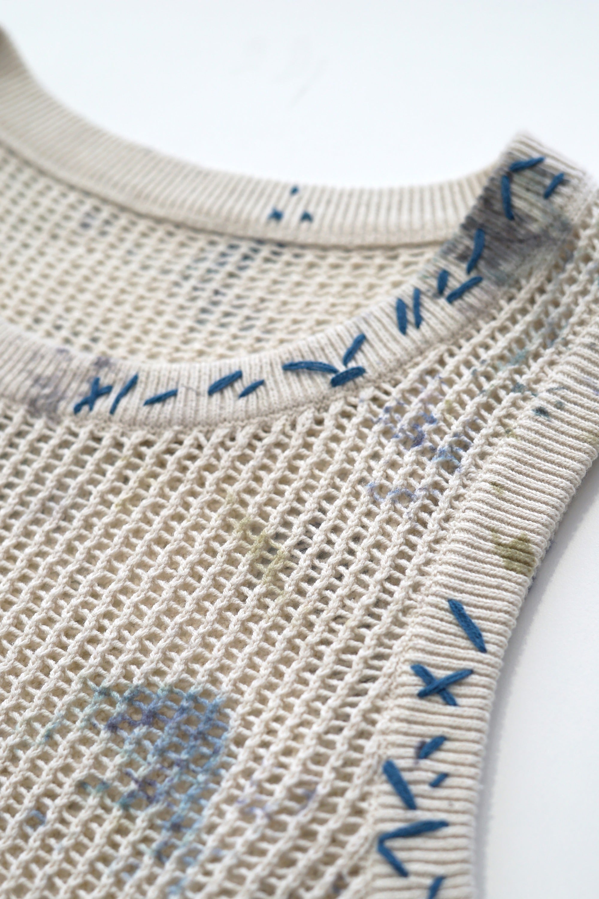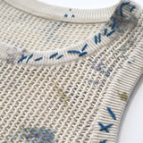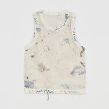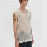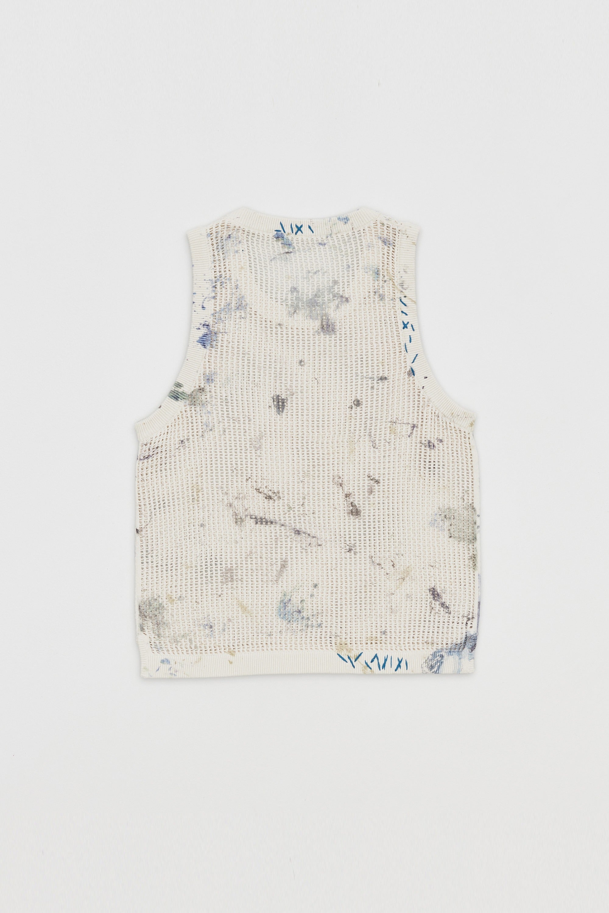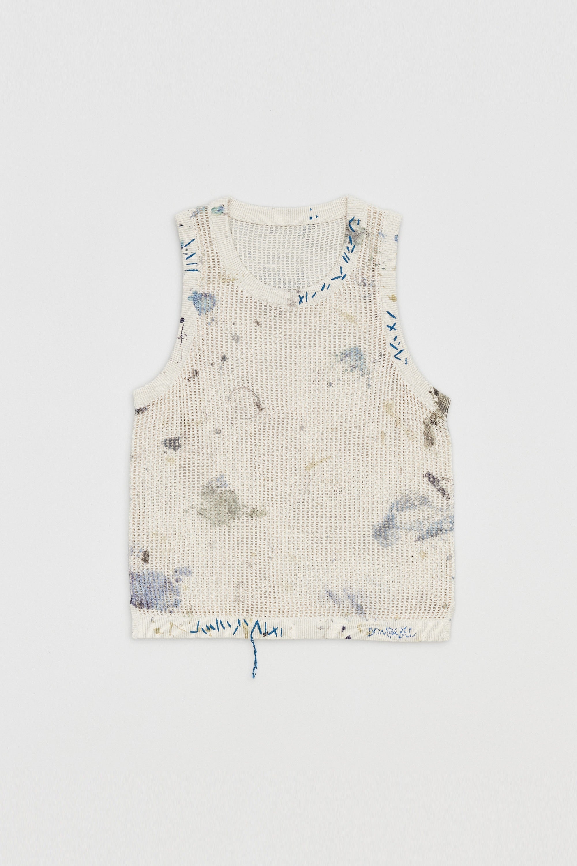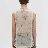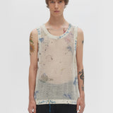 COTTON MESH KNIT TANK TOP FEATURING PAINT STAINS THROUGHOUT. EMBROIDERED DOMREBEL LOGO AT FRONT AND HAND-CROCHETED THREAD DETAILING THROUGHOUT. FIT IS RELAXED AND SLIGHTLY OVERSIZED.
