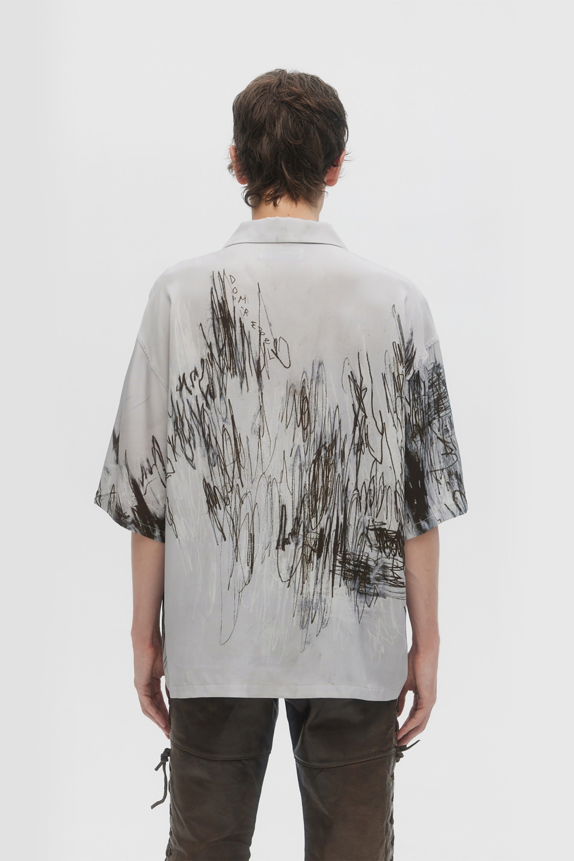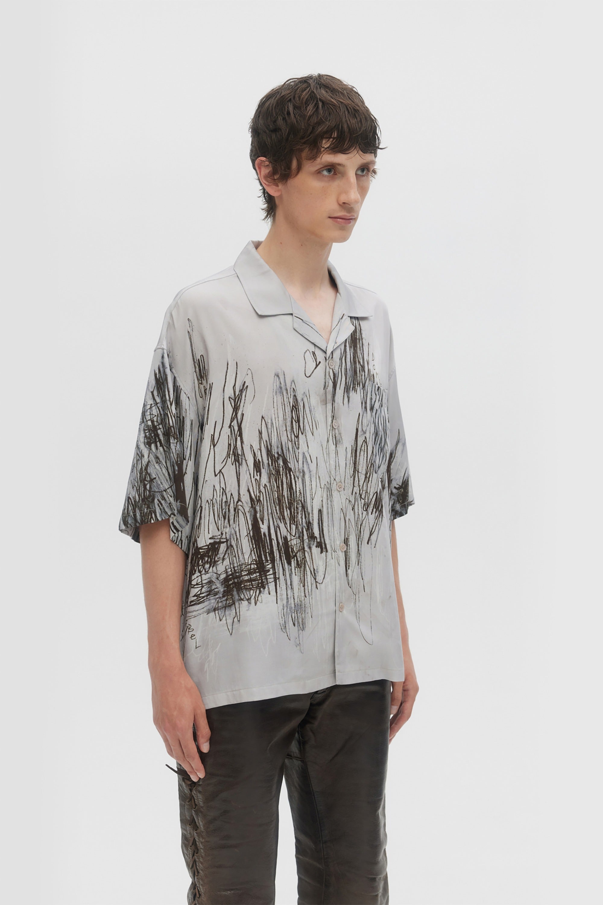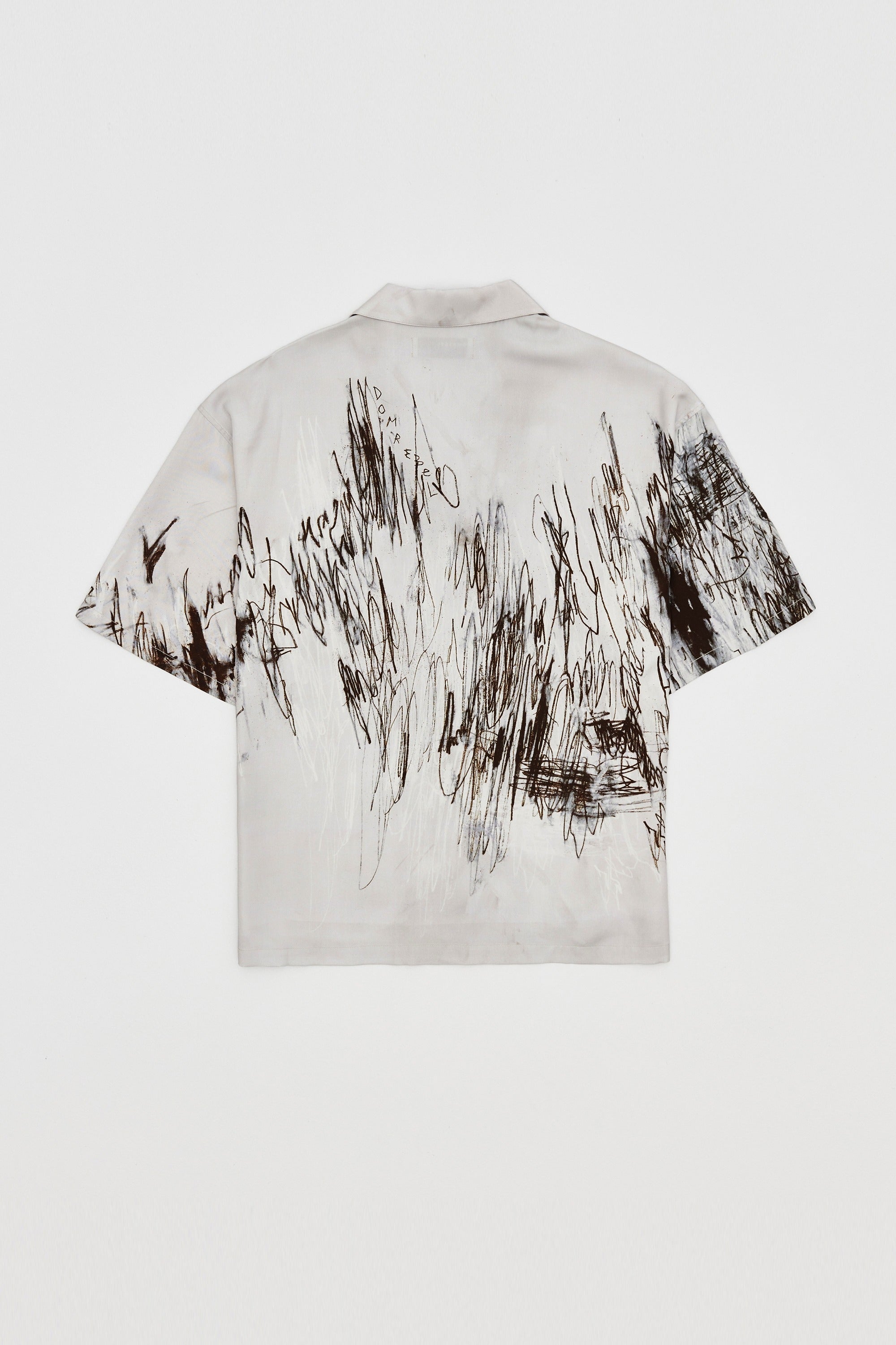 SHORT-SLEEVE BUTTON SHIRT WITH SPREAD CAMP COLLAR, FEATURING PRINTED ARTWORKS OF SKETCHES FROM OUR STUDIO NOTEBOOKS. PRINTED ON A SOFT TWILL FABRIC. DETAILED WITH MOTHER OF PEARL BUTTONS. RELAXED FIT AND TRUE TO SIZE.