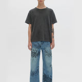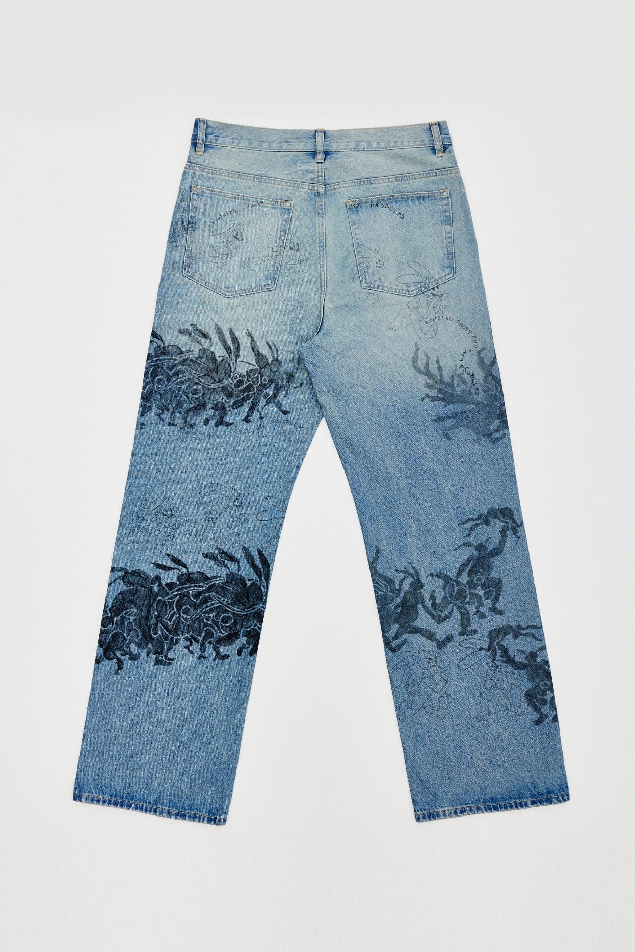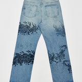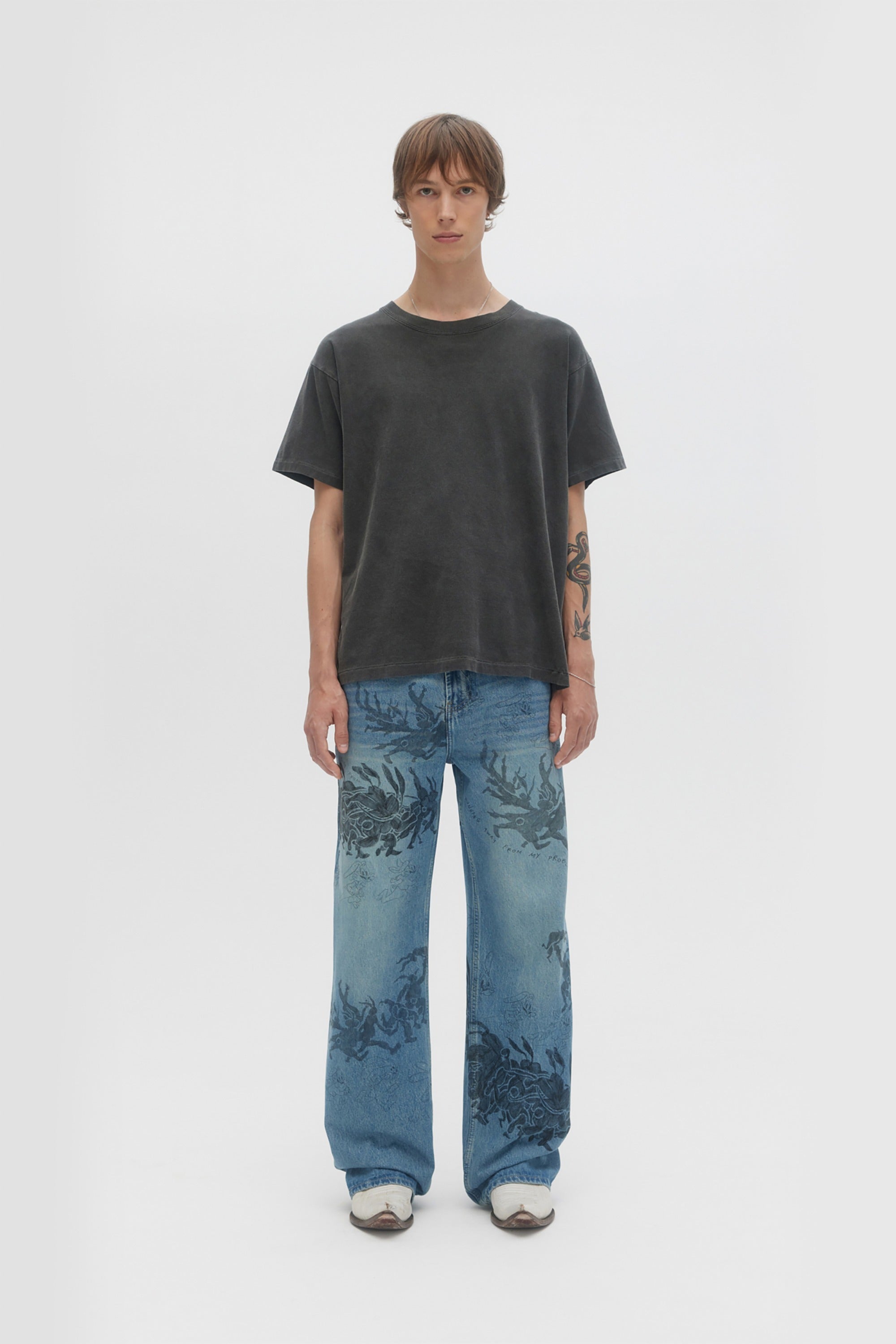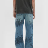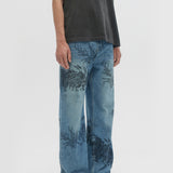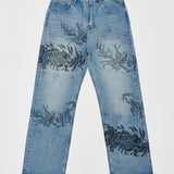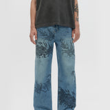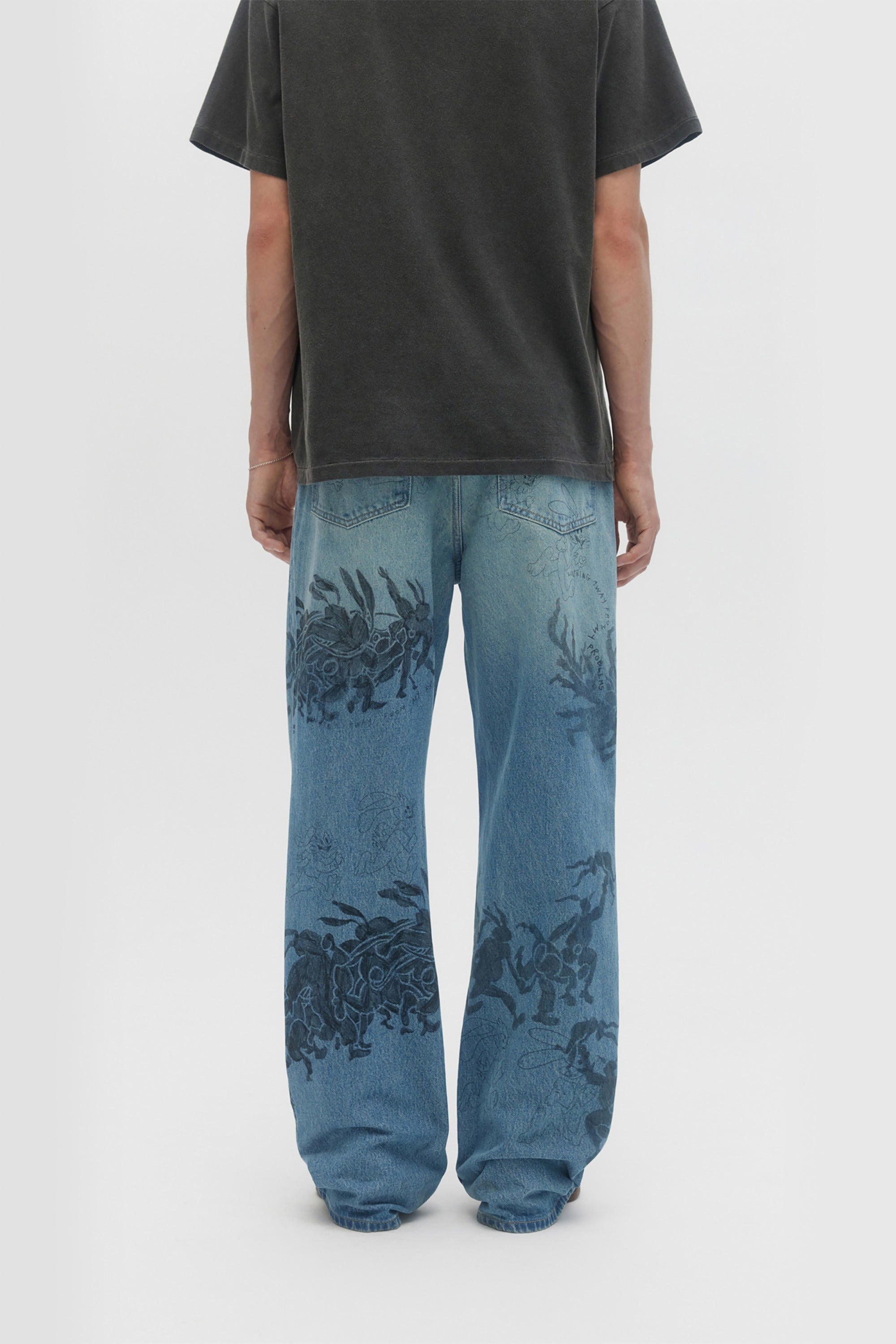 RELAXED-FIT BOOTCUT JEANS IN NON-STRETCH DENIM ARE DECORATED THROUGHOUT WITH ORIGINAL STUDIO ARTWORKS AND DRAWINGS. ZIP FLY AND 5 POCKET CONSTRUCTION. FIT IS RELAXED AND TRUE TO SIZE.