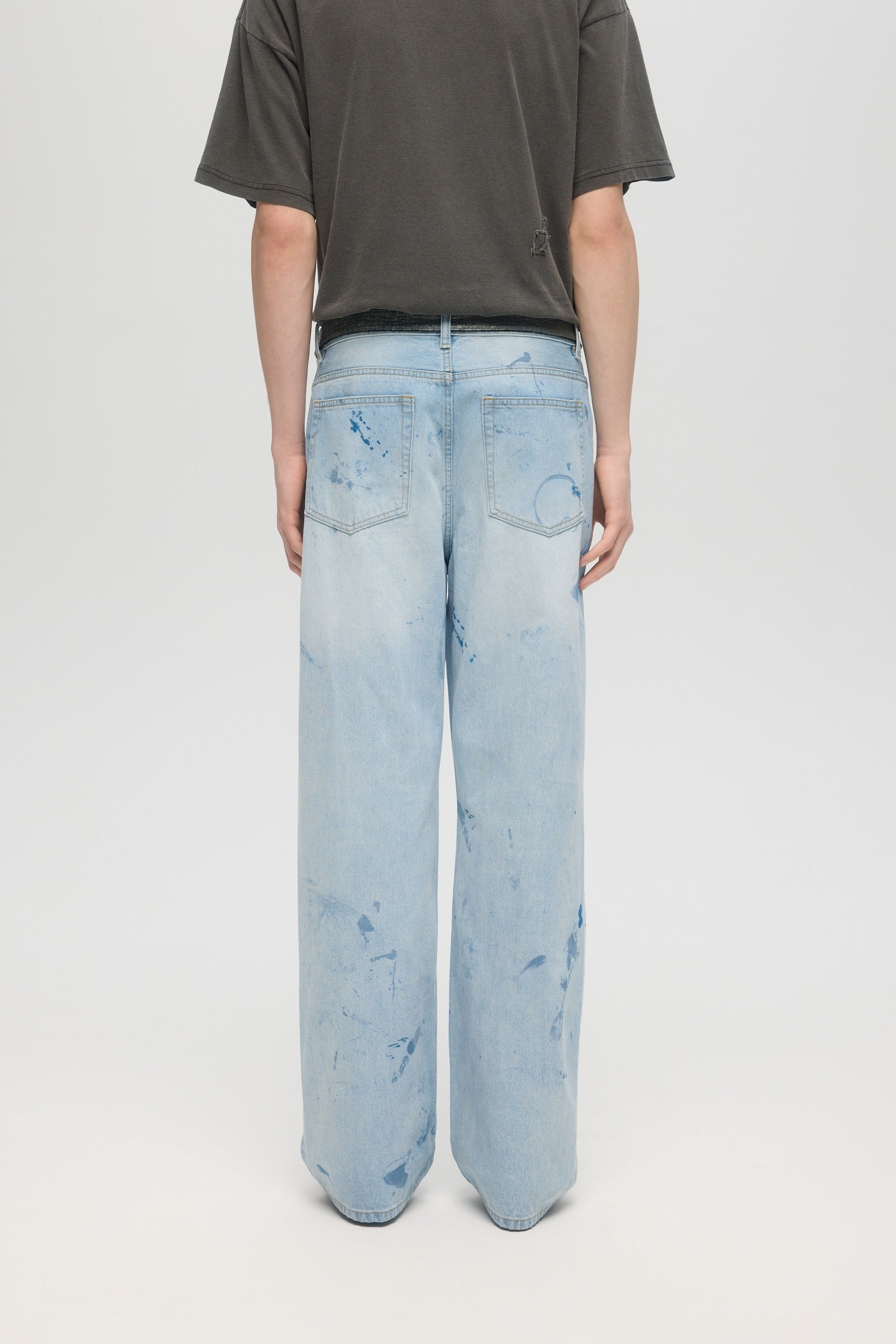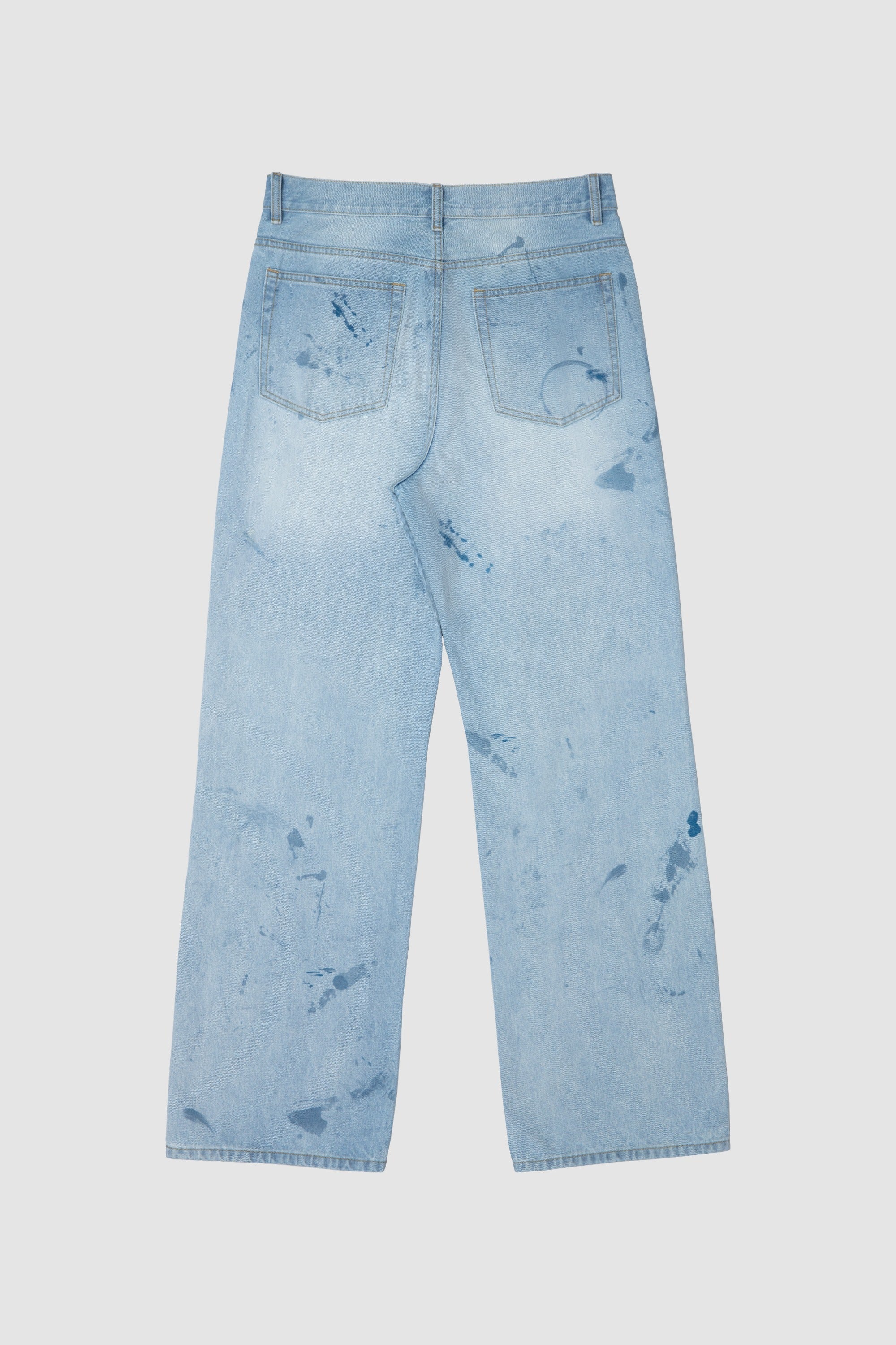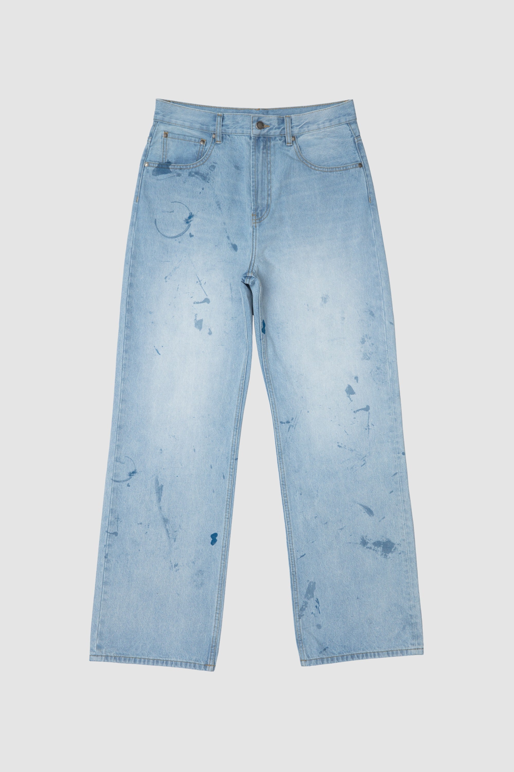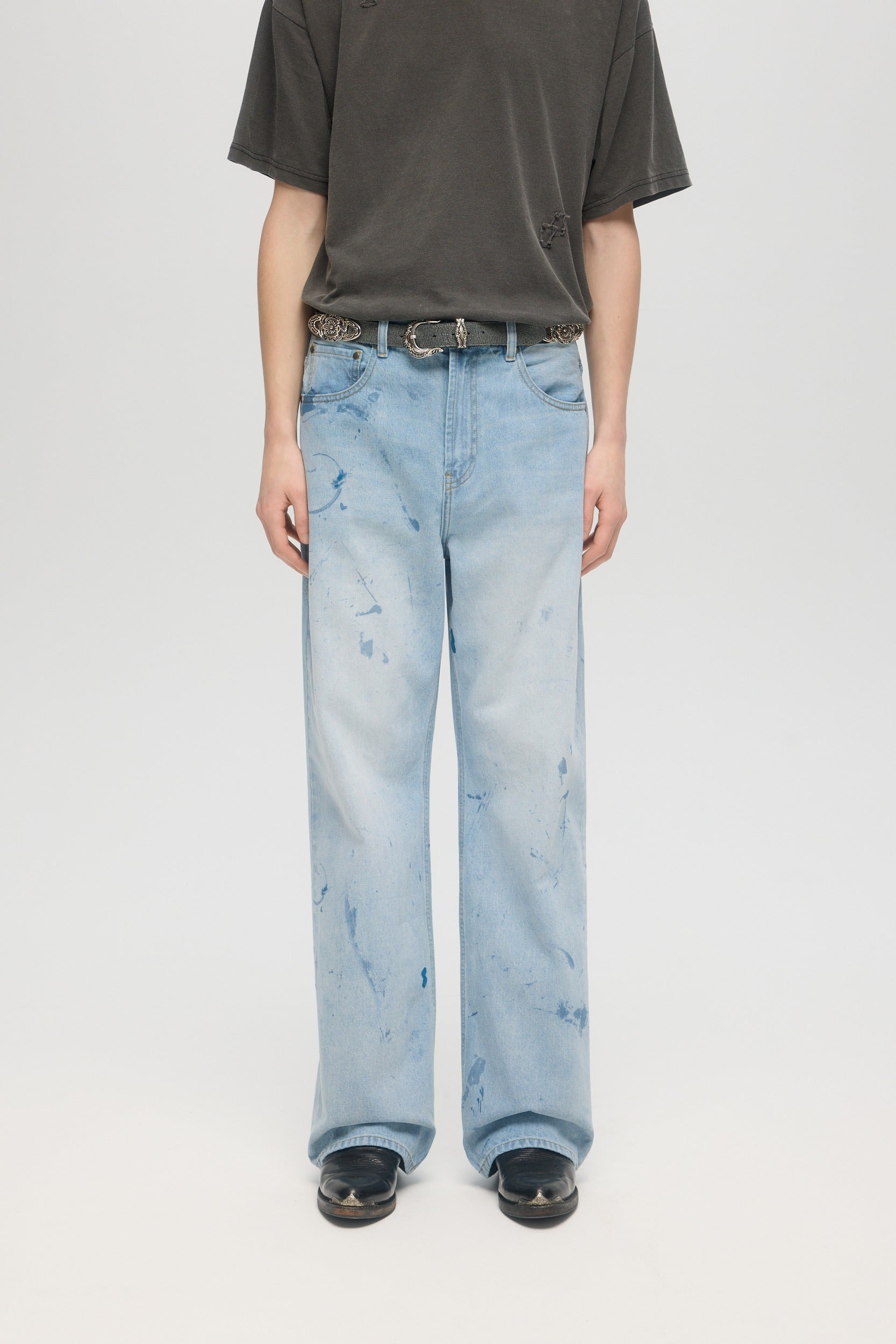 The Scuff bootcut jeans are made from 100% cotton mid-weight denim, with studio paint splatters printed throughout. Fit is relaxed, with a mid-rise and a very slight bootcut opening at the bottom of the jeans. Zip fly and 5-pocket construction. Fits true to size.