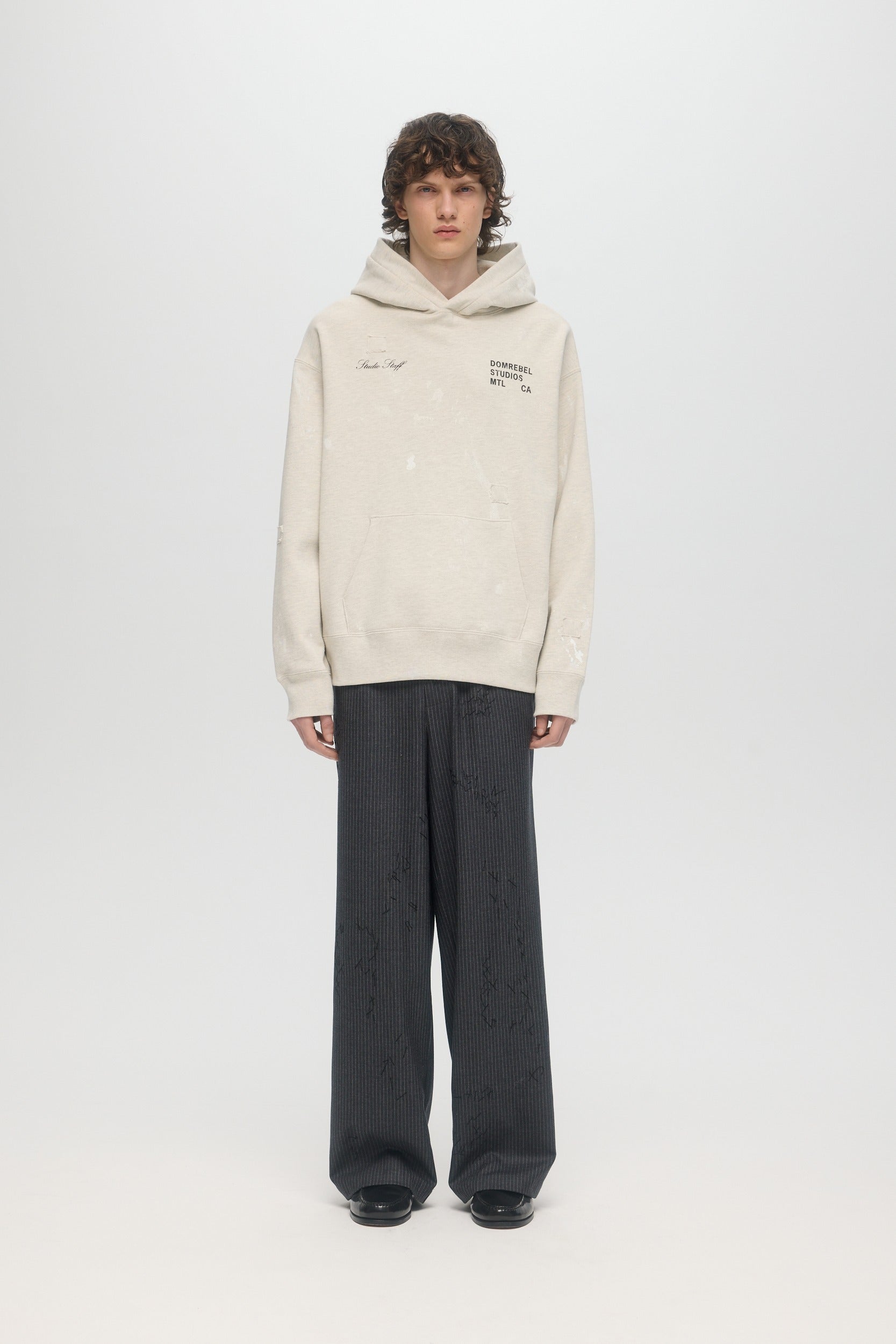 The Staff pullover hoodie is made from custom cotton loop-back french terry, milled and constructed in Canada. Paint stains are screen-printed throughout, with DOMREBEL logo print on chest and "Studio Staff" print on opposite side. Fit is regular and true to size.