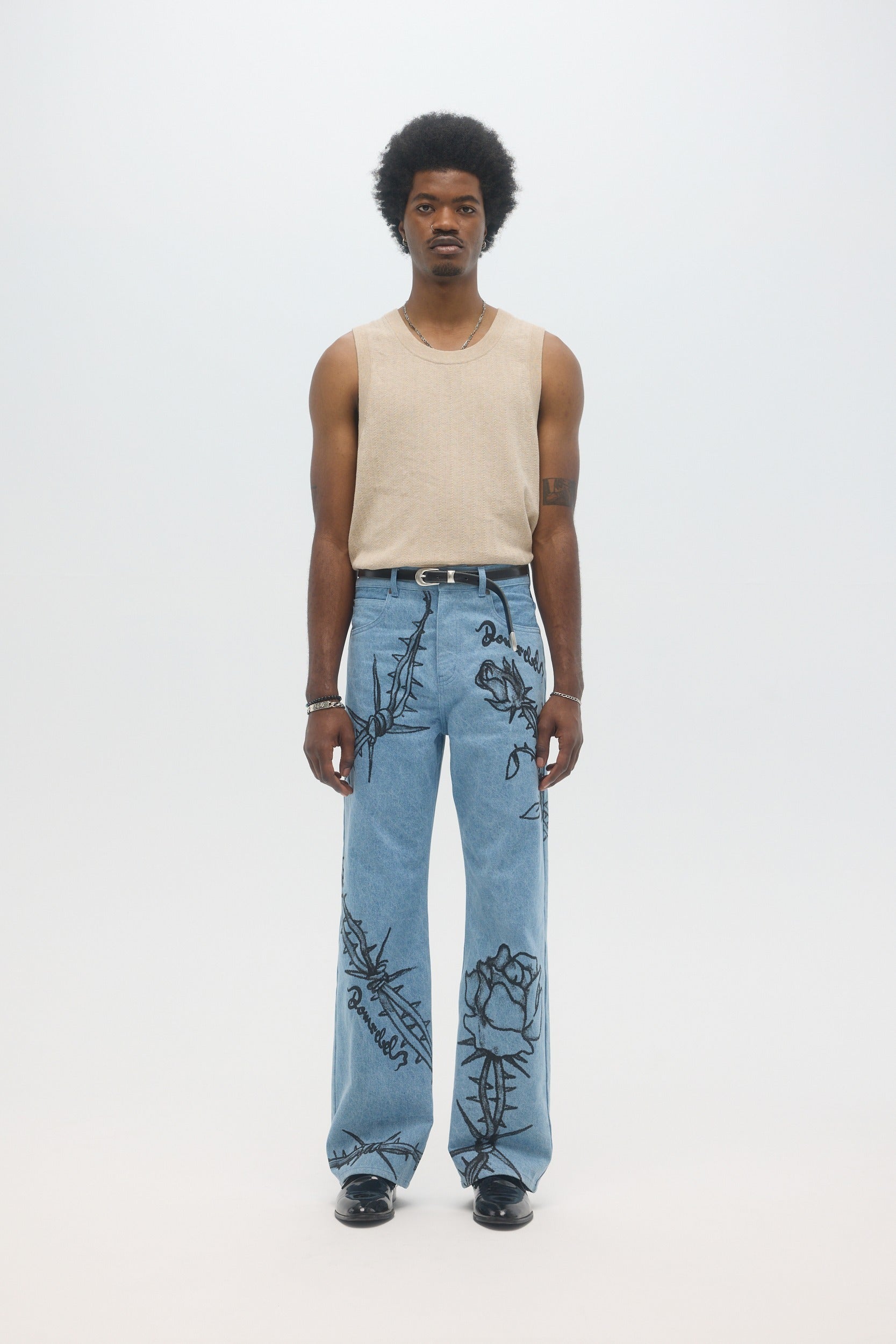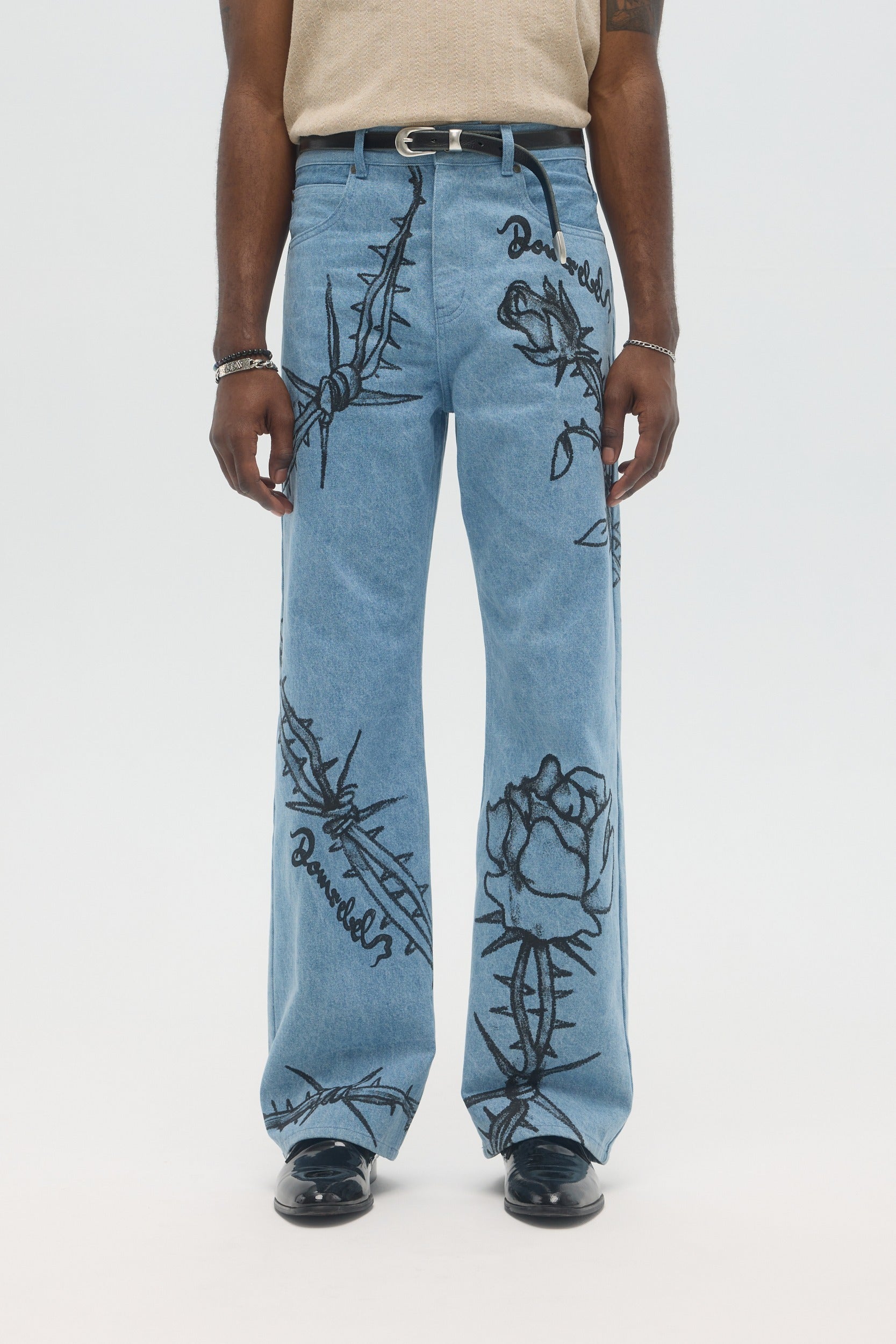 The Inked bootcut jeans are made from 100% cotton mid-weight denim, with DOMREBEL studio drawings printed throughout. Cut in a pre-laundered denim fabric, the fit is relaxed, with a mid-rise and a very slight bootcut opening at the bottom of the jeans. Zip fly and 5 pocket construction. Fits true to size. Pairs well with the Inked jean jacket.