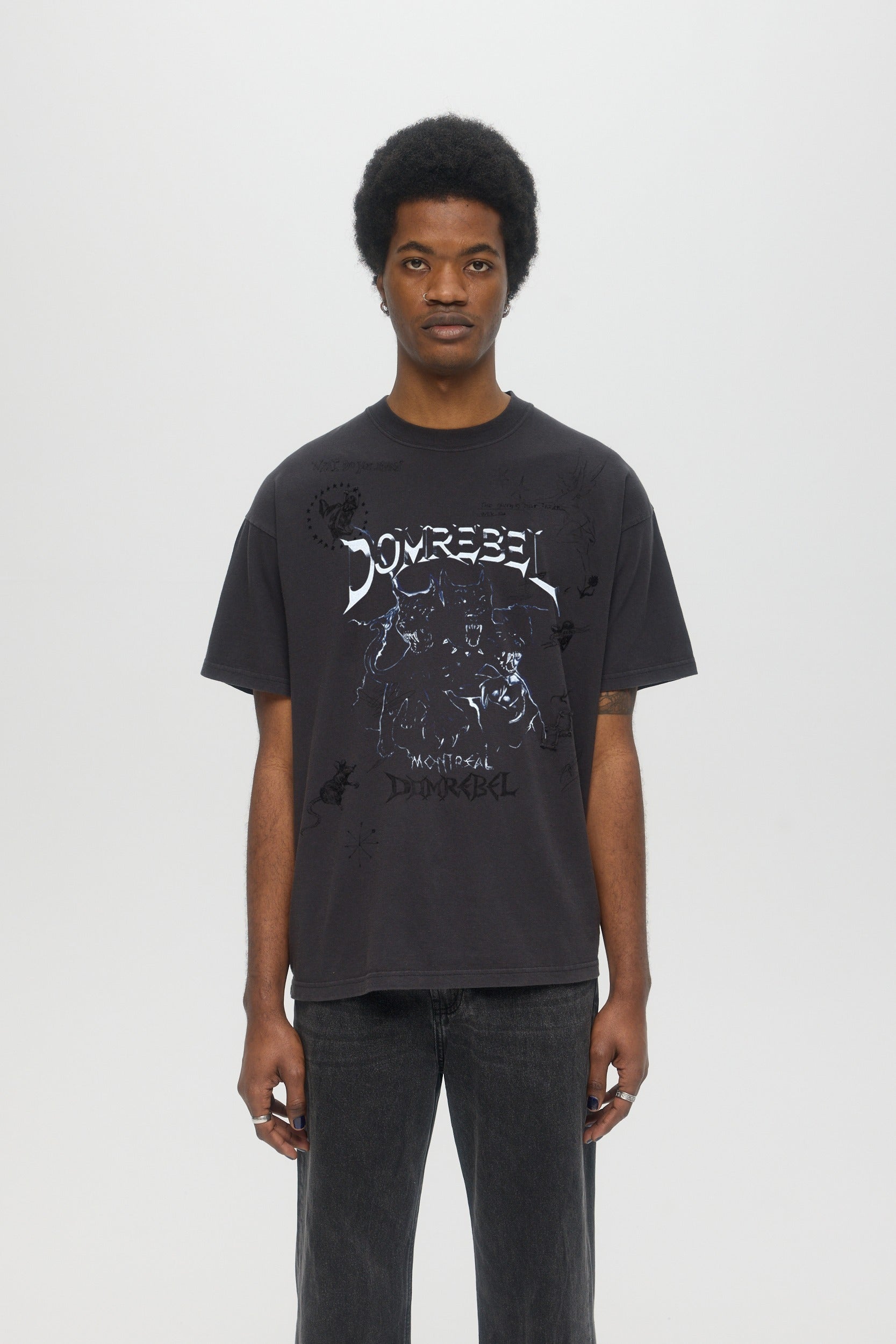 Our crowd-favorite t-shirt fit is made from custom cotton jersey, milled and constructed in Canada. Original DOMREBEL hand-drawn artworks screen-printed on front and back. We built this fit with a higher, cleaner rib neckline, and a very slight drop in the shoulder for the perfect fit. Fit is regular and true to size.