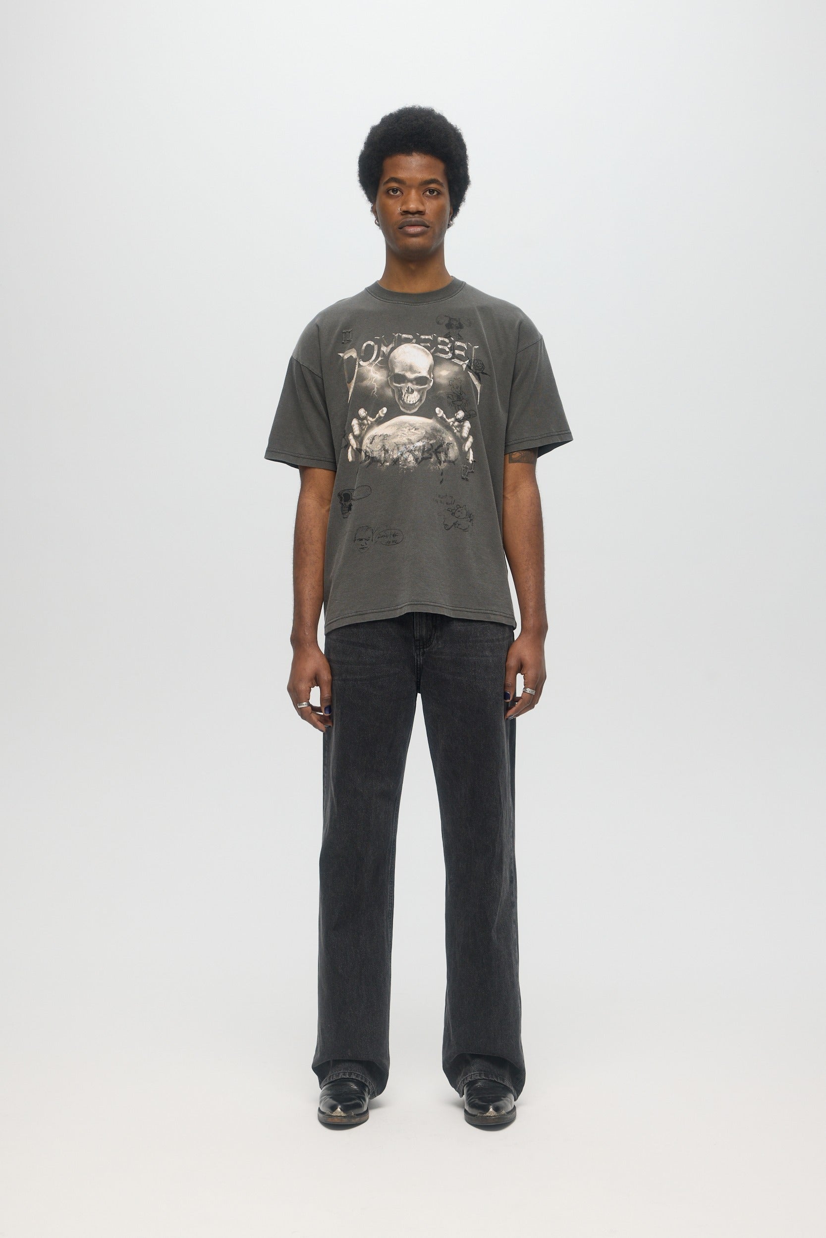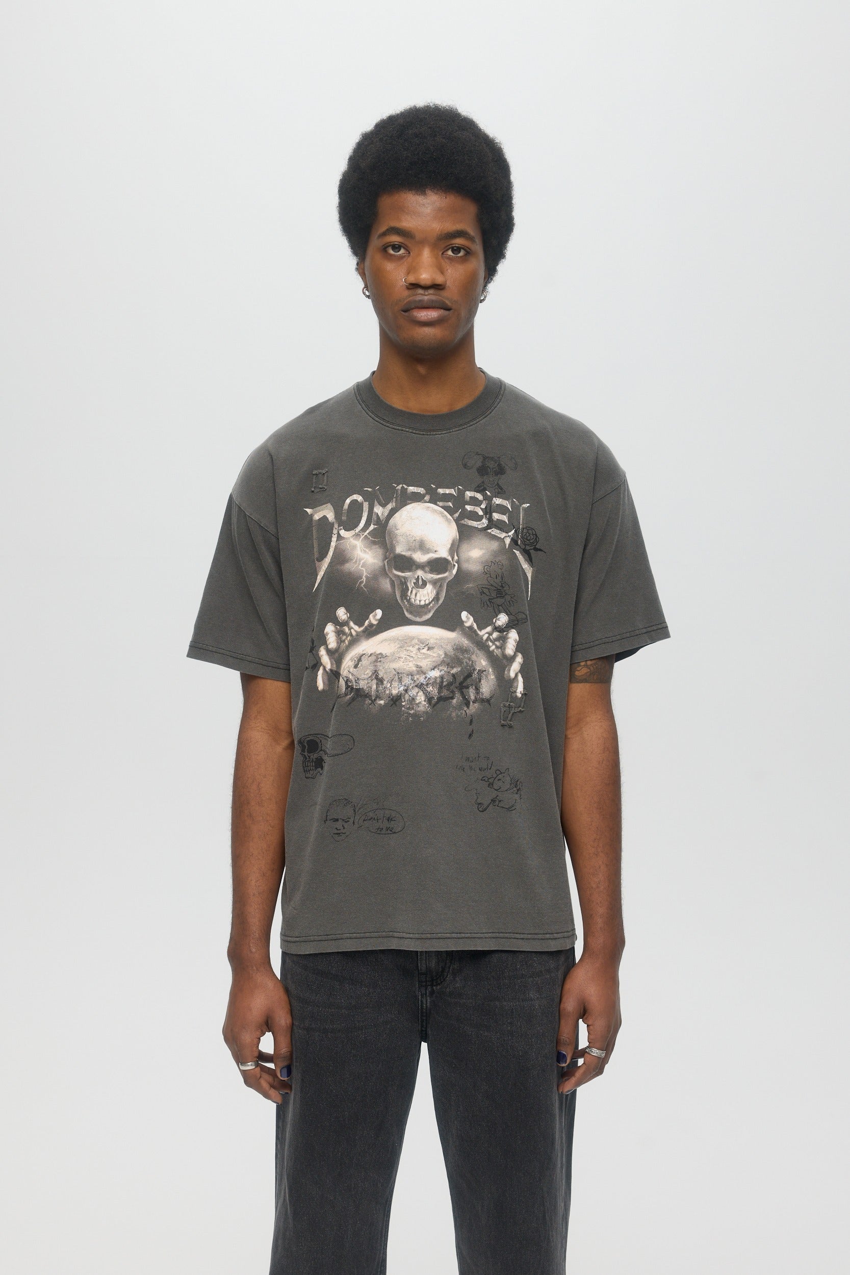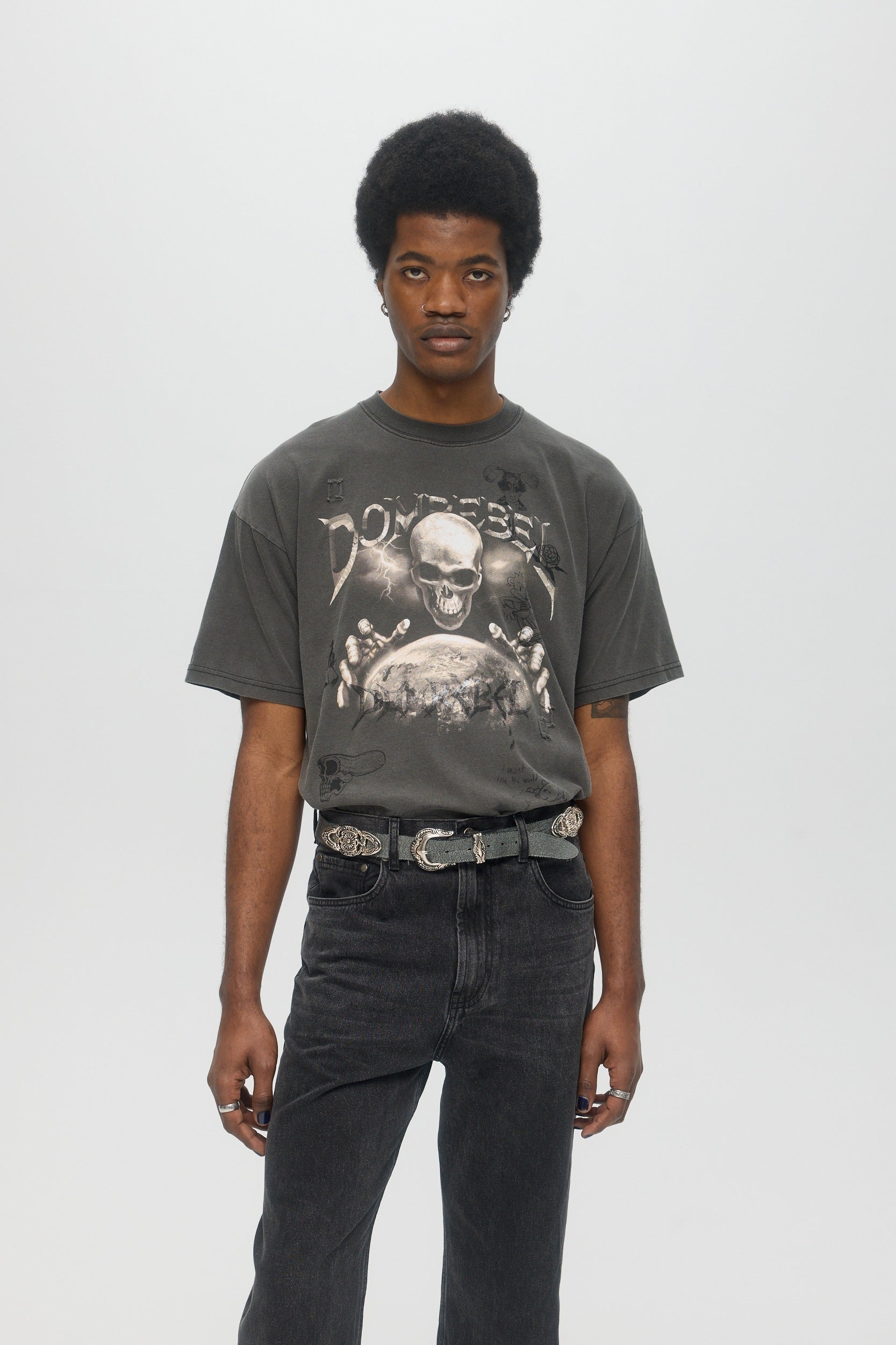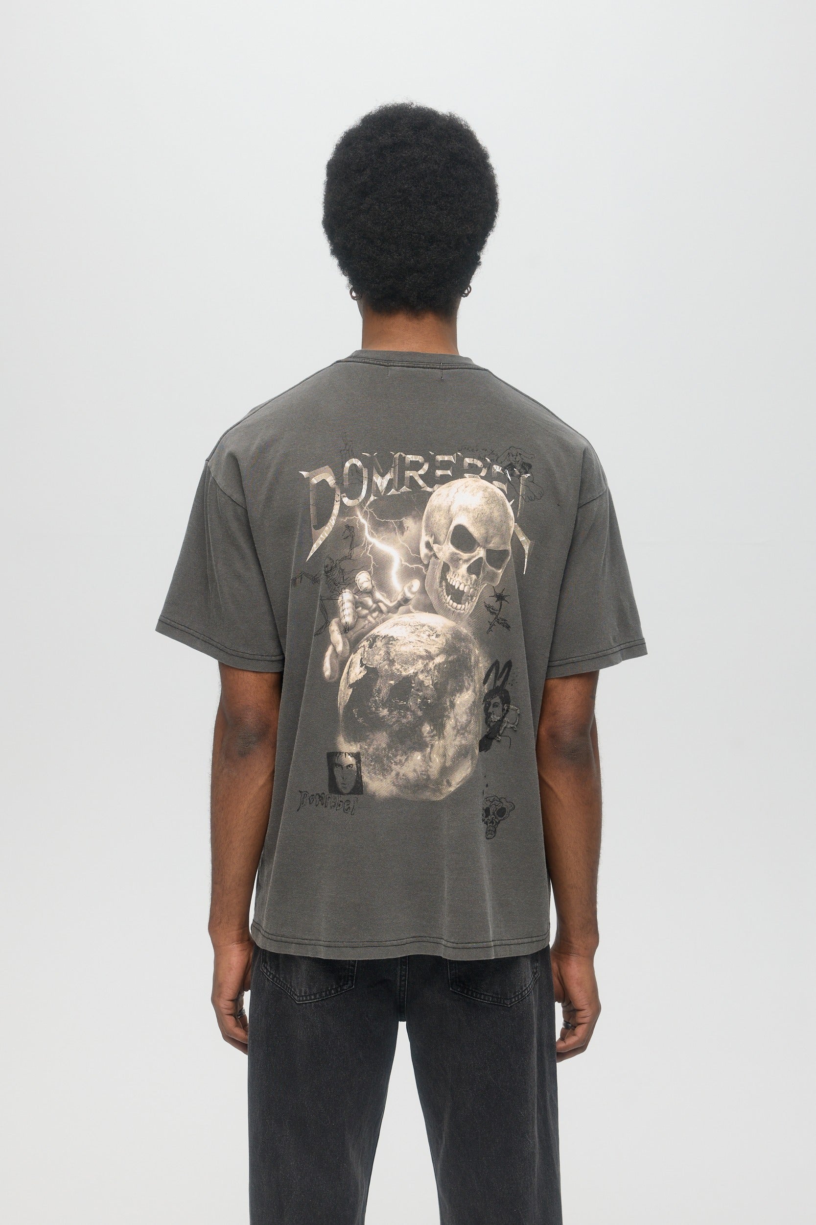 Our crowd-favorite t-shirt fit is made from custom cotton jersey, milled and constructed in Canada. Original DOMREBEL hand-drawn artworks screen-printed on front and back. We built this fit with a higher, cleaner rib neckline, and a very slight drop in the shoulder for the perfect fit. Fit is regular and true to size. Heavy vintage wash process.