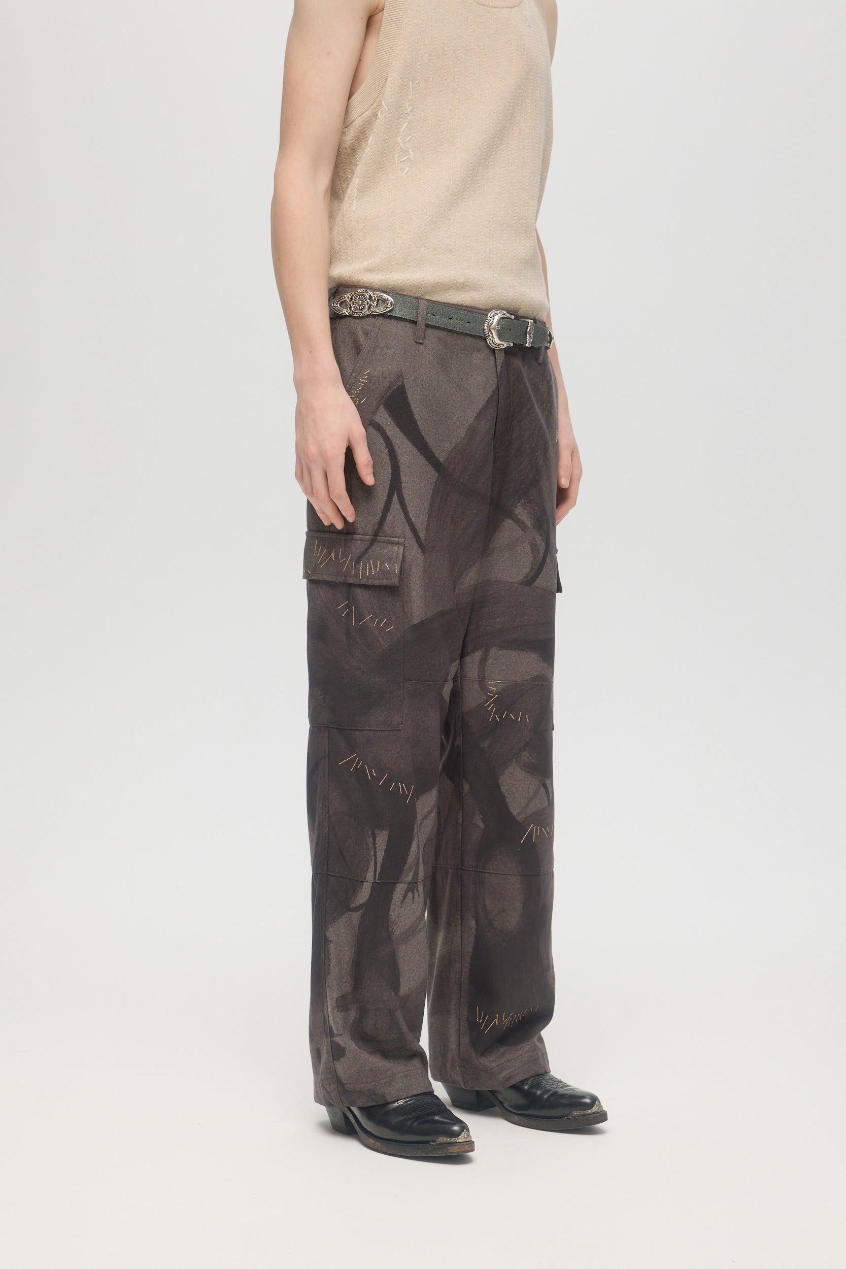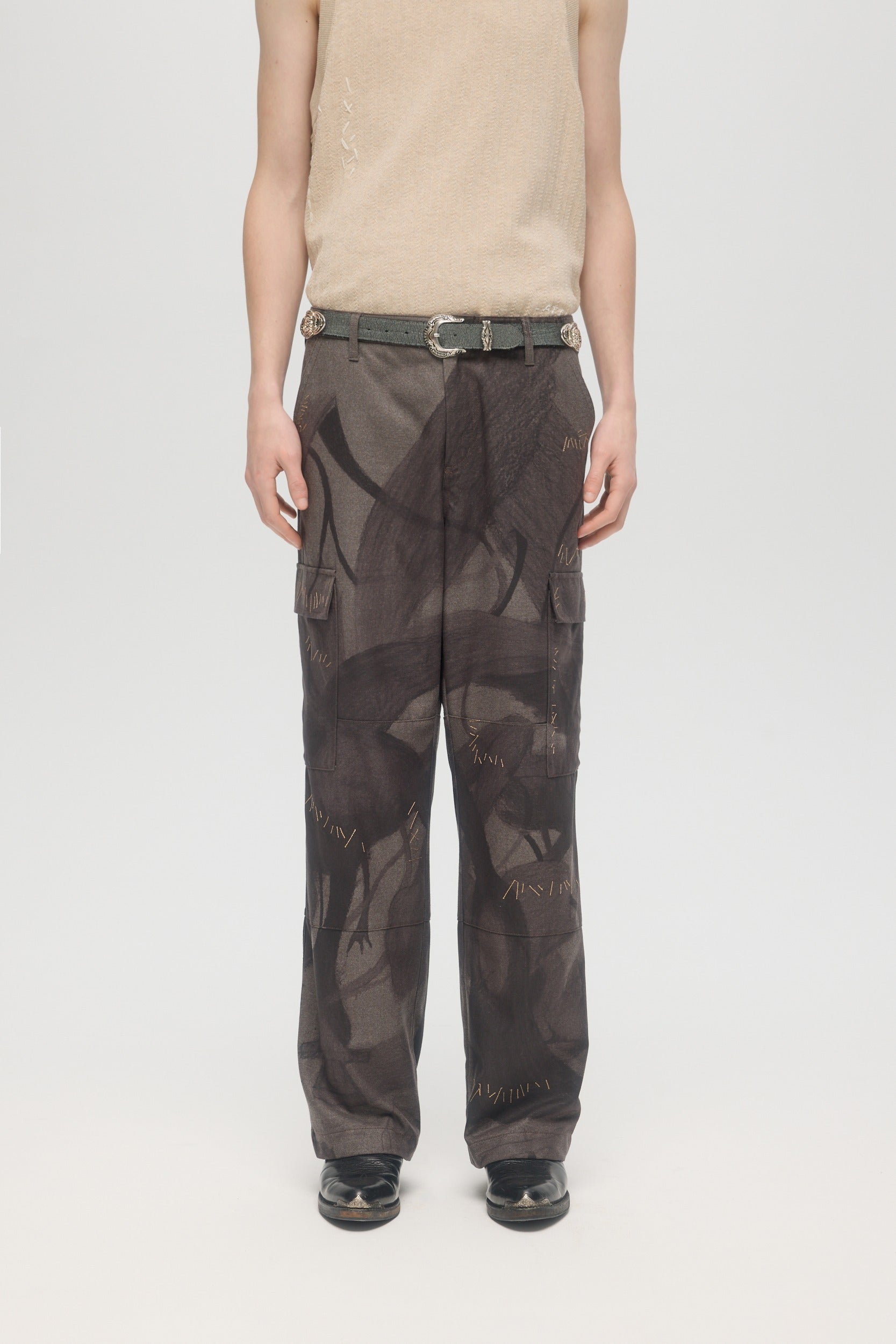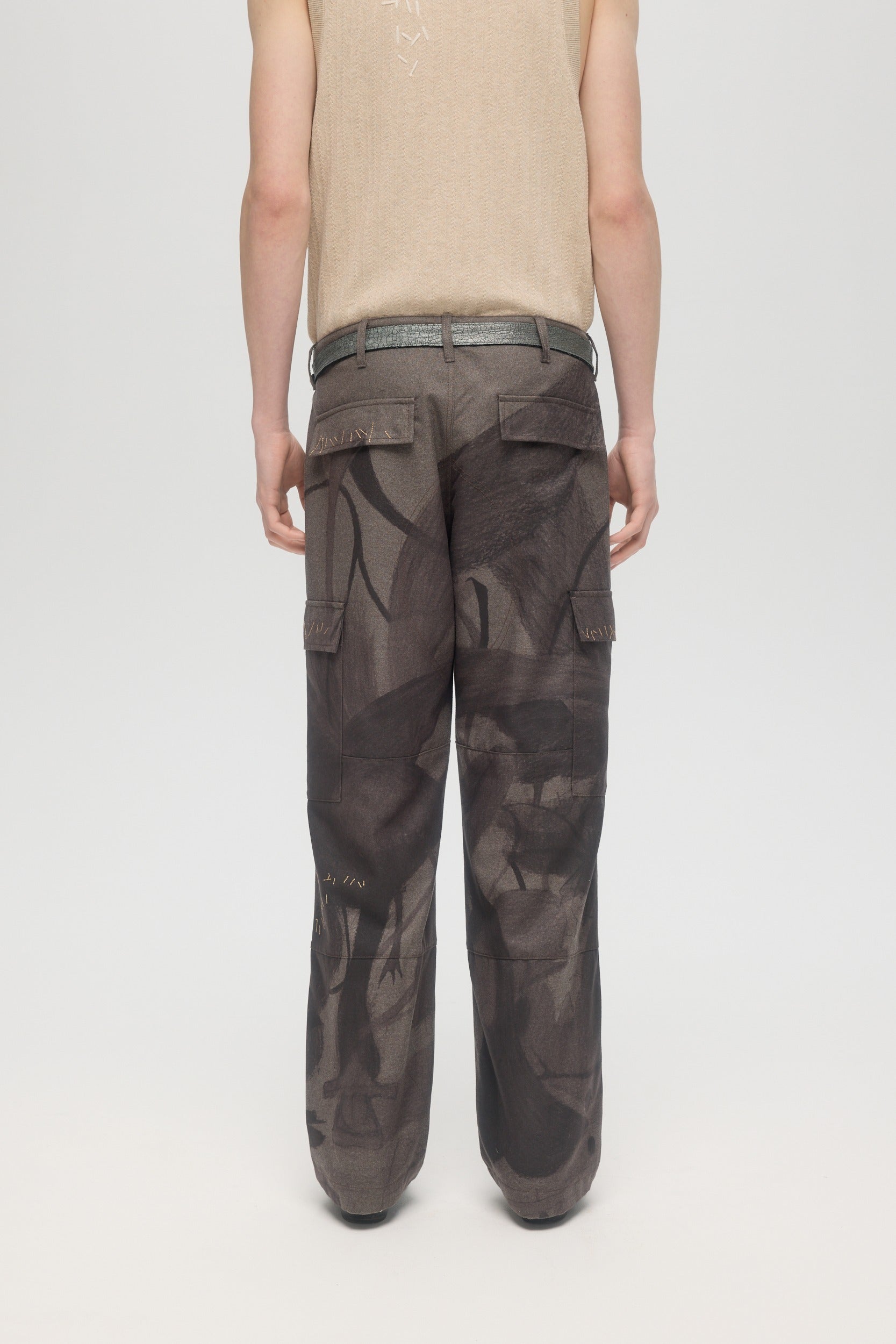 The Plume cargo pants are printed with original DOMREBEL studio artworks, with snap side pockets, multi-panel construction and decorative mending embroidery details throughout. Fit is regular and true to size. Matches well with the Plume overshirt.
