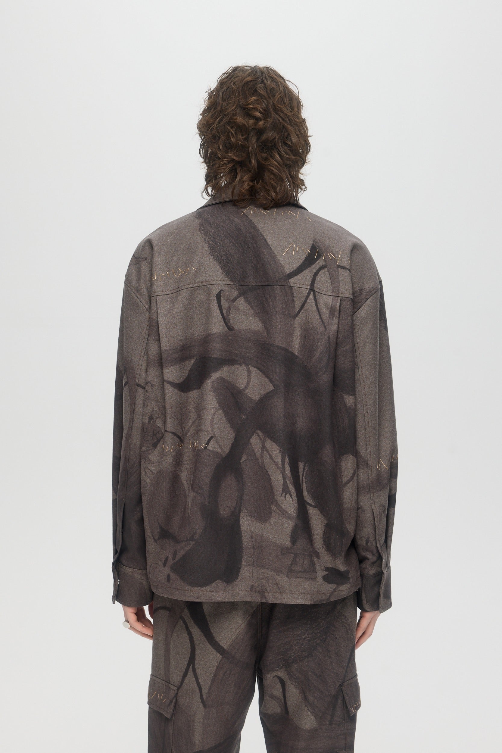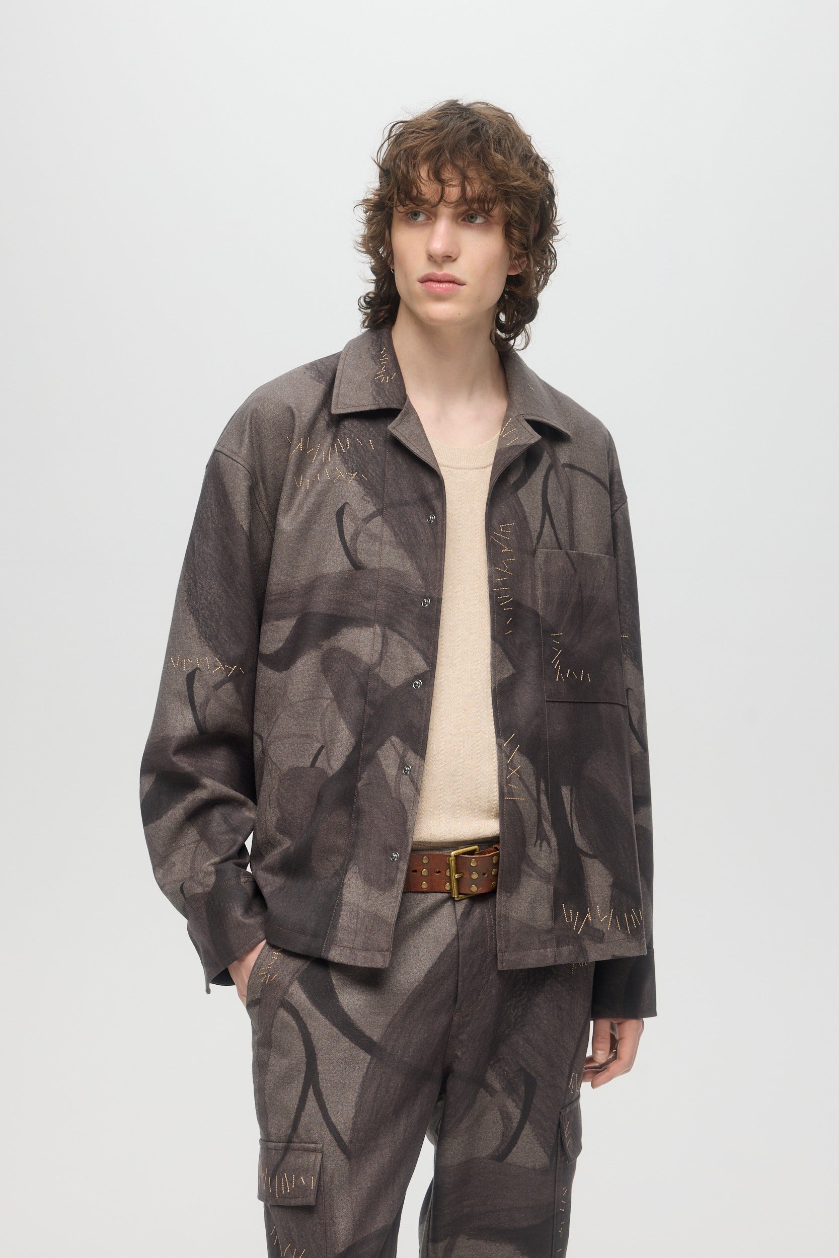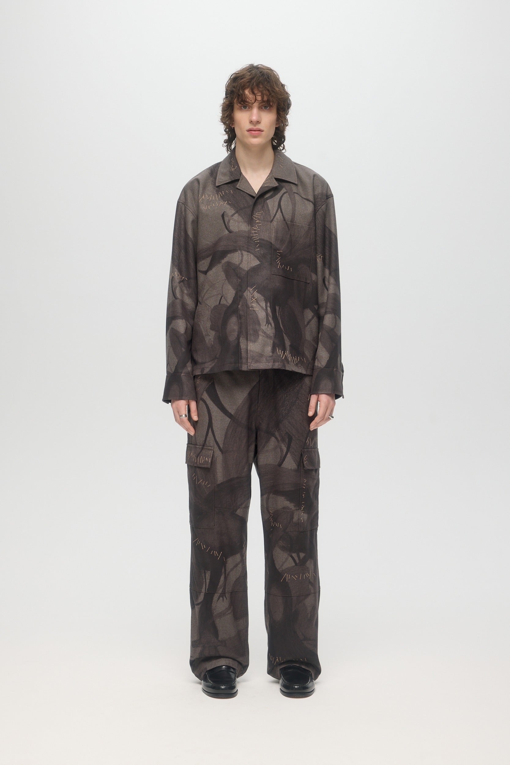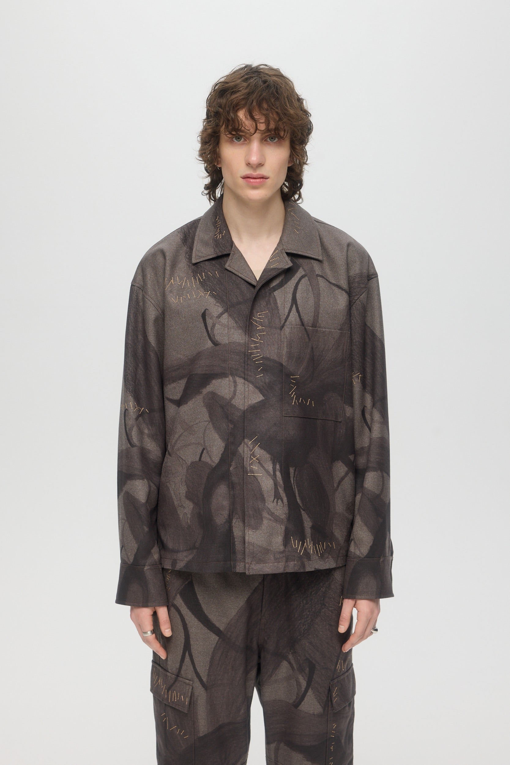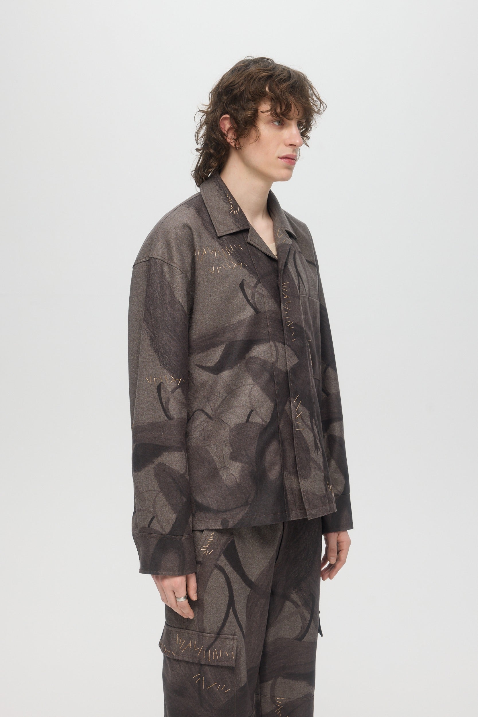 The Plume shirt is a relaxed fit open spread collar longsleeve overshirt, printed with original DOMREBEL artworks with meticulous print alignment along seams. Embroidery mending stitches throughout. The piece is fully lined, and can be worn as outerwear or indoors. Snap stud closure at front and cuffs, with twin pleats at back yoke and tennis tail hem. Fits relaxed and true to size.