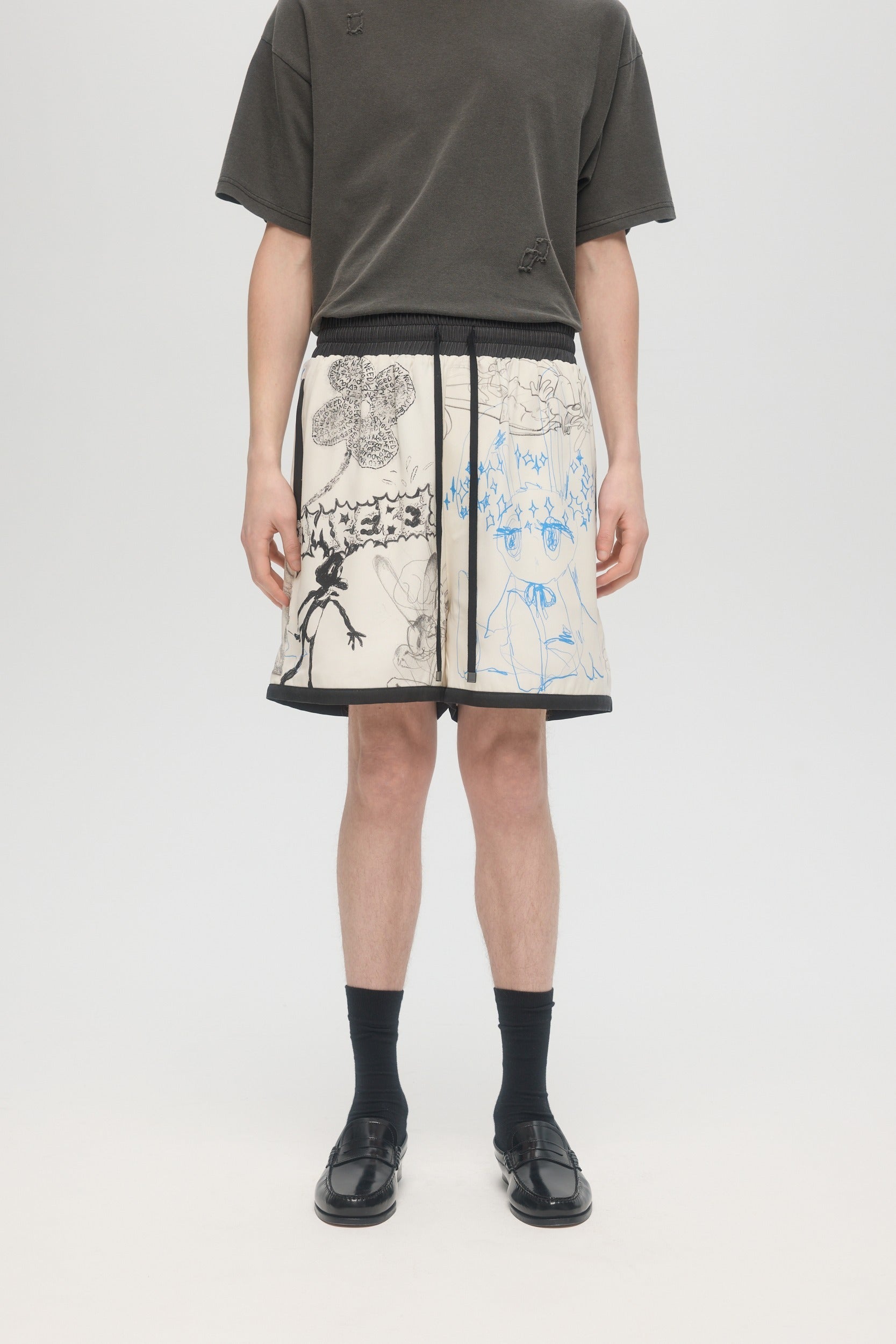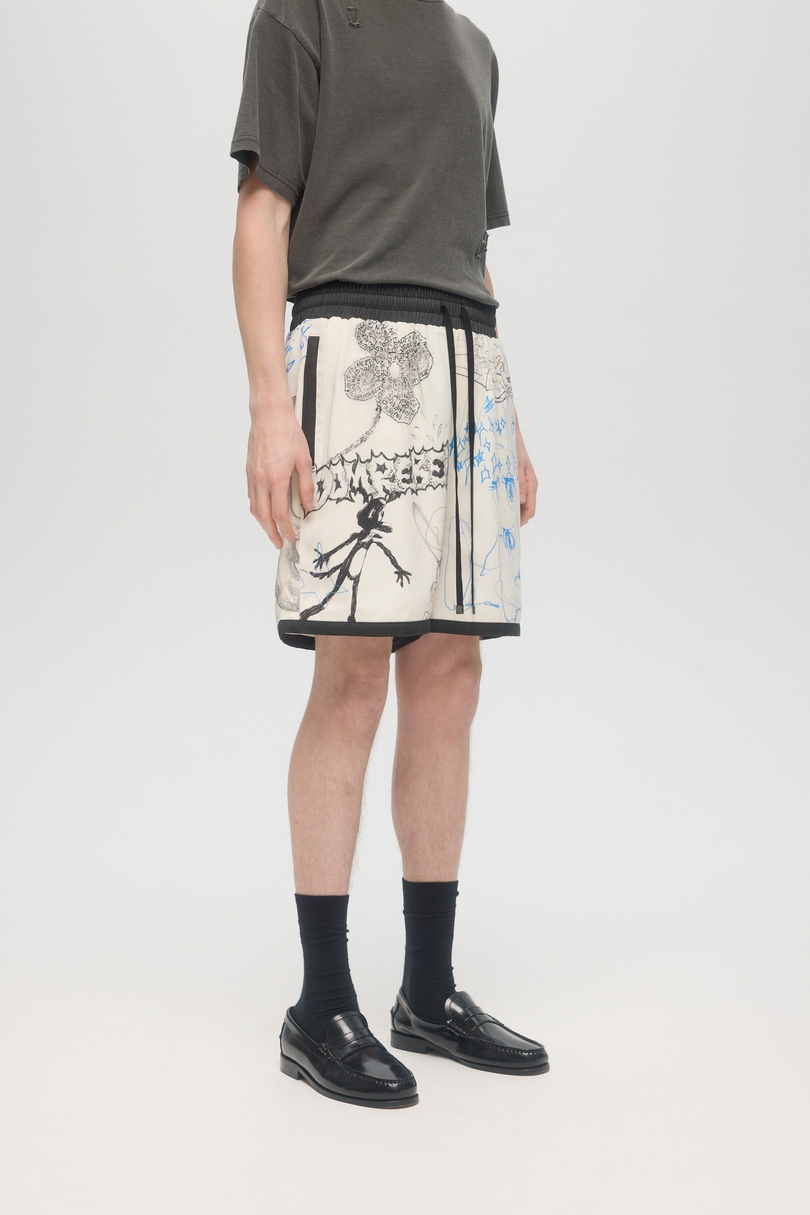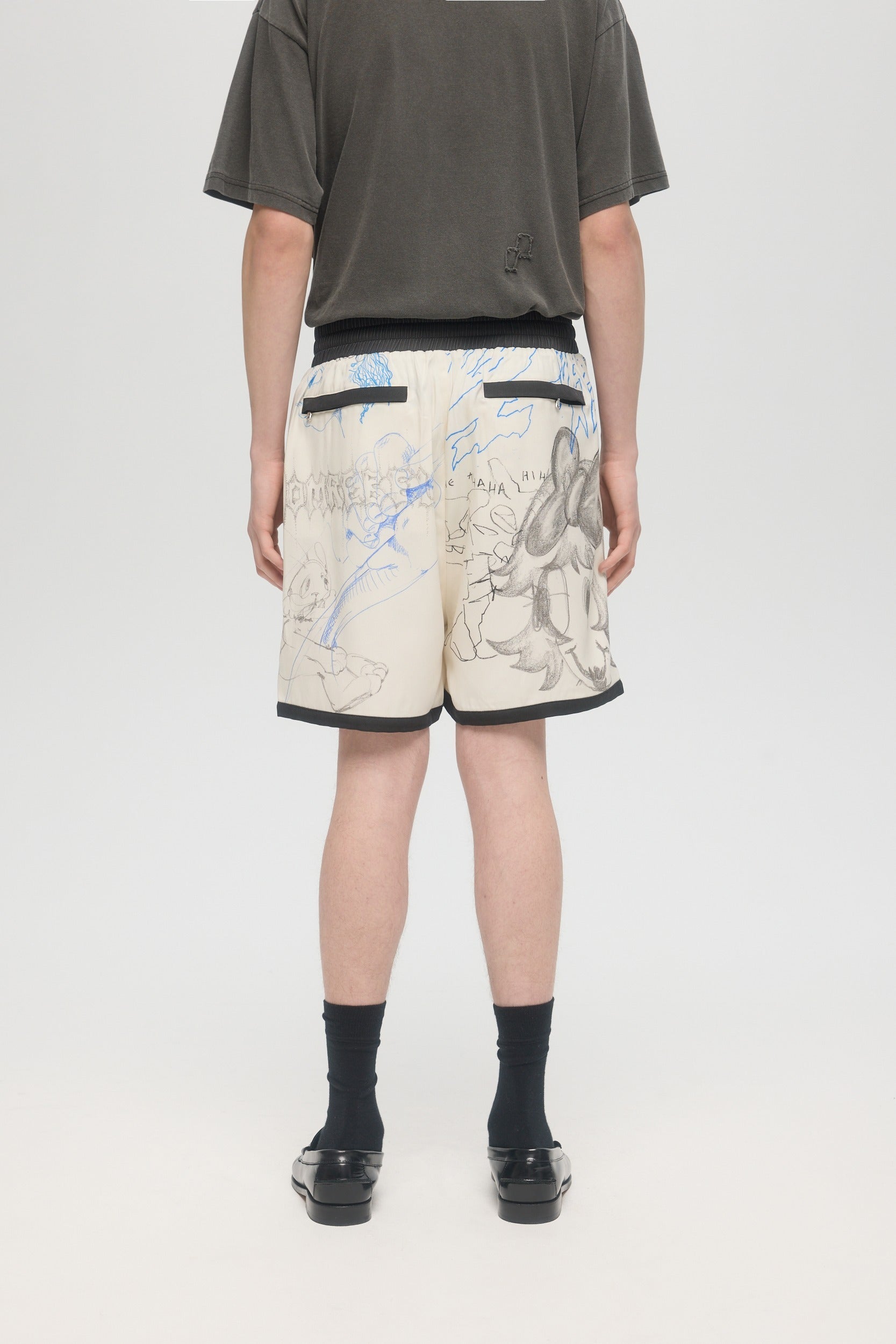 The Sketchbook shorts are made in an elevated basketball short construction, with fully lined mesh, side and back zip pockets, and an elastic waistband. Original DOMREBEL studio artworks are printed throughout, on our popular rayon tencel twill fabric. Fit is relaxed and true to size. Matches well with the Sketchbook shirt.