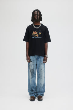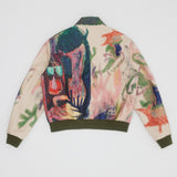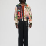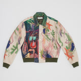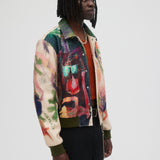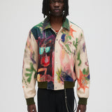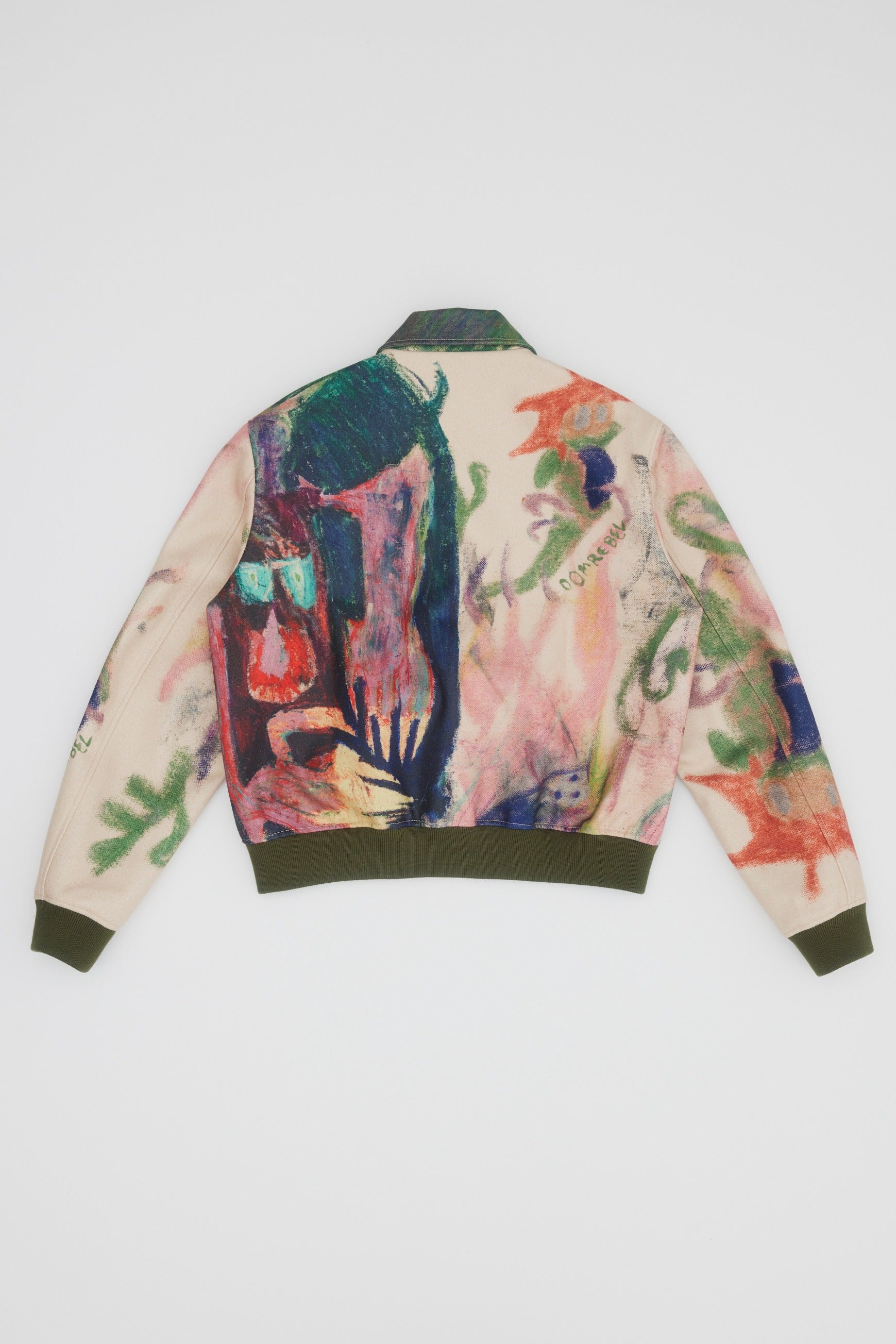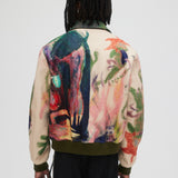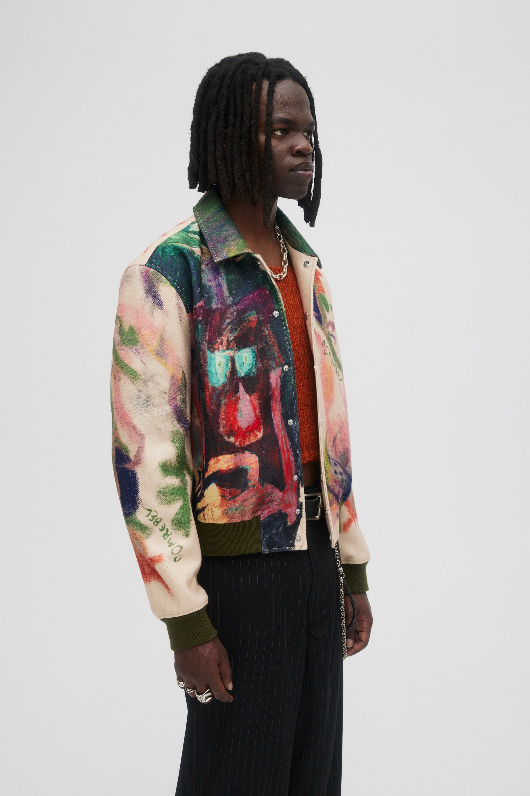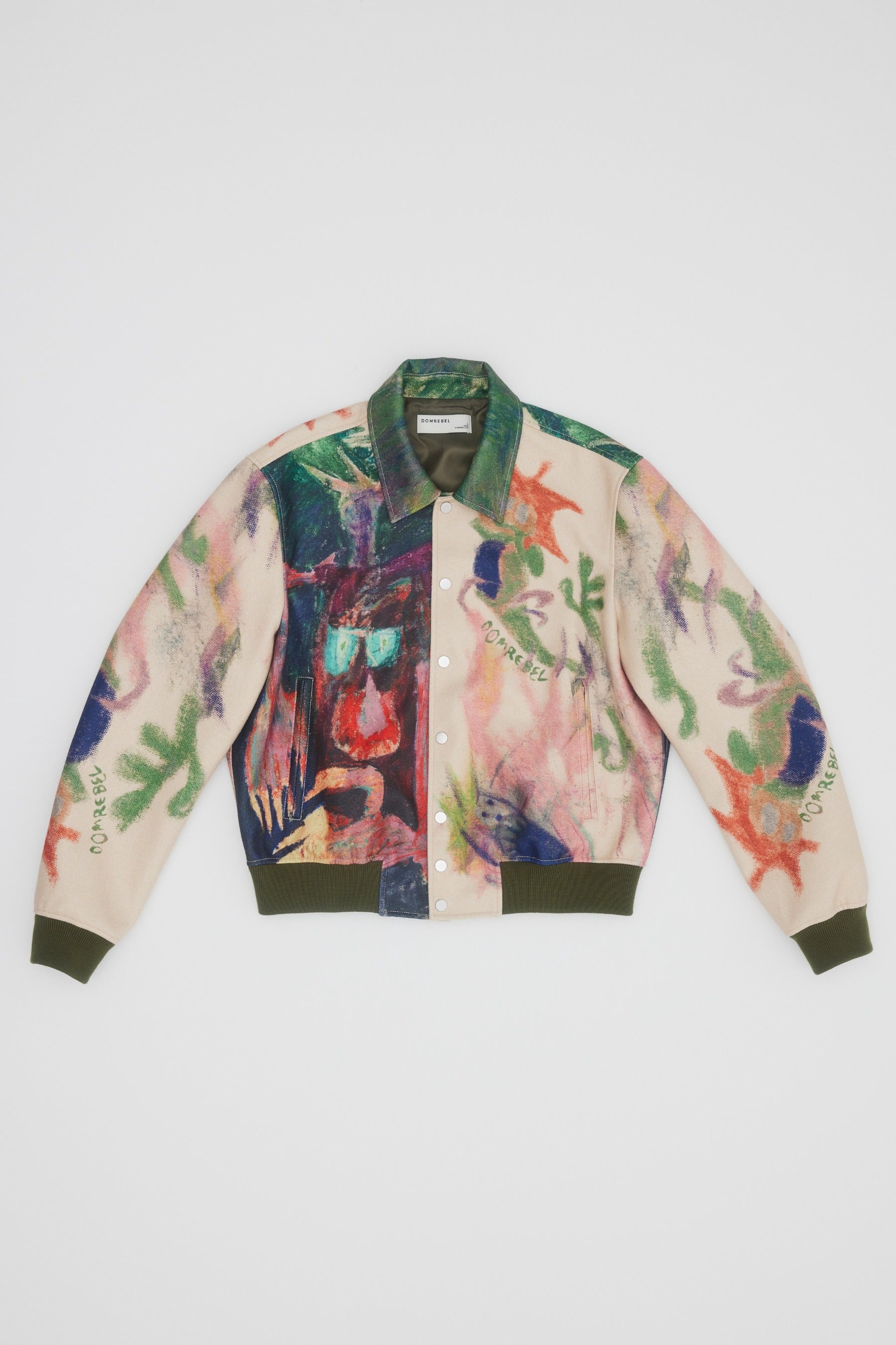 VARSITY BOMBER JACKET FEATURING PRINTED ARTWORKS OF ORIGINAL DOMREBEL OIL PAINTINGS. THE MINDBENDER JACKET FEATURES AN ADAPTATION OF AN ORIGINAL 8-FOOT PAINTING CREATED BY THE DOMREBEL ART COLLECTIVE, PRINTED ON FELTED TEXTILE. THE SPREAD-COLLAR JACKET HAS PRESS-STUD CLOSURE, RIB KNIT HEM AND CUFFS, OUTER ZIP POCKETS AND CONCEALED INNER POCKETS.