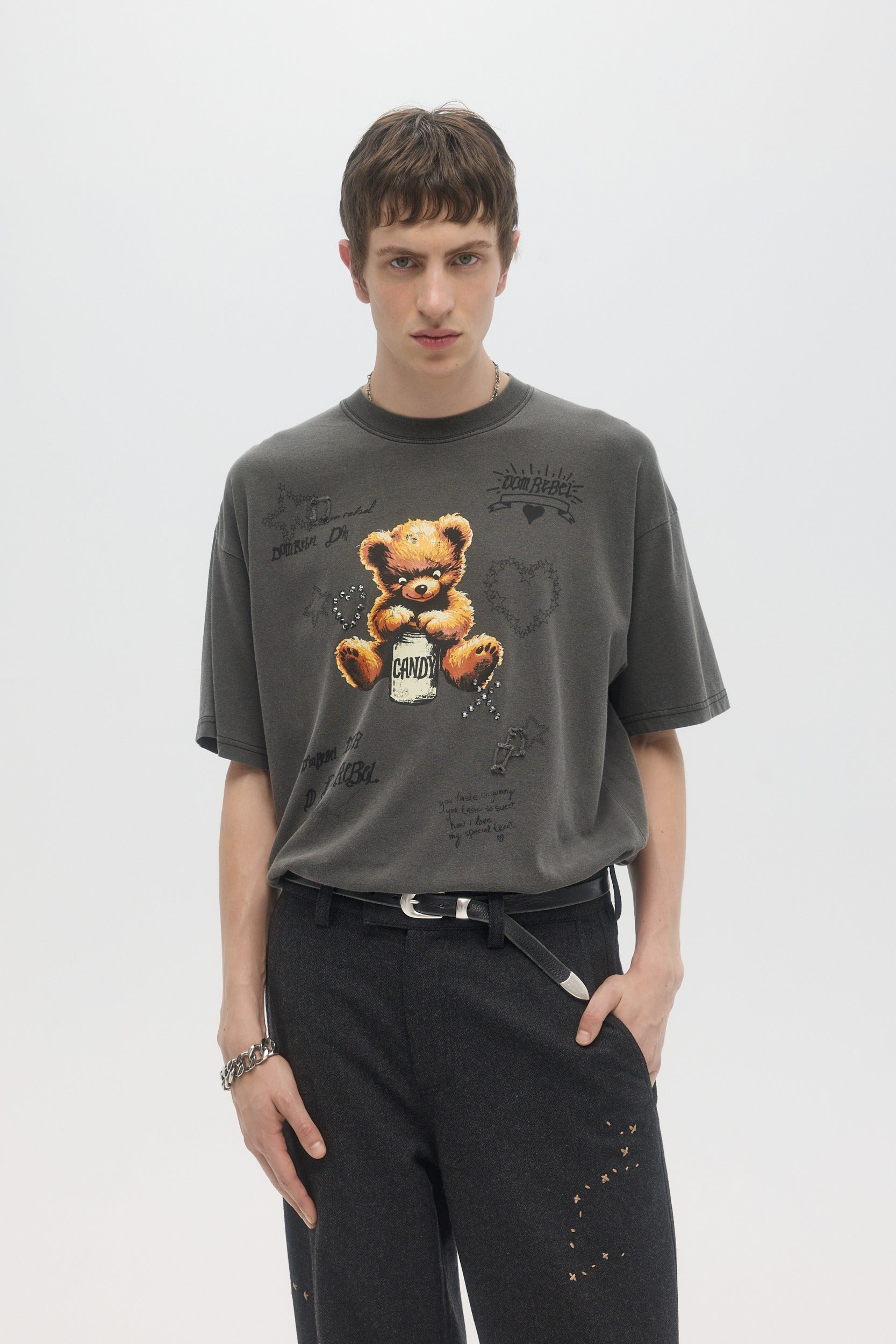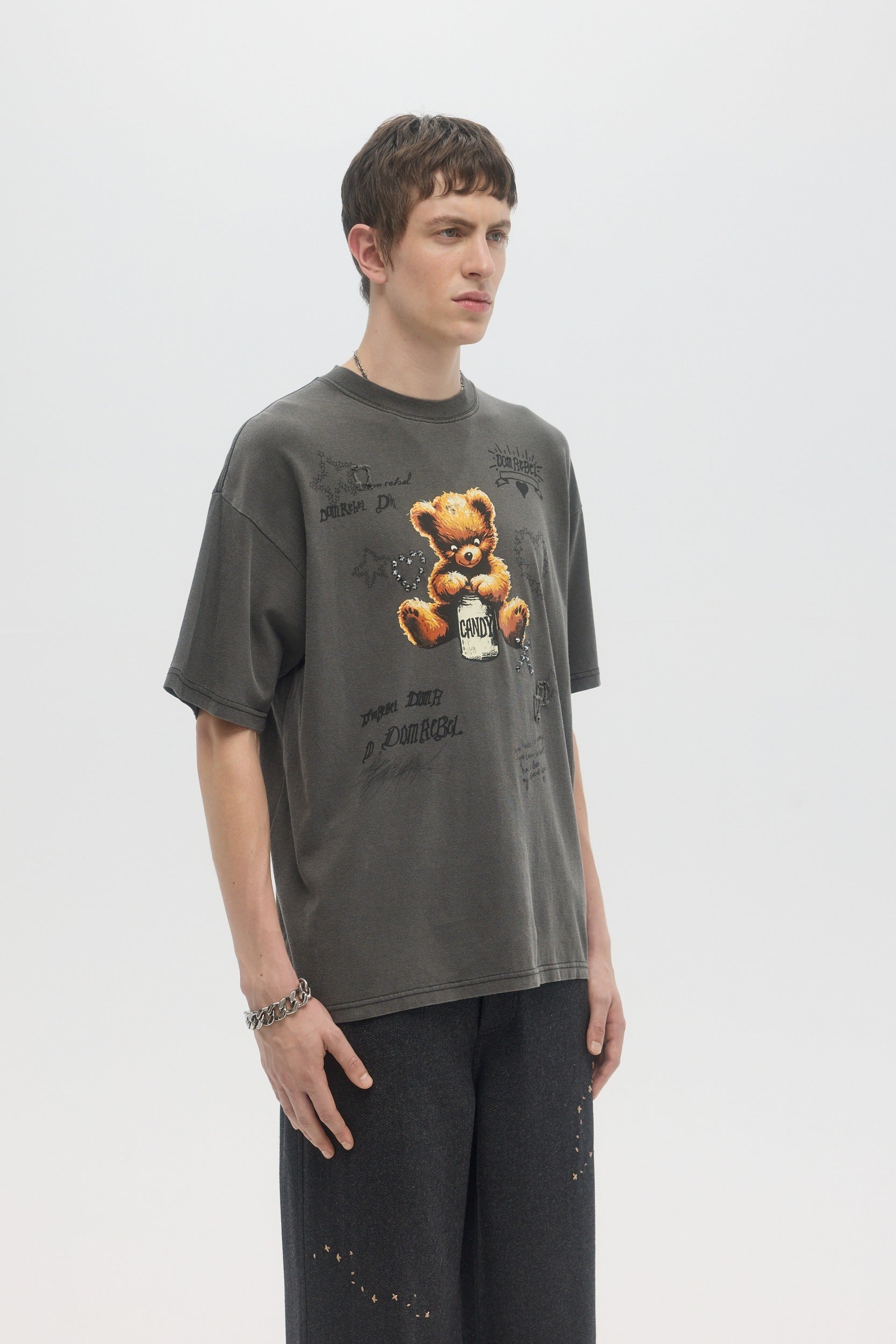 Our crowd-favorite t-shirt fit is made from custom cotton jersey, milled and constructed in Canada. Original DOMREBEL hand-drawn artworks screen-printed on front and back. We built this fit with a higher, cleaner rib neckline, and a very slight drop in the shoulder for the perfect fit. Fit is regular and true to size.