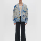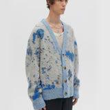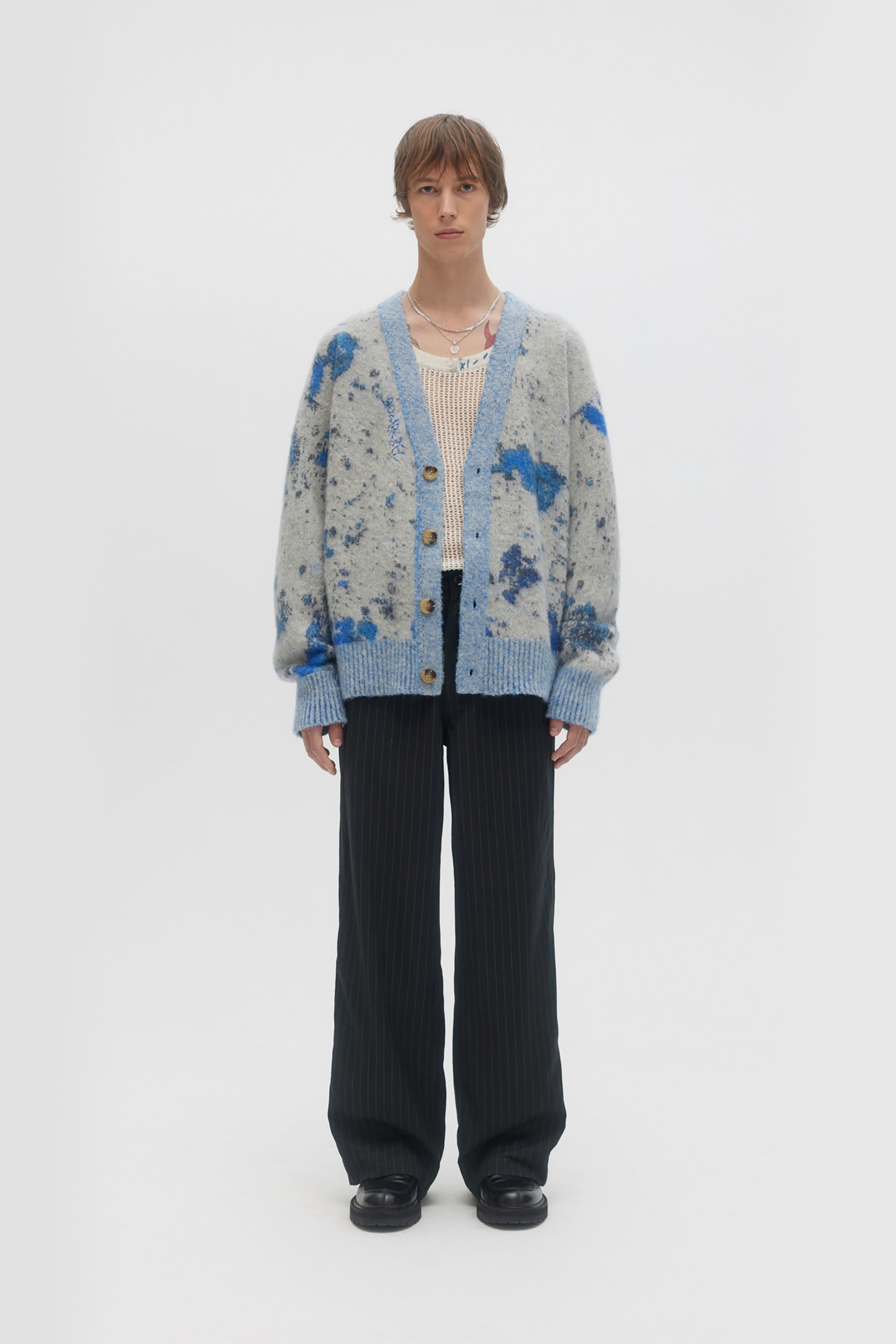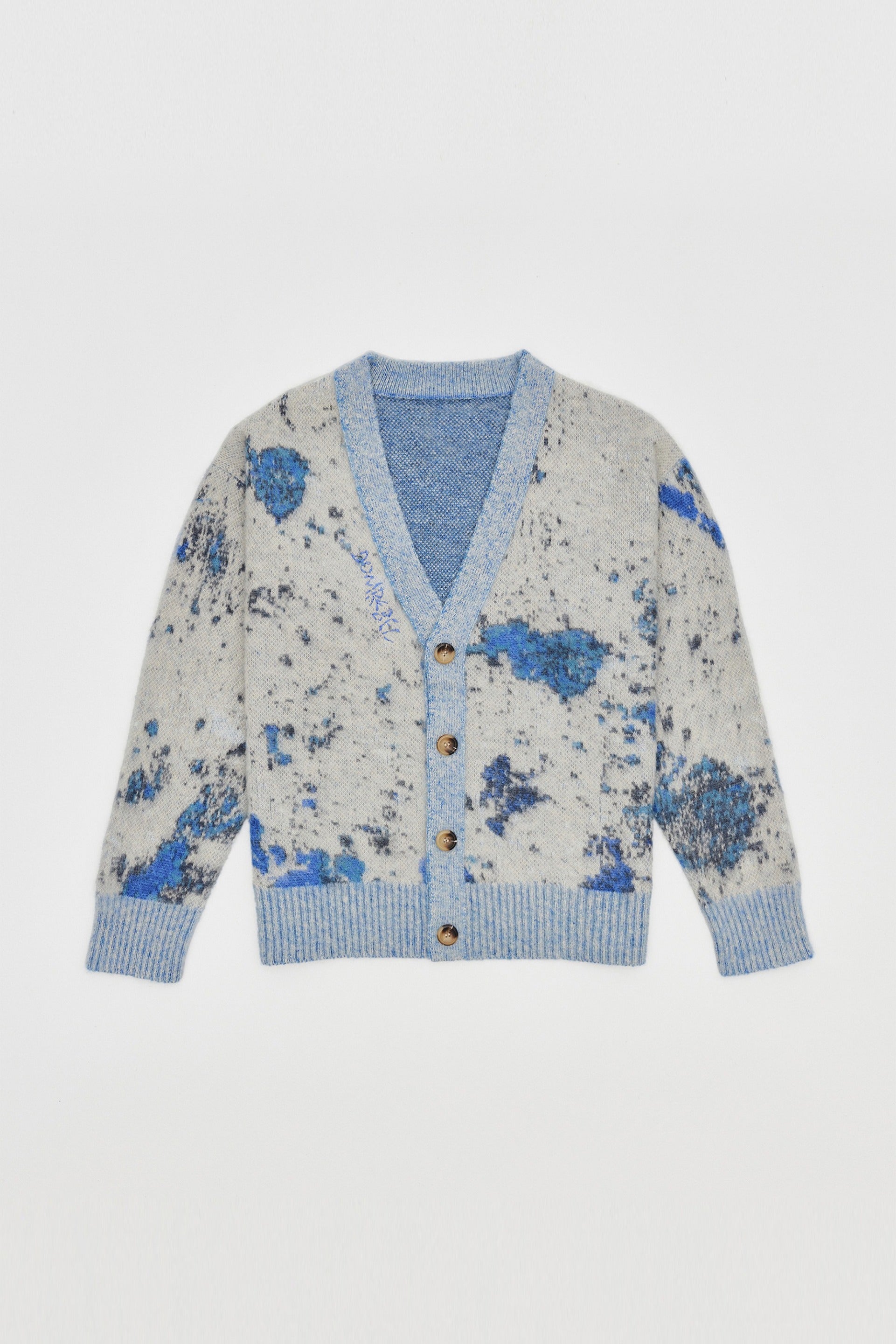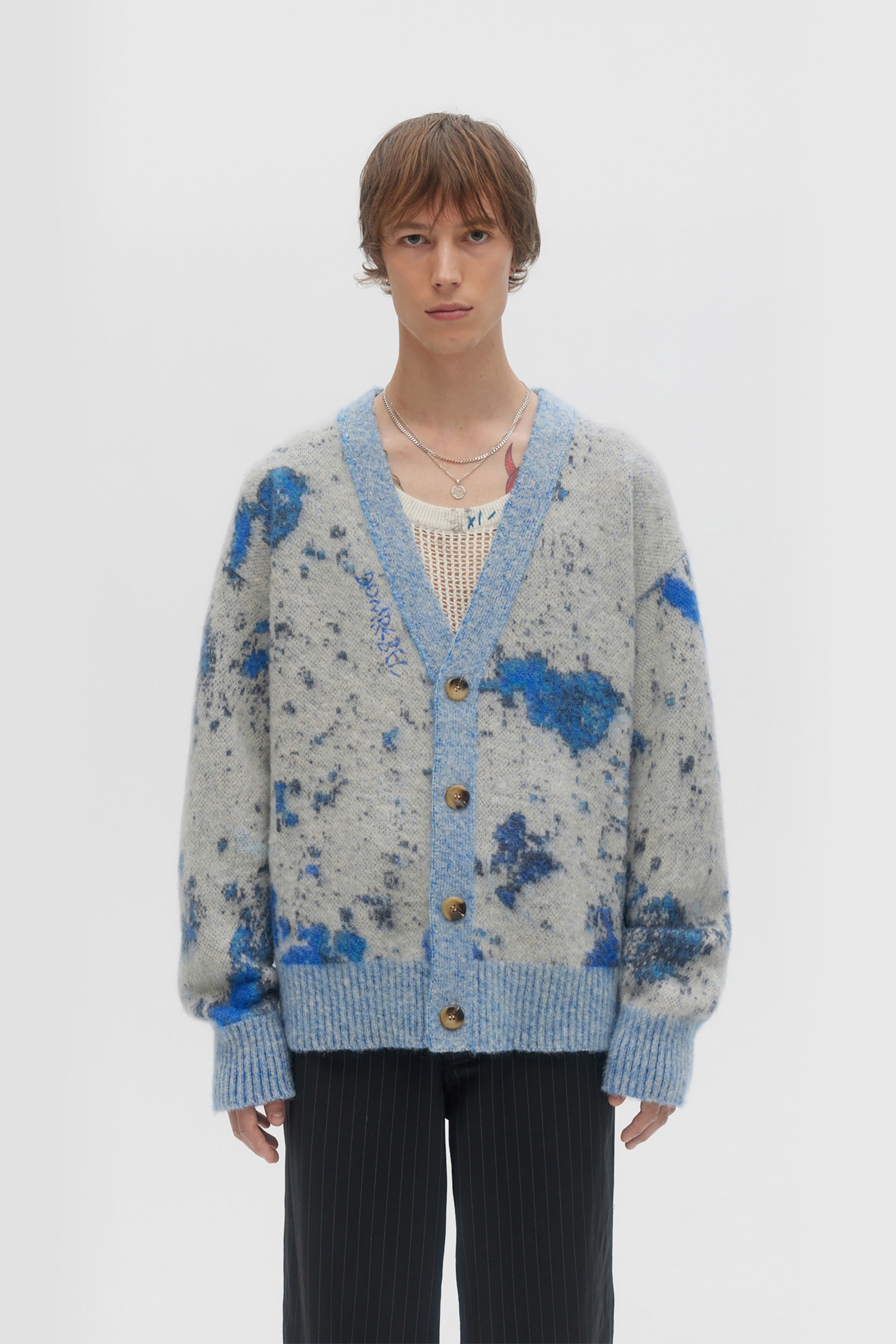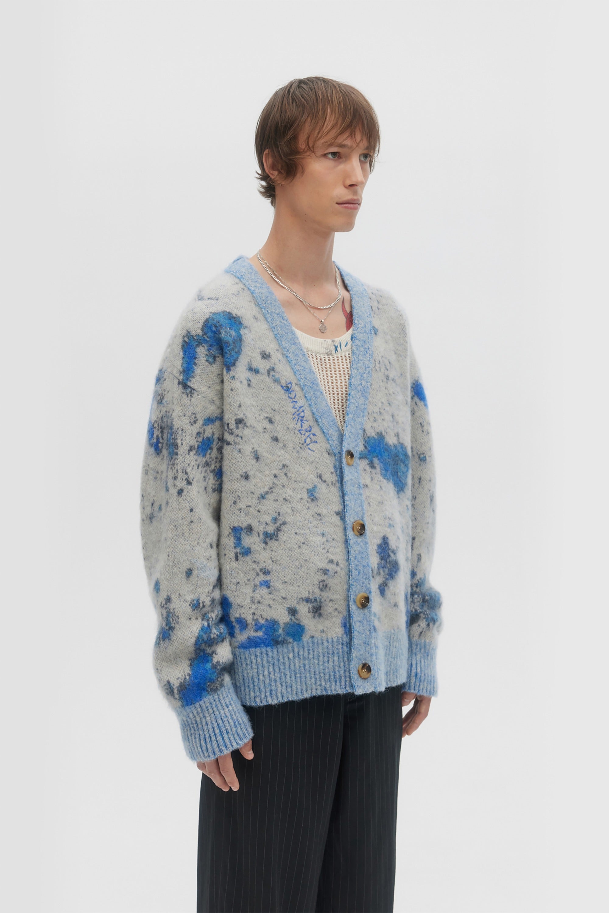 JACQUARD KNIT MOHAIR-BLEND CARDIGAN FEATURING ADAPTED PAINT STAINS FROM OUR STUDIO FLOOR THROUGHOUT. FIT IS RELAXED AND SLIGHTLY OVERSIZED.