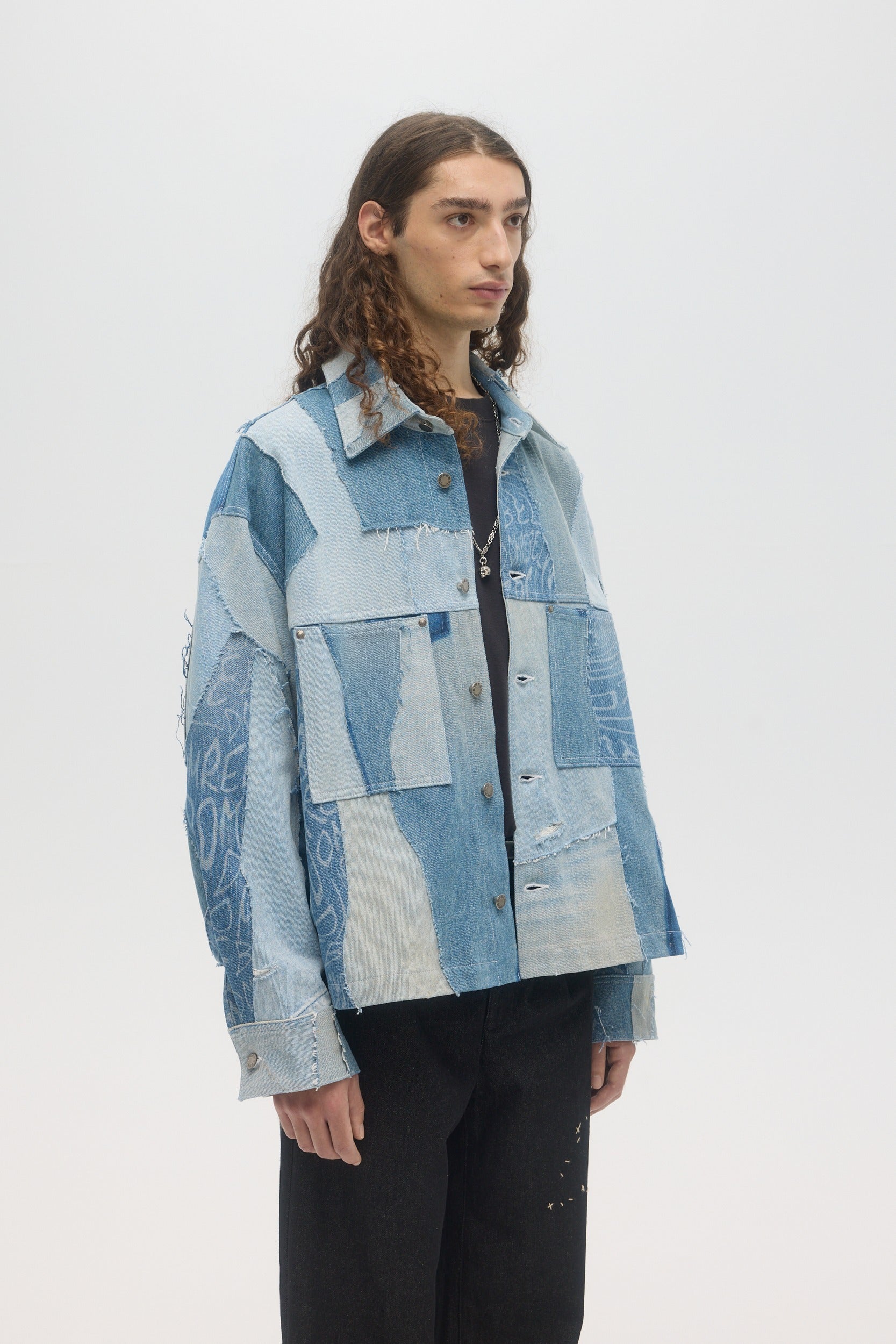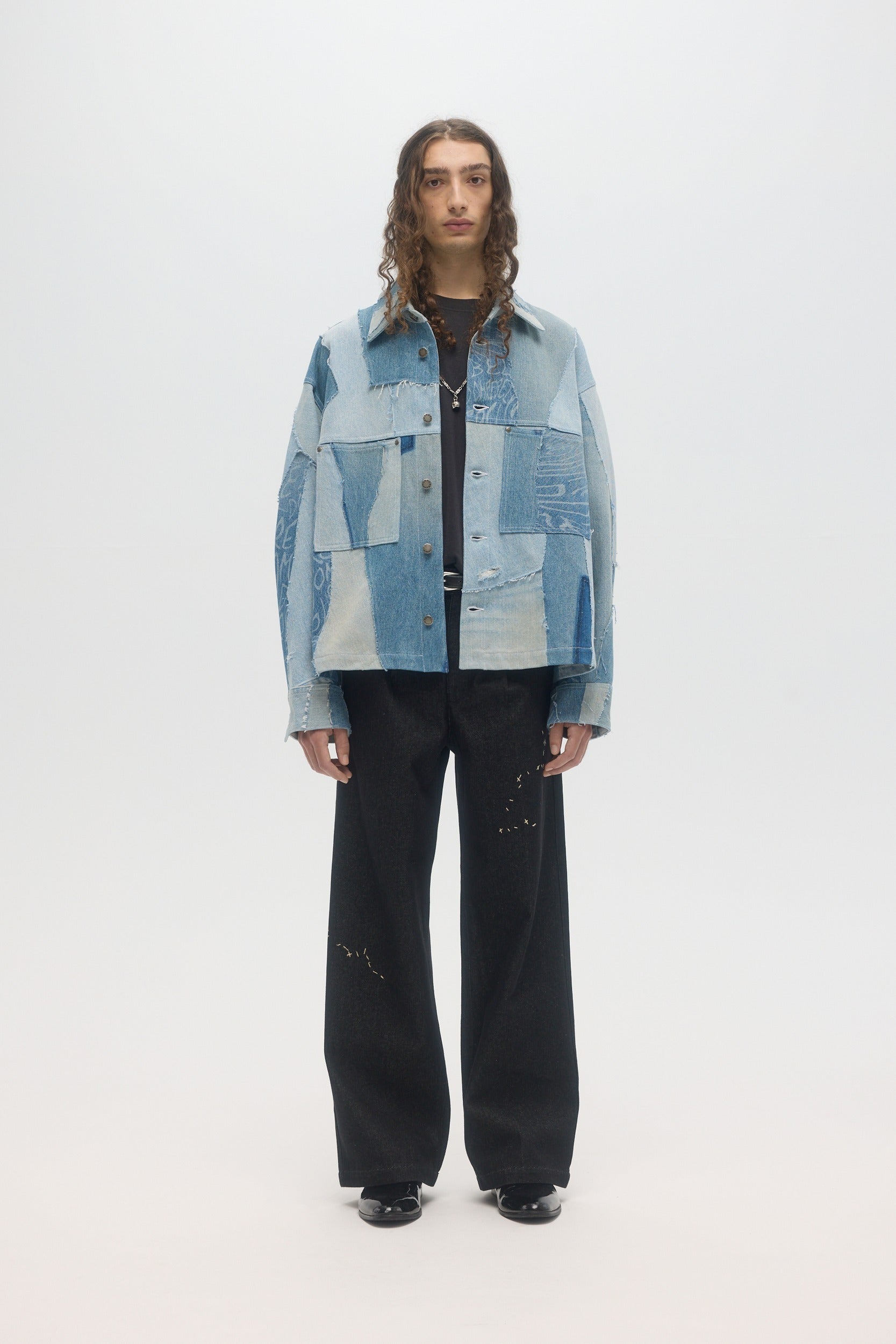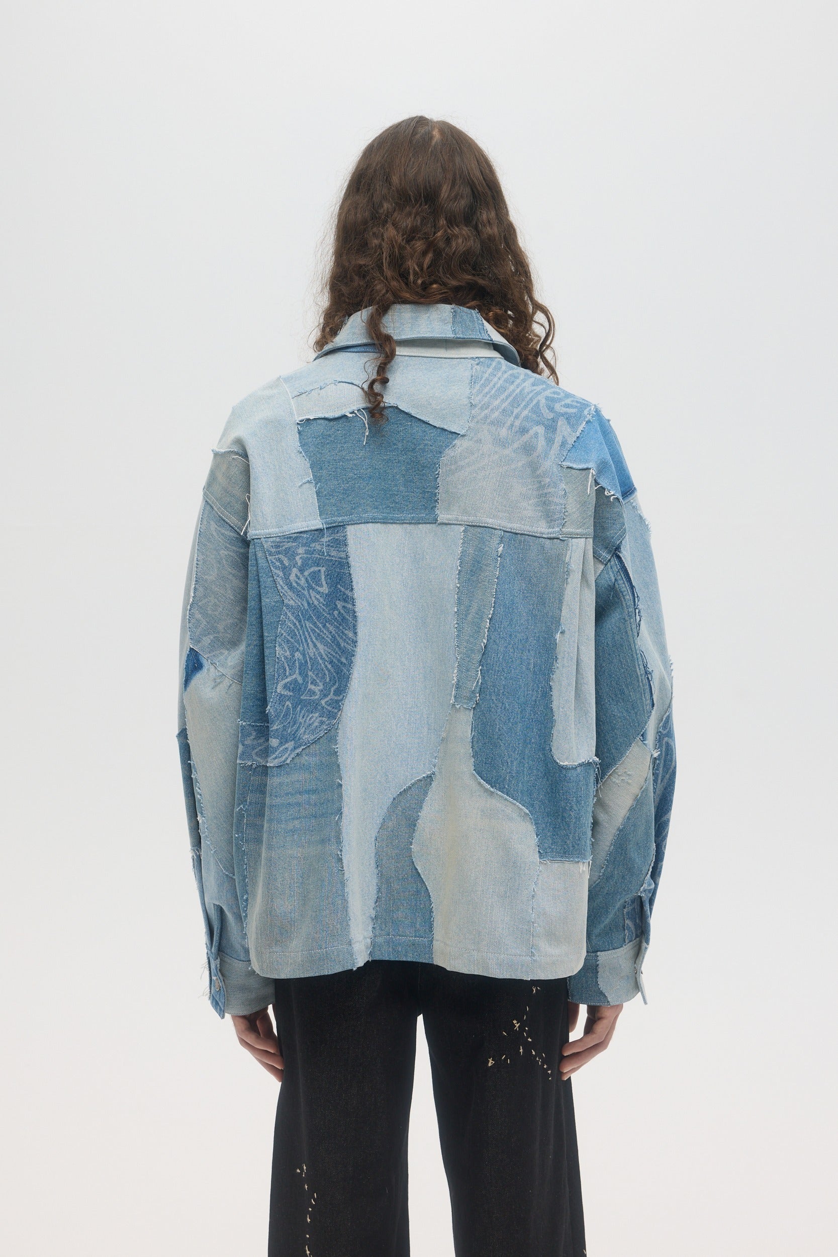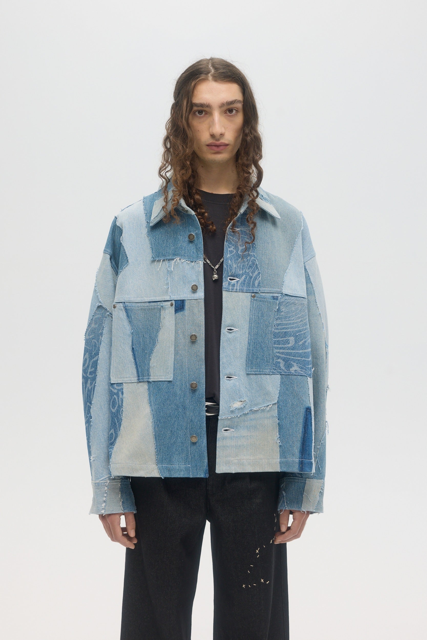 Handmade in Montréal, the Artisanal Jean Jacket is made from upcycled deadstock and vintage denim pieces, sourced from pre-worn denim items, cut into raw-edge panels and hand-sewn throughout. The unlined jacket has a relaxed boxy fit, button front and front pockets. DOMREBEL branded hardware throughout. This very limited edition piece is one of a kind, and all imperfections and details are hand-made and inherent to the artisanal process. Color shades of every denim piece vary throughout, embracing the natural patina that they inherited through previous wears.