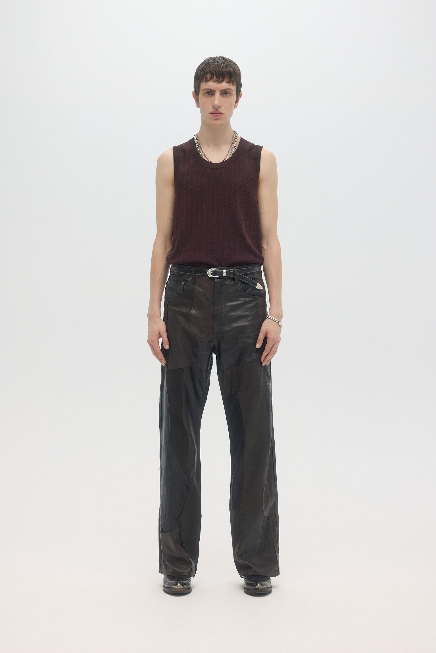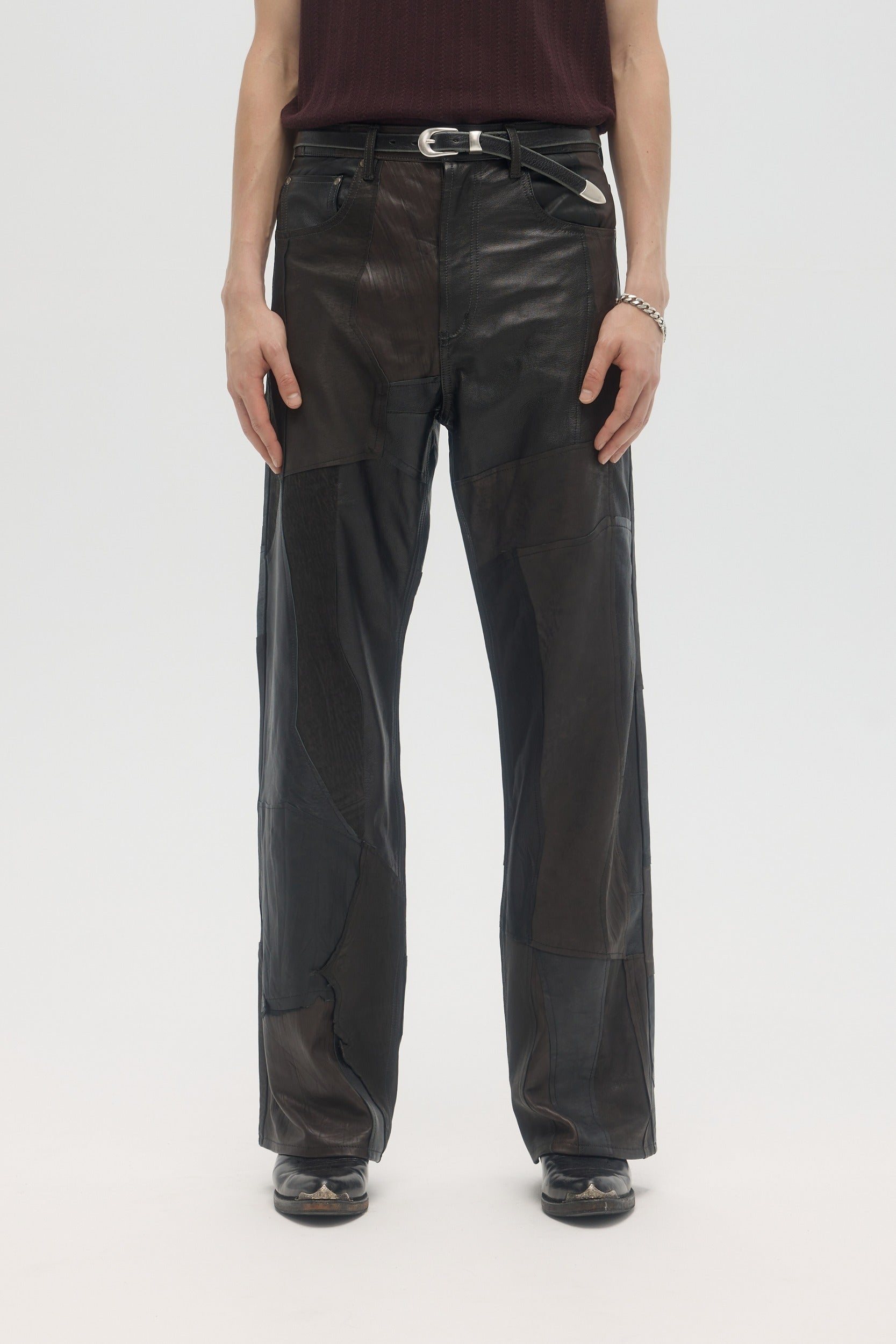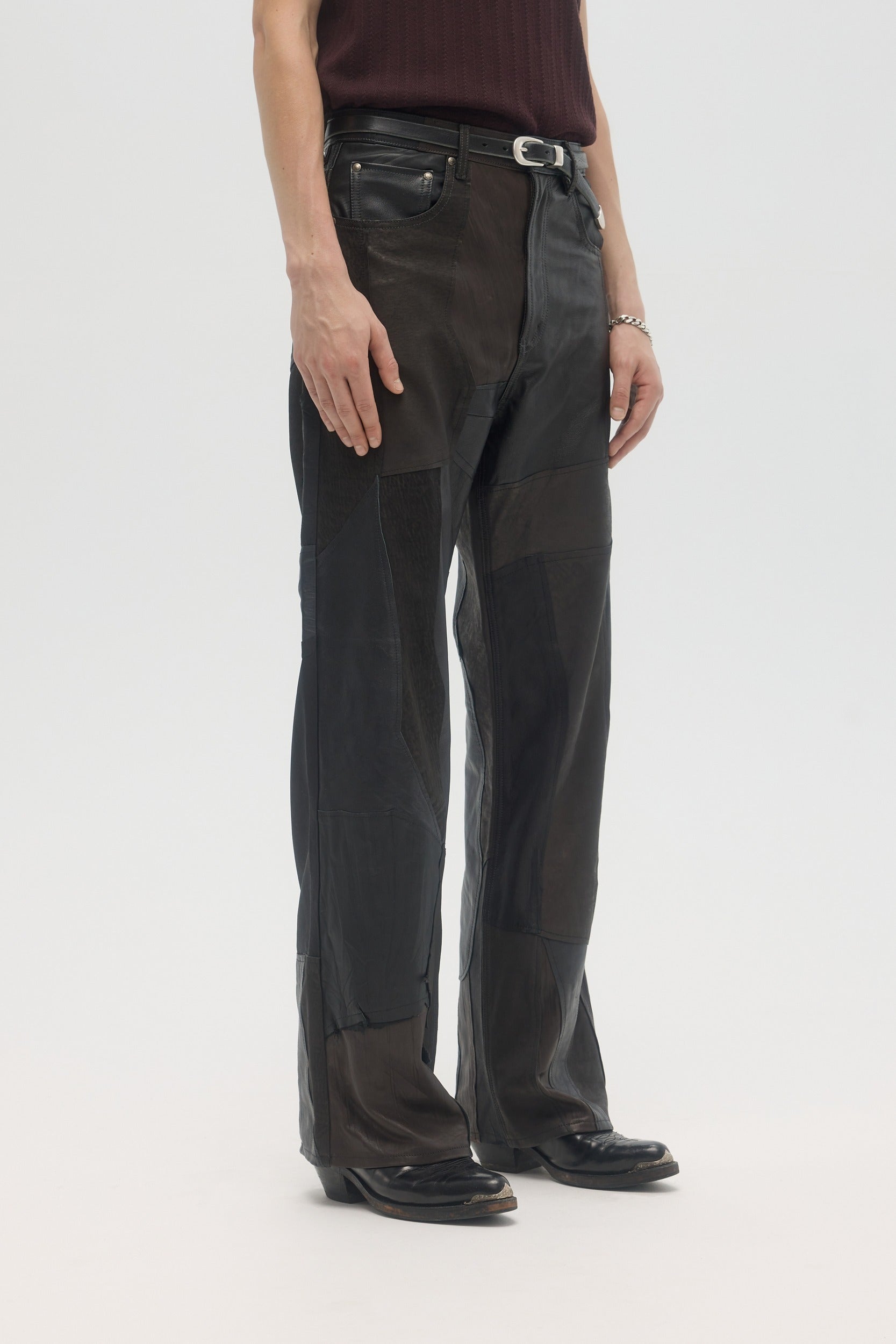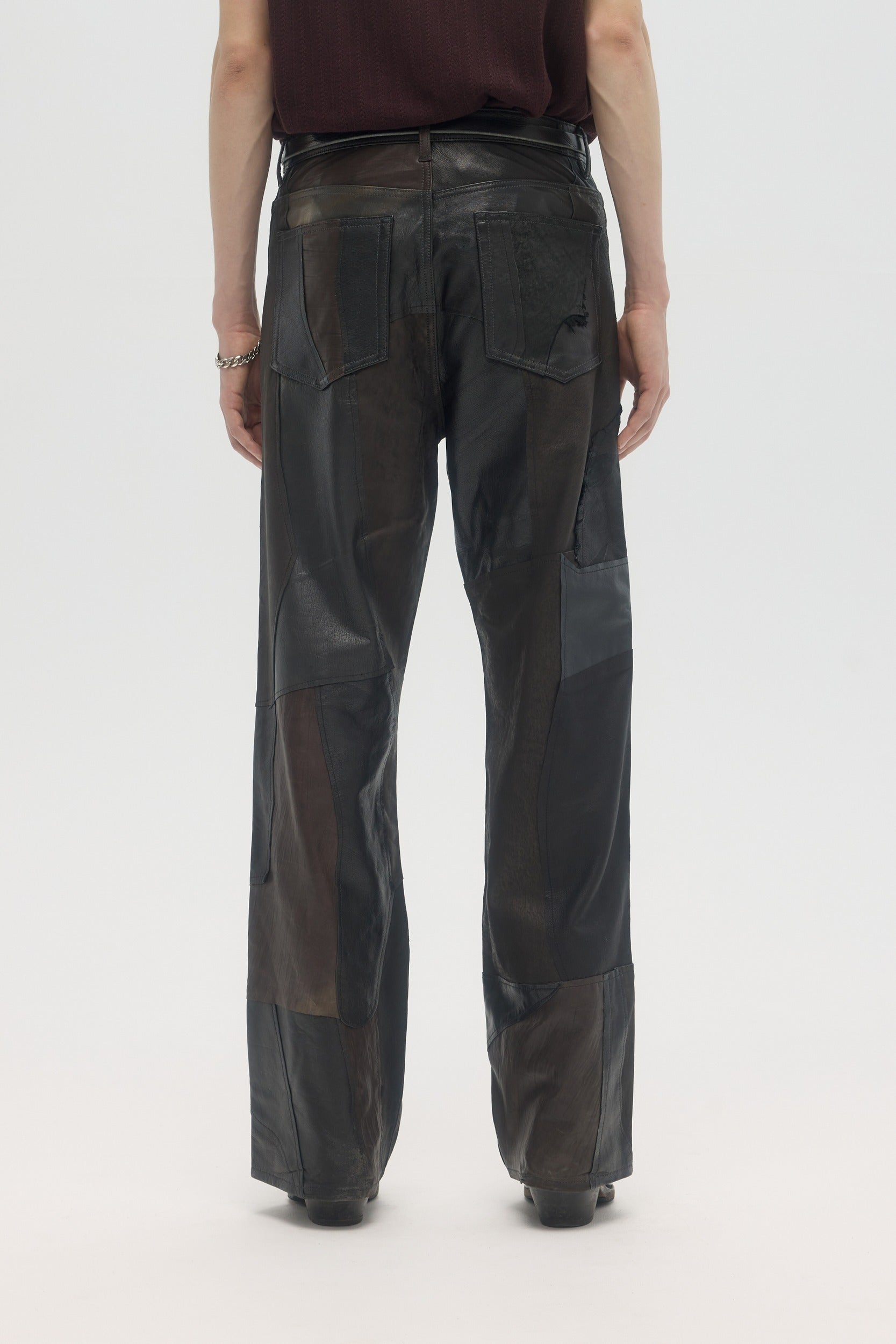 Handmade in Montréal, the Artisanal Jerk Jeans are made from upcycled deadstock and vintage leather pieces, sourced from pre-worn leather items, cut into raw-edge panels and hand-sewn throughout. The jeans have a mid-rise and relaxed fit, with a slight bootcut opening at the bottom. 5-pocket construction with branded DOMREBEL hardware throughout. Zip-fly. This very limited edition piece is one of a kind, and all imperfections and details are hand-made and inherent to the artisanal process. Color shades of every leather piece vary throughout, embracing the natural patina that they inherited through previous wears.