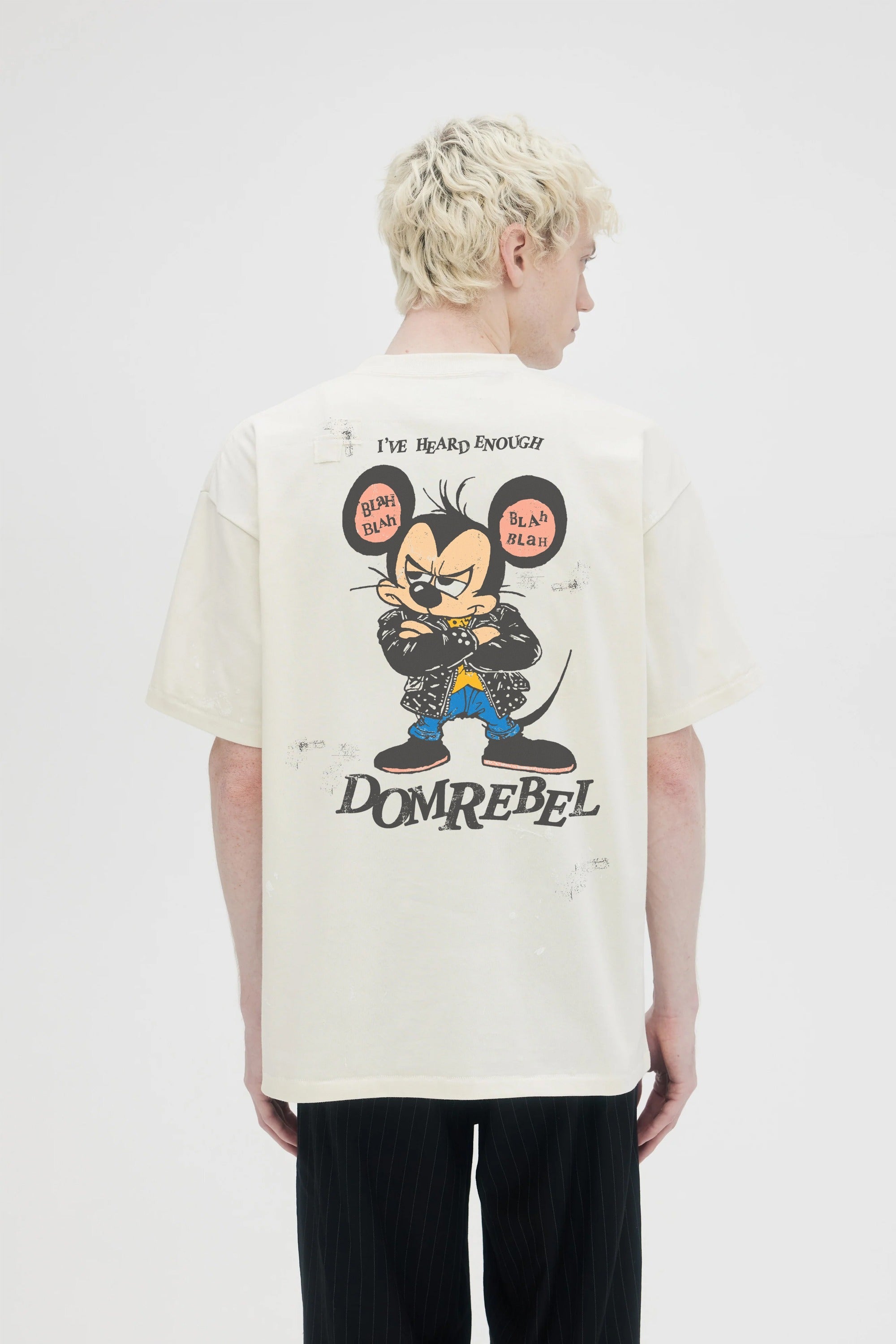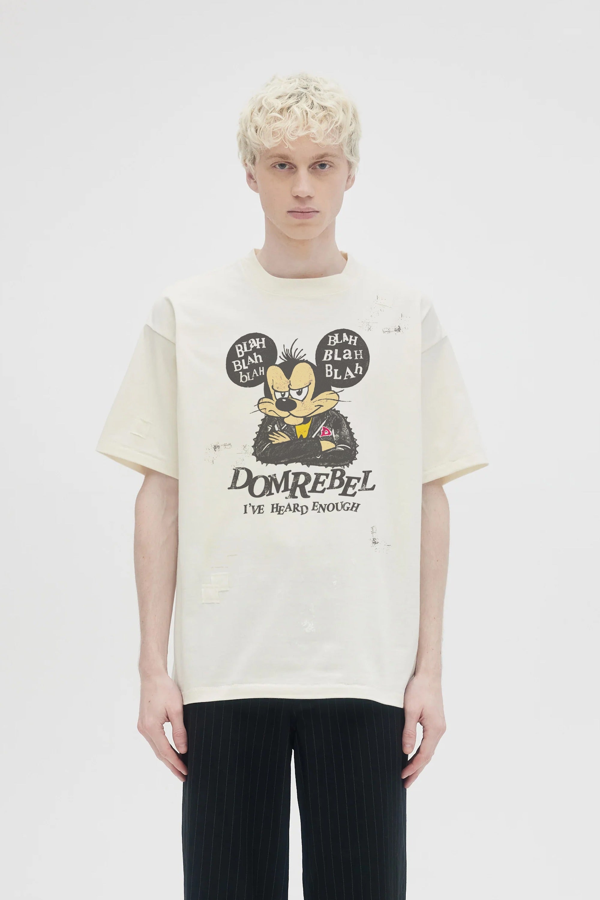 Our crowd-favorite t-shirt fit is made from custom cotton jersey, milled and constructed in Canada. Original DOMREBEL hand-drawn artworks screen-printed on front and back. We built this fit with a higher, cleaner rib neckline, and a very slight drop in the shoulder for the perfect fit. Fit is regular and true to size.