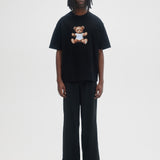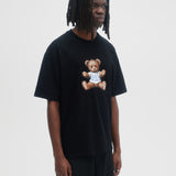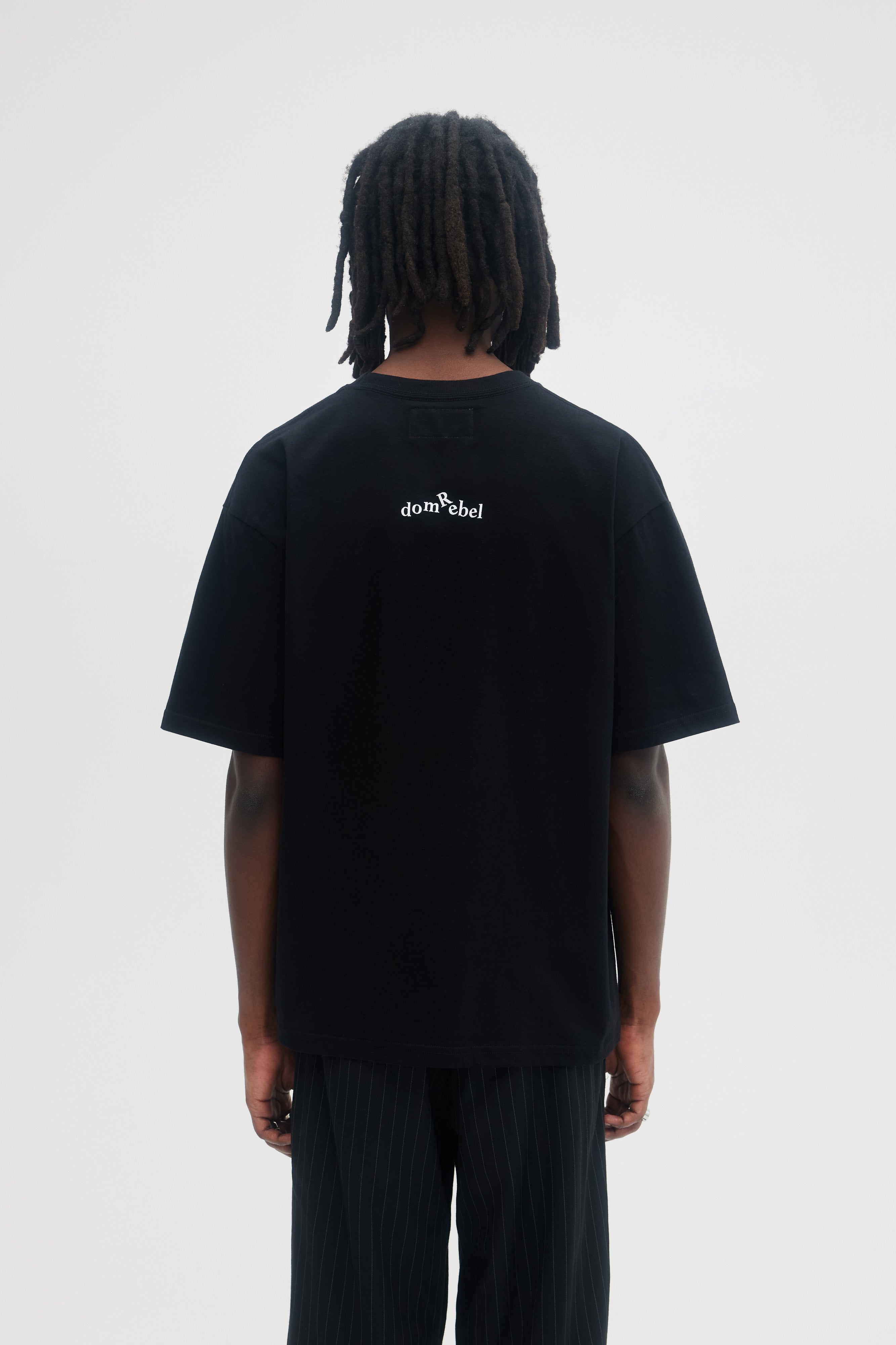 MADE-IN-CANADA DOMREBEL SHORT SLEEVE T-SHIRT IN black COTTON JERSEY. SCREEN-PRINTED ARTWORKS ON FRONT AND BACK. FRONT ARTWORK FEATURES HAND-DRAWN teddy bear wearing a t-shirt that reads "industry people are shady". BACK ARTWORK of domrebel logo with offset letter "r". PART OF OUR "BON VIVANT" COLLECTION, WHICH POKES FUN AT EVERY DAY LIFE WITH A LIGHT-HEARTED SENSE OF HUMOUR.