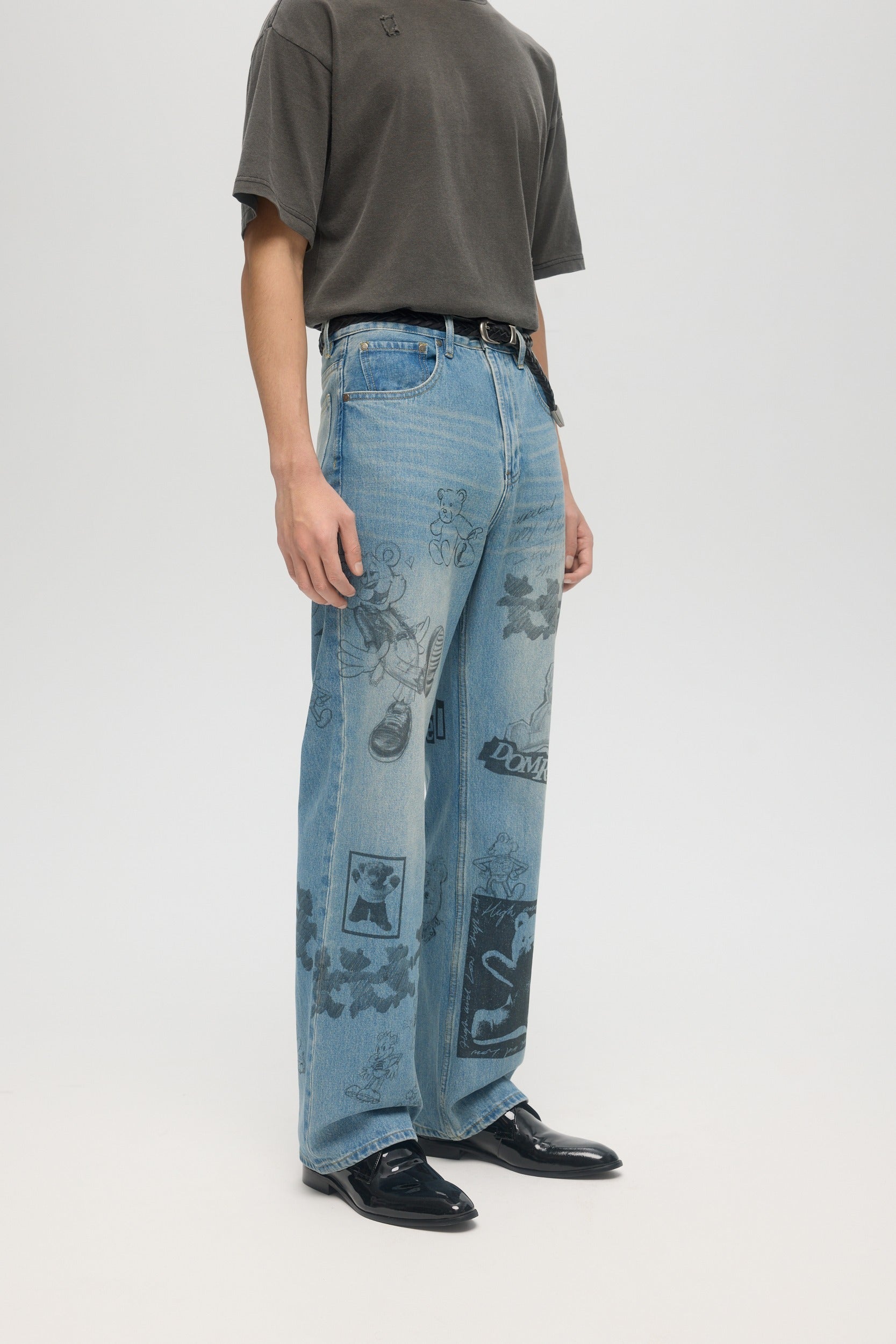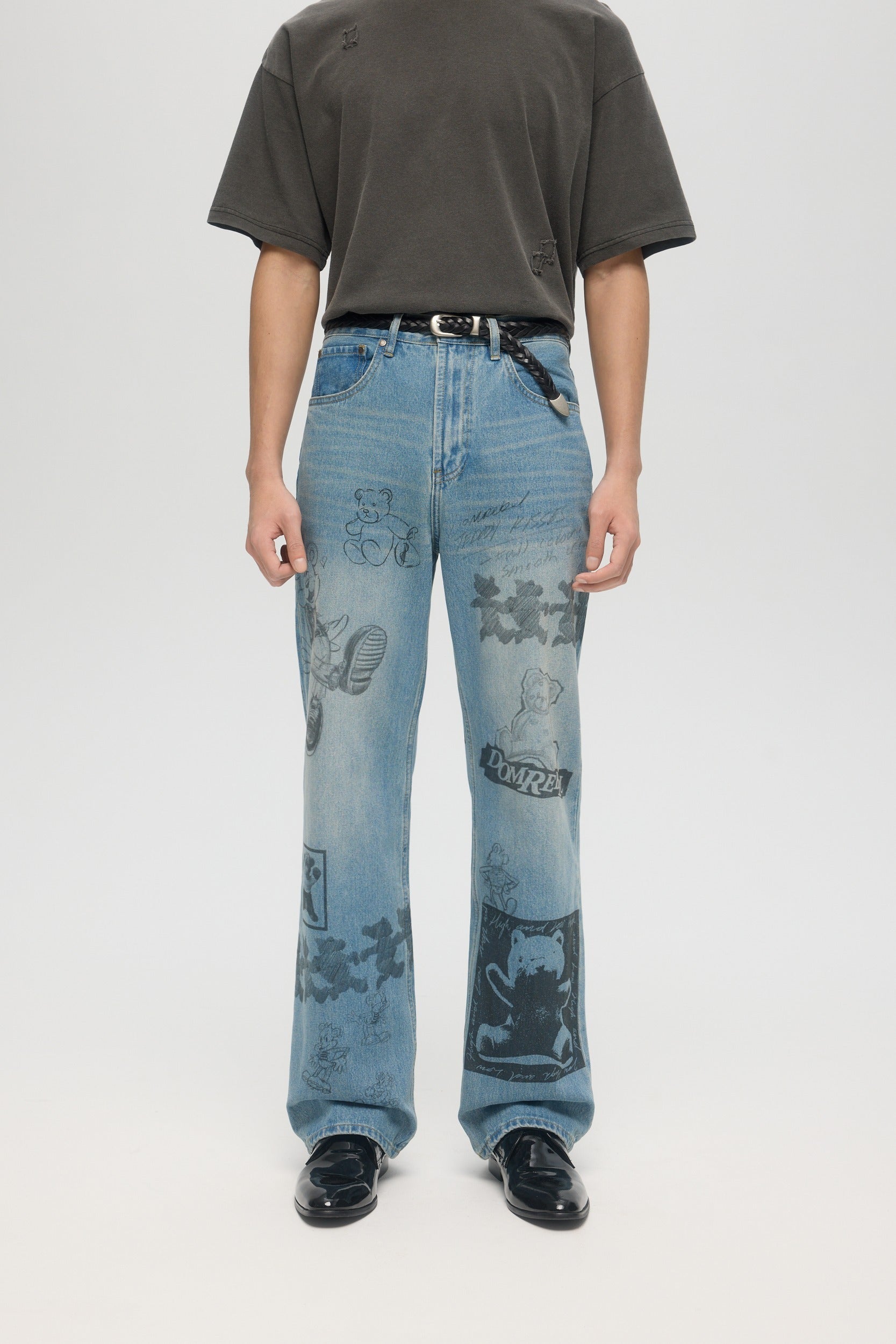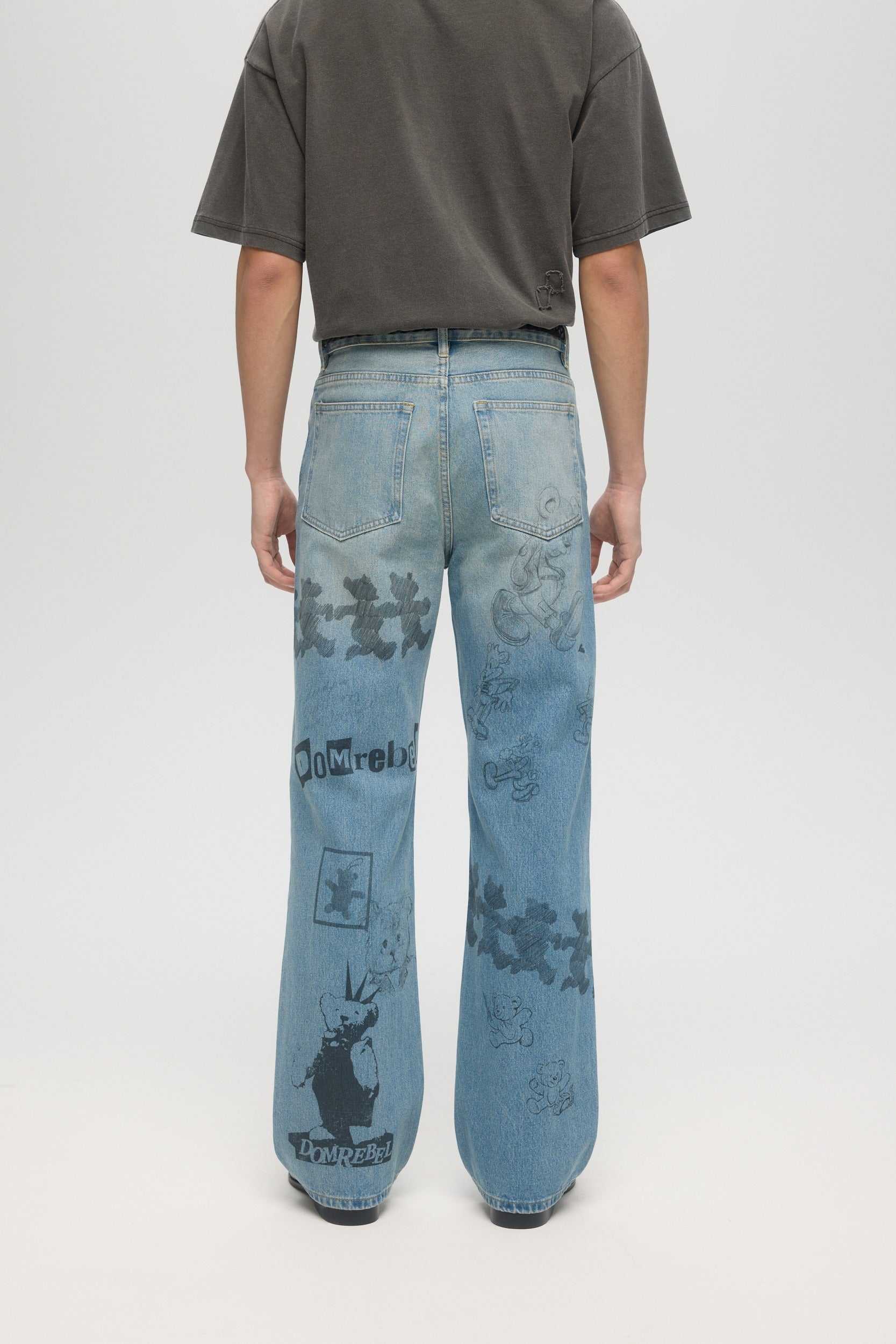 The High Low bootcut jeans are made from 100% cotton mid-weight denim, with DOMREBEL studio drawings printed throughout in DIY style. Fit is relaxed, with a mid-rise and a very slight bootcut opening at the bottom of the jeans. Zip fly and 5-pocket construction. Fits true to size. Pairs well with the High Low sweatshirt.