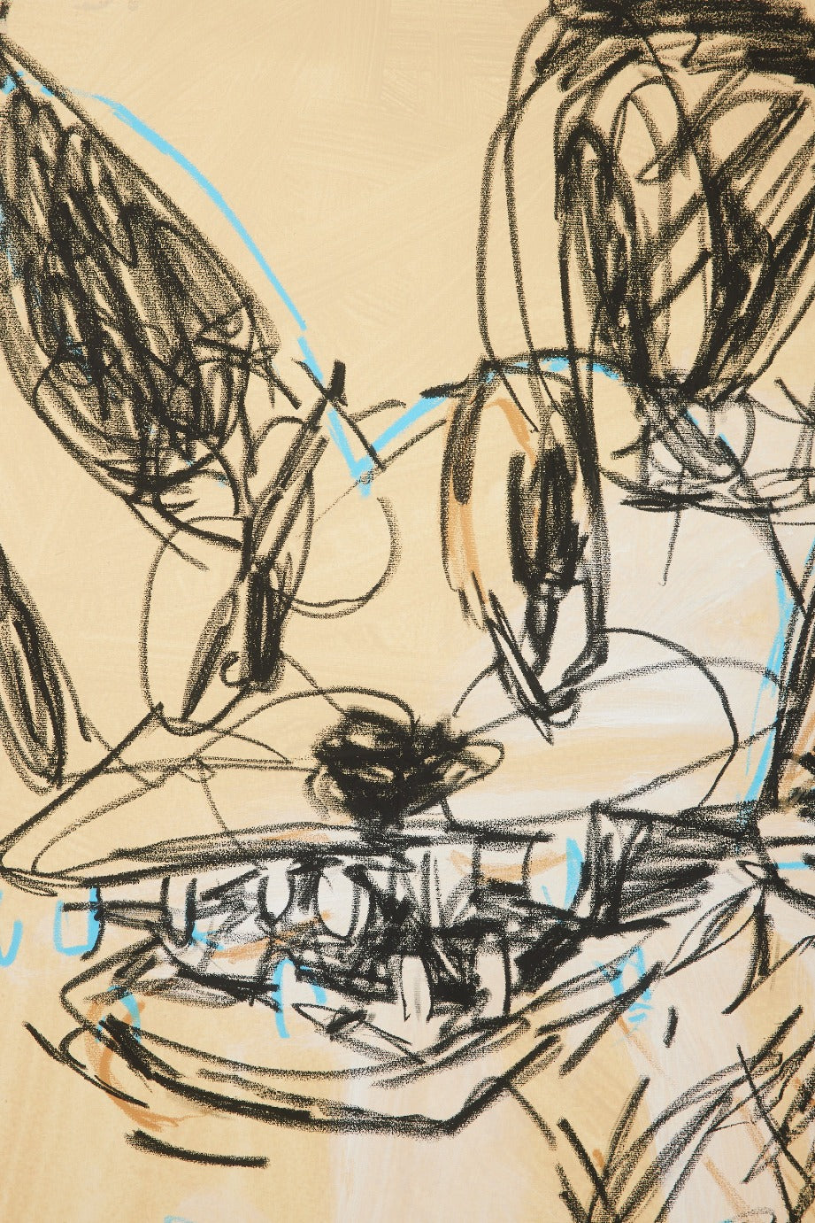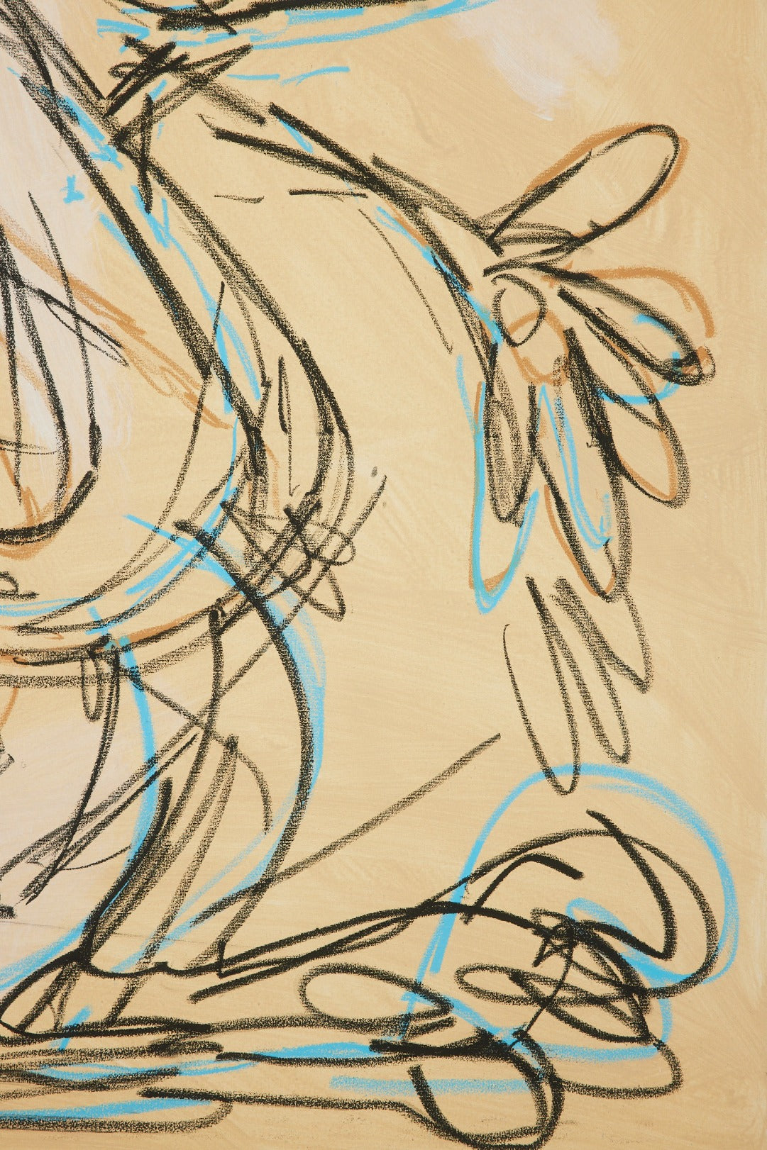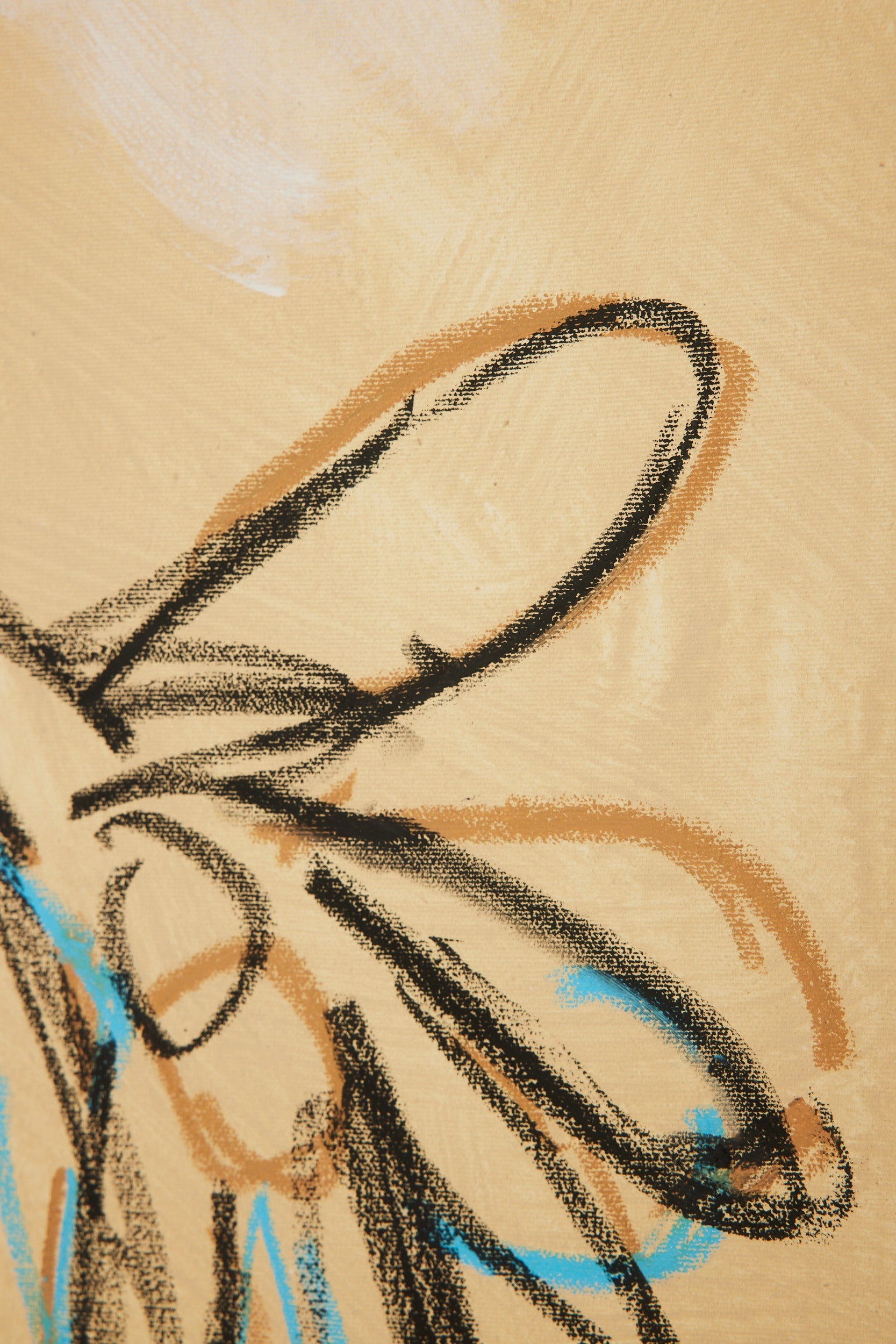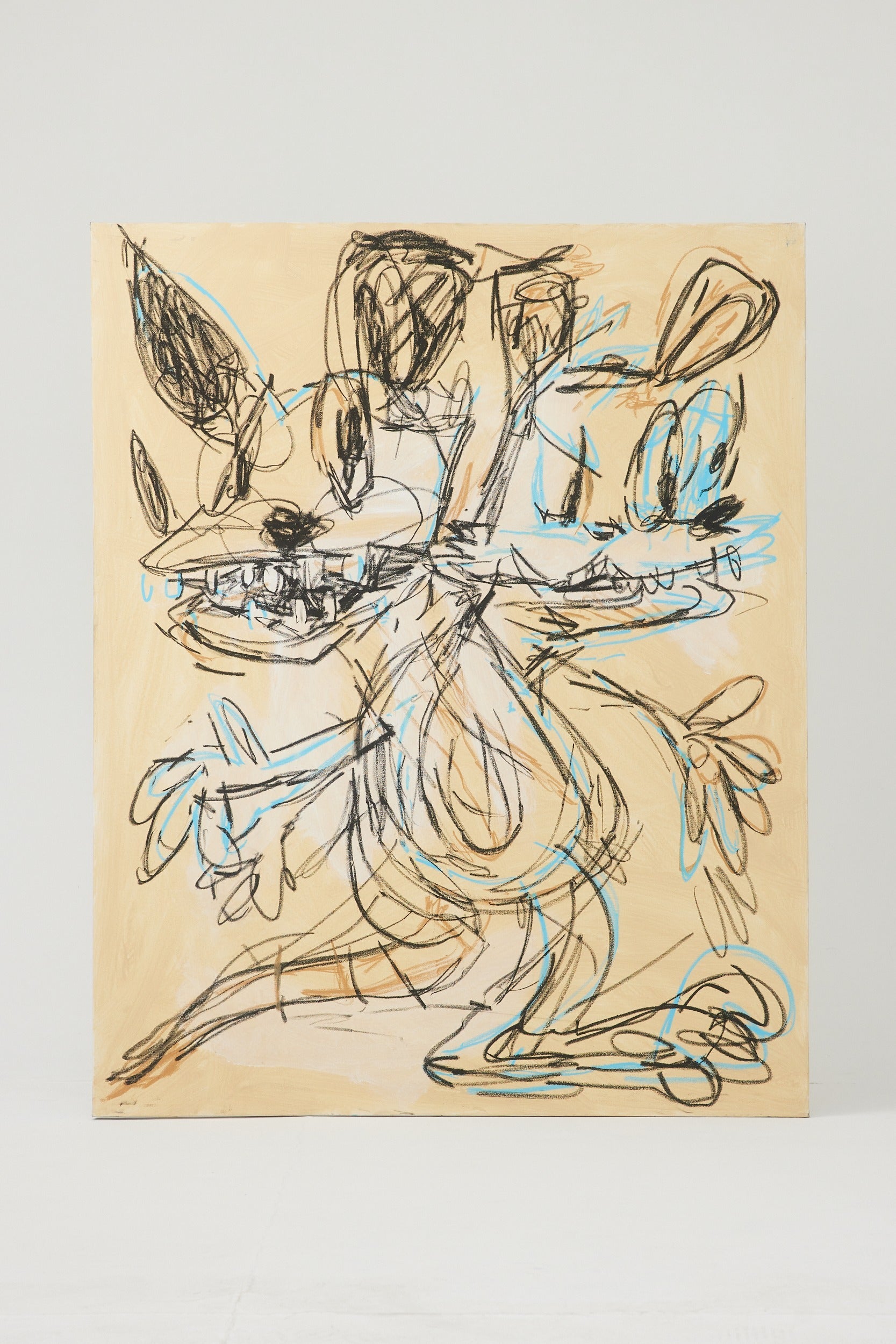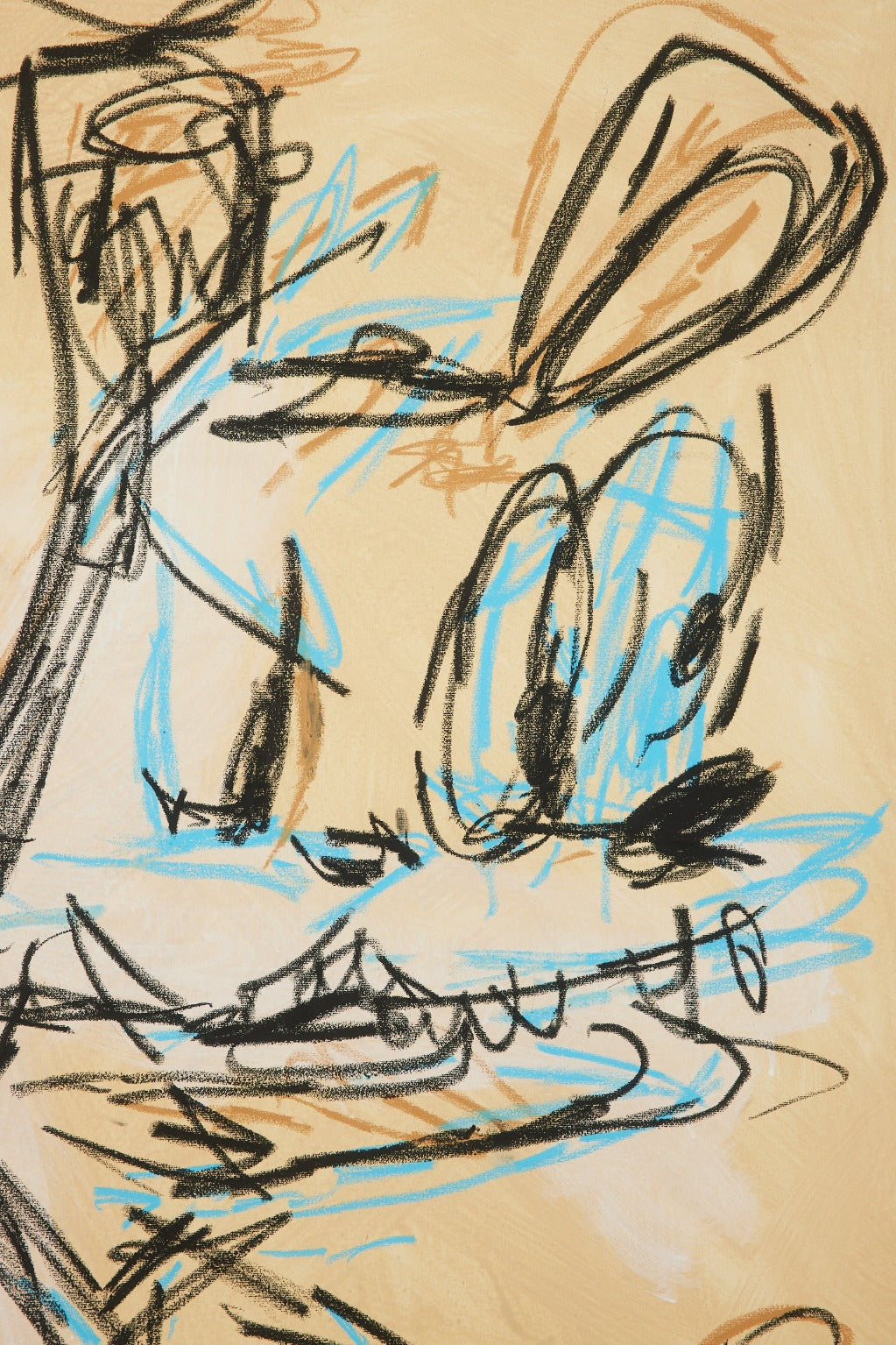 Myles Mouse, a character from the DOMREBEL cartoon world, is engaged in gossip with himself in this 4' x 5' canvas painting. Energetic strokes of oil pastel, charcoal and acrylic bring the cartoon characters to life in expressionist style, on a stained natural canvas. Created, numbered, dated and signed by the team of DOMREBEL studio artists. DOMREBEL fine arts bring the cartoon characters of the DOMREBEL world to life through expressionist renditions of original characters.