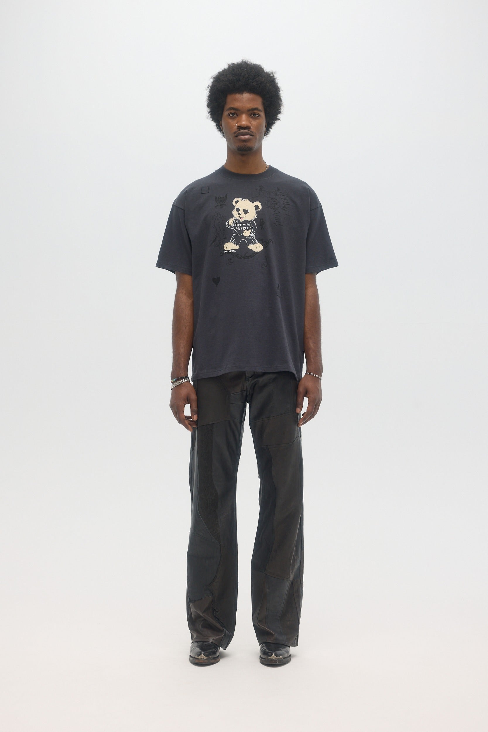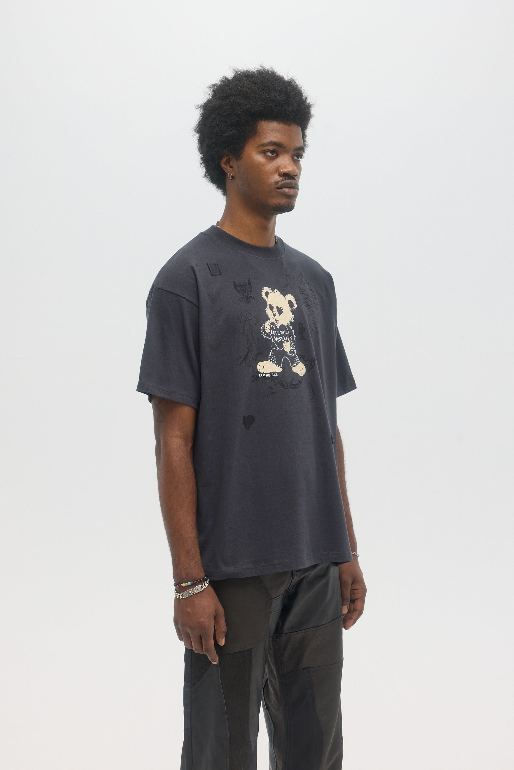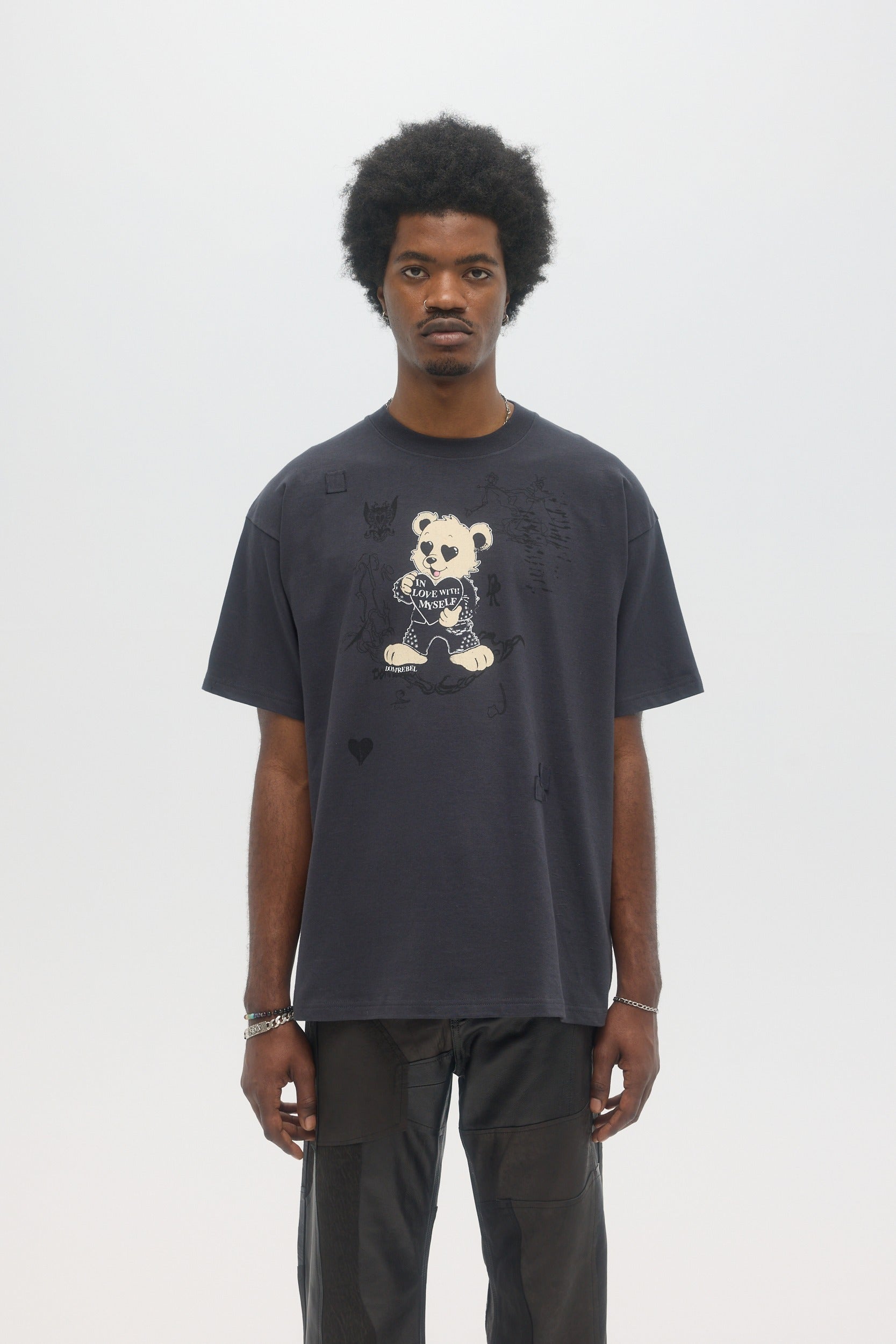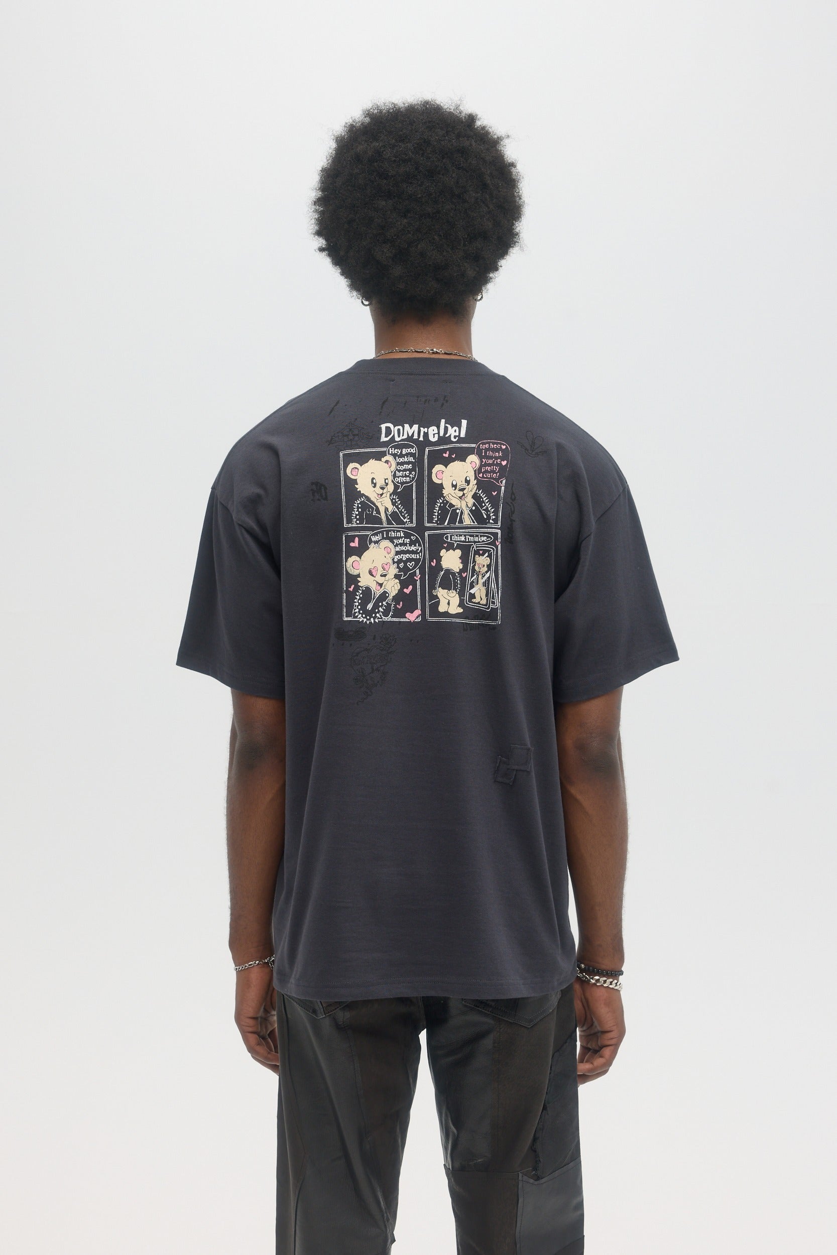 Our crowd-favorite t-shirt fit is made from custom cotton jersey, milled and constructed in Canada. Original DOMREBEL hand-drawn artworks screen-printed on front and back. We built this fit with a higher, cleaner rib neckline, and a very slight drop in the shoulder for the perfect fit. Fit is regular and true to size.