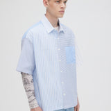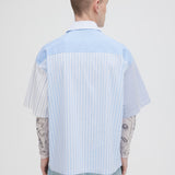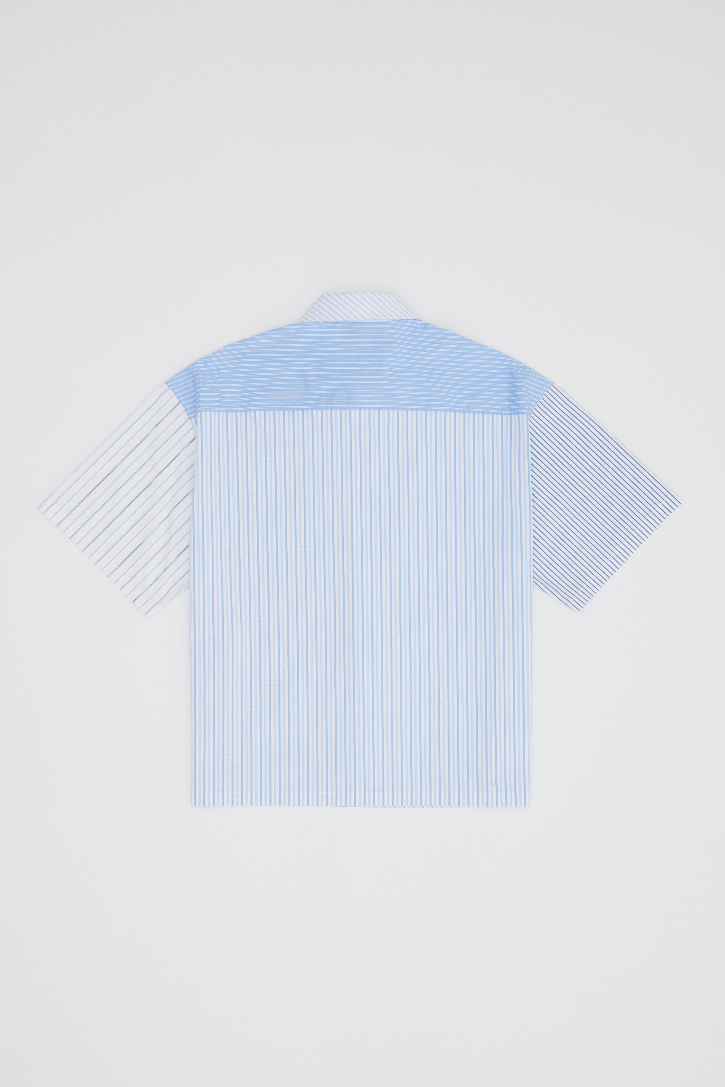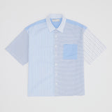 STRIPED COTTON TEXTILES ARE MIXED AND COMBINED IN A PATCHWORK CONSTRUCTION ON THIS RELAXED FIT SHORT SLEEVE SHIRT, WITH PAINT STAINS THROUGHOUT. THIS PIECE IS DIRECTLY INSPIRED BY THE DROPCLOTHS AND CANVASES USED BY THE DOMREBEL ART COLLECTIVE WHILE THEY CREATE PAINTINGS IN THE MONTRÉAL STUDIO.