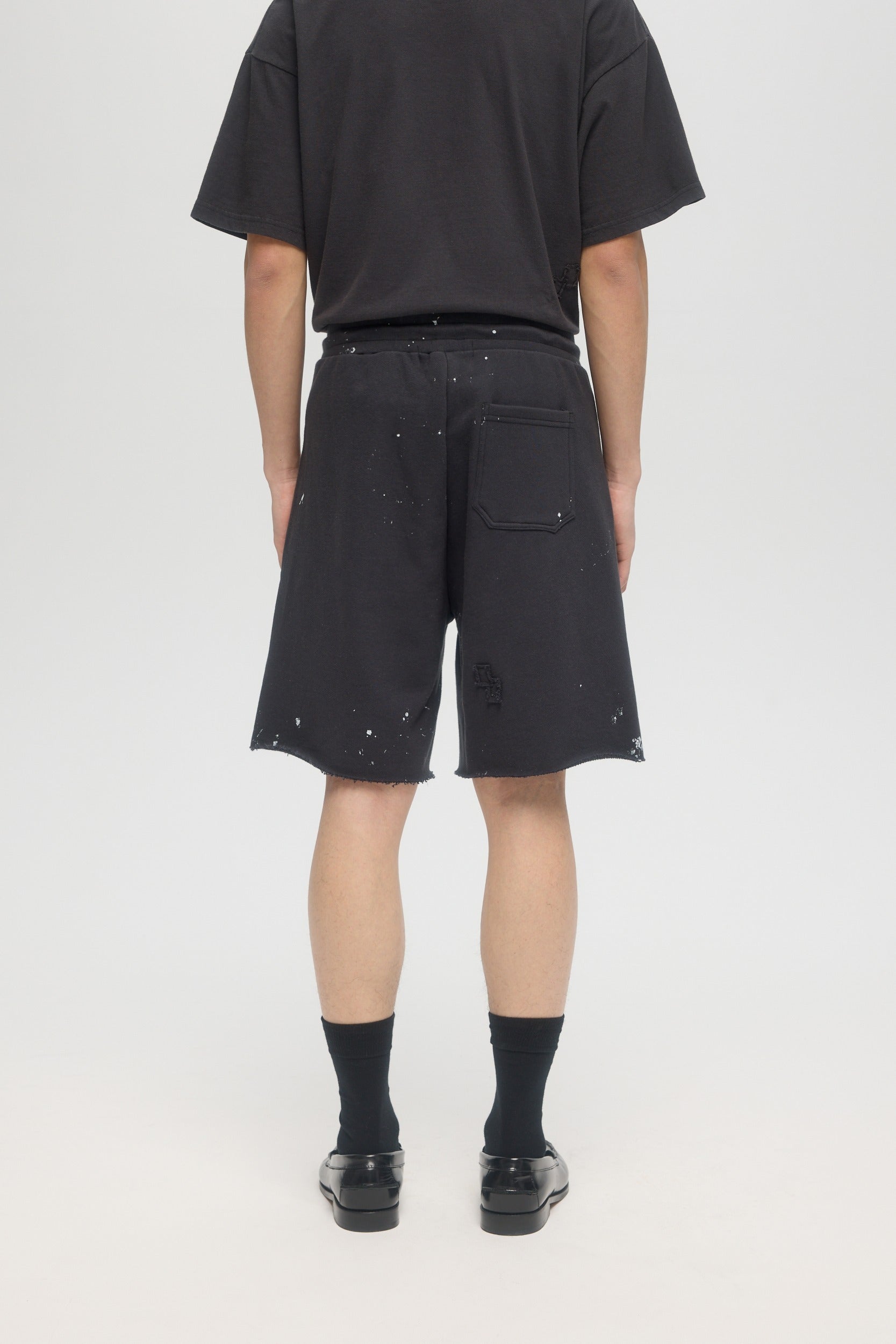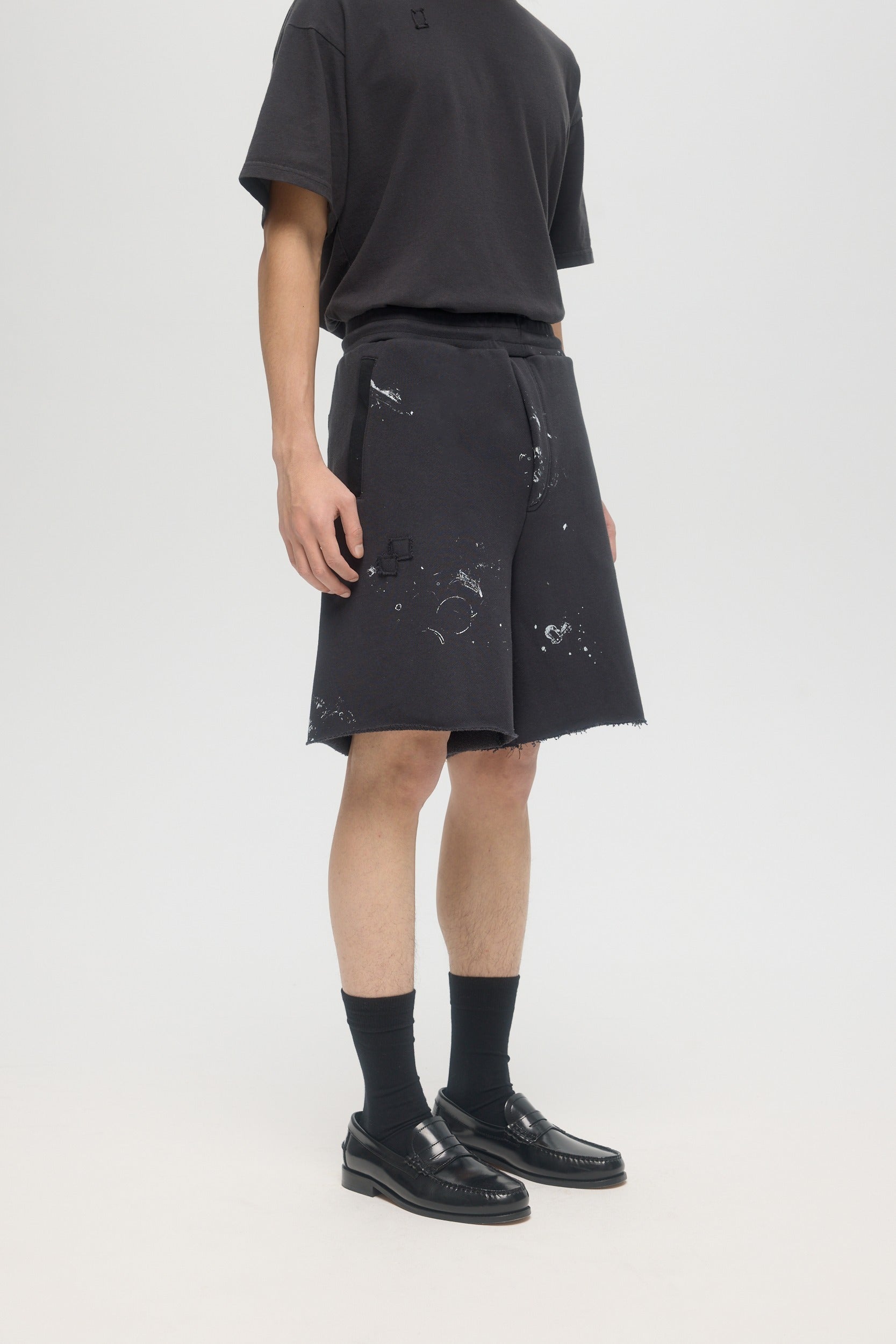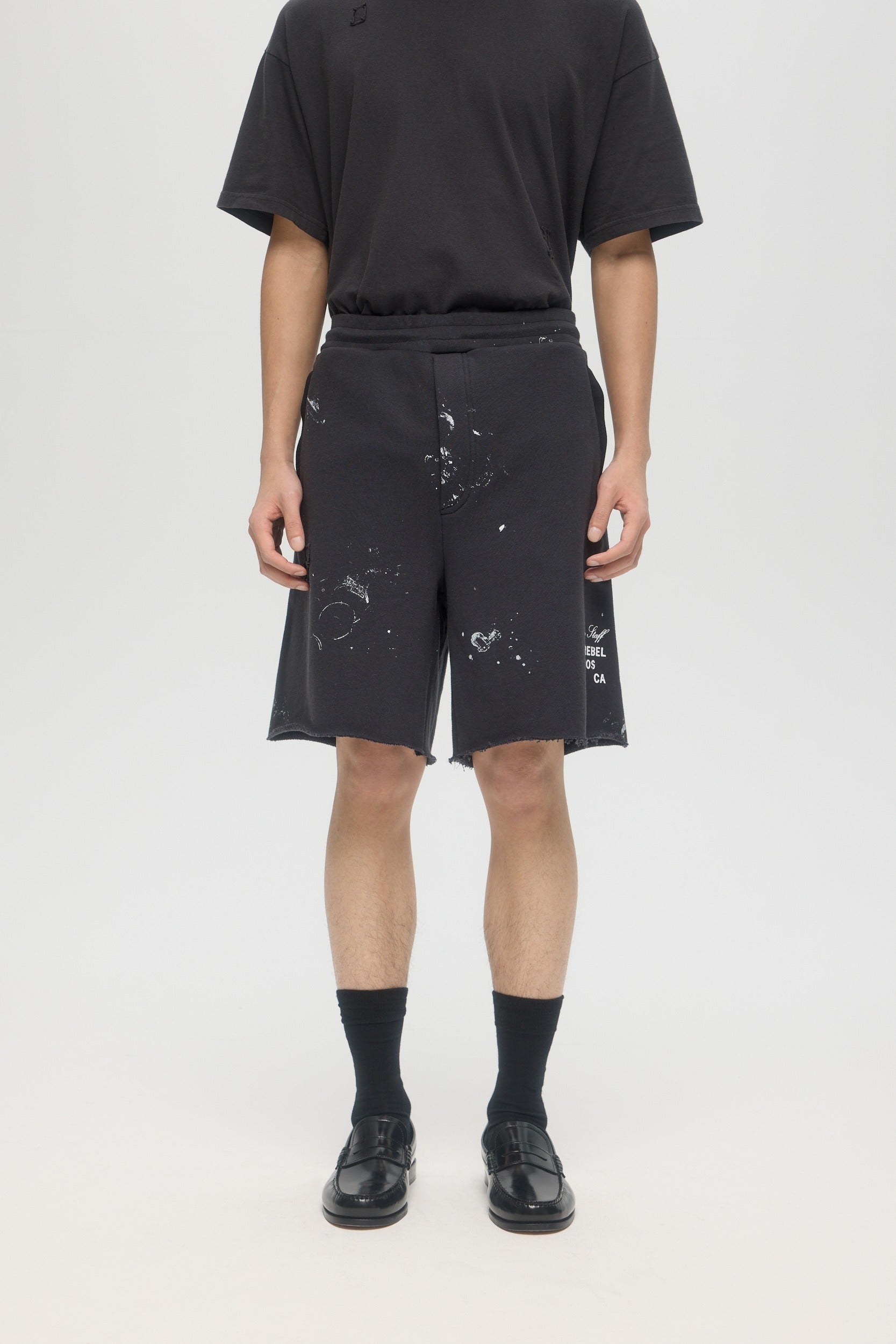 The Staff sweatshorts are made from custom cotton loop-back french terry, milled and constructed in Canada. Studio paints stains are printed throughout, with DOMREBEL logo printed on thigh. Featuring side zip pockets with grosgrain trim, faux fly construction at front, a raw edge finish on the leg openings. Fit is regular and true to size.