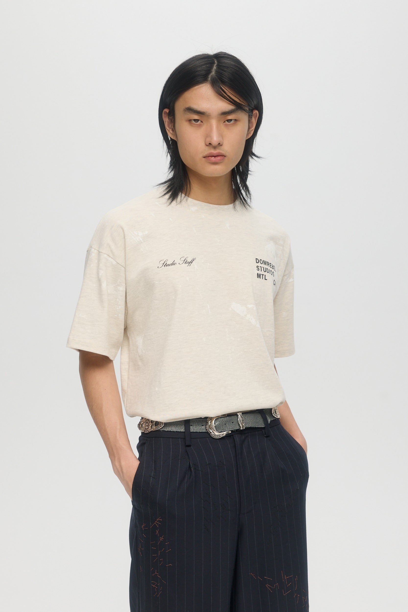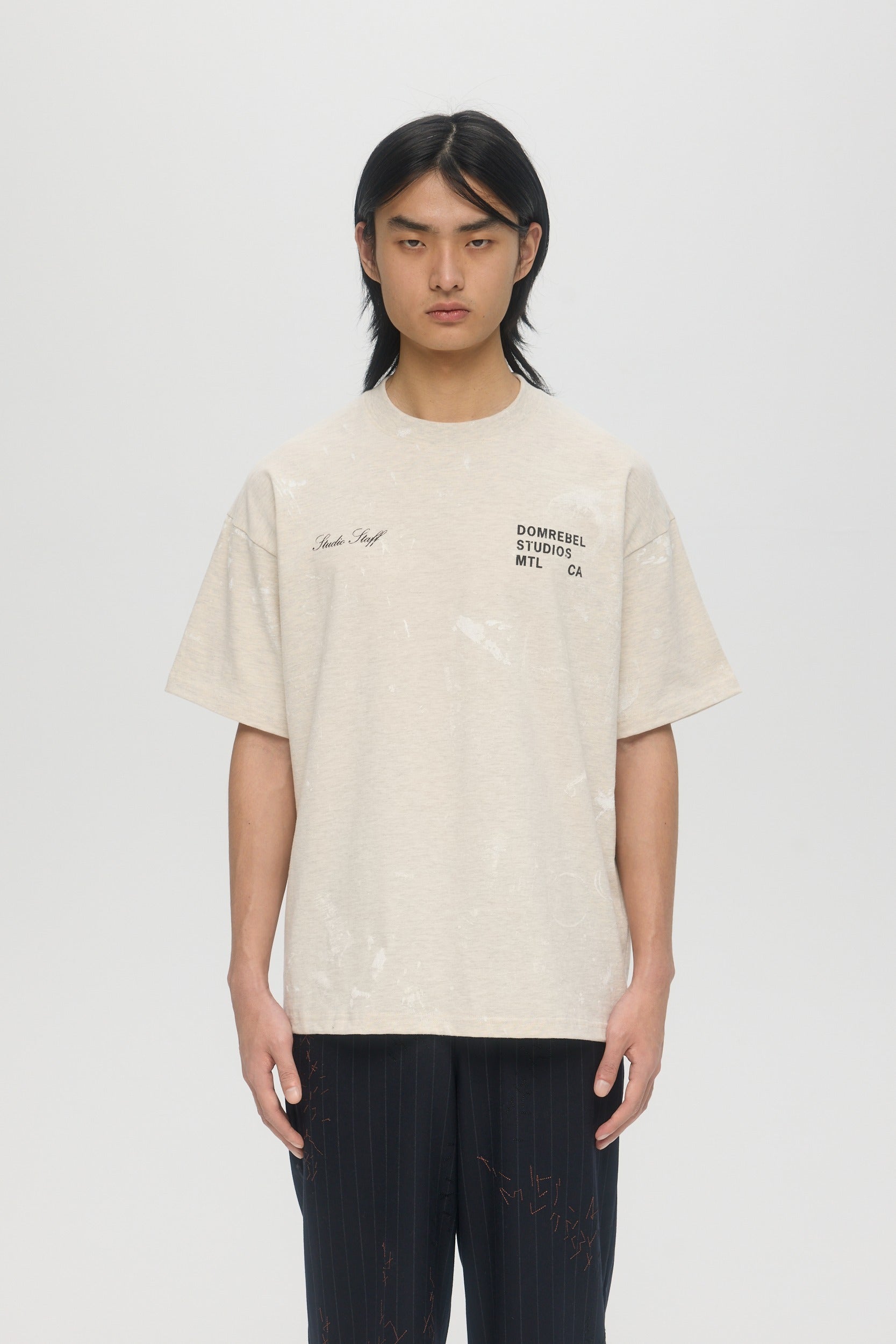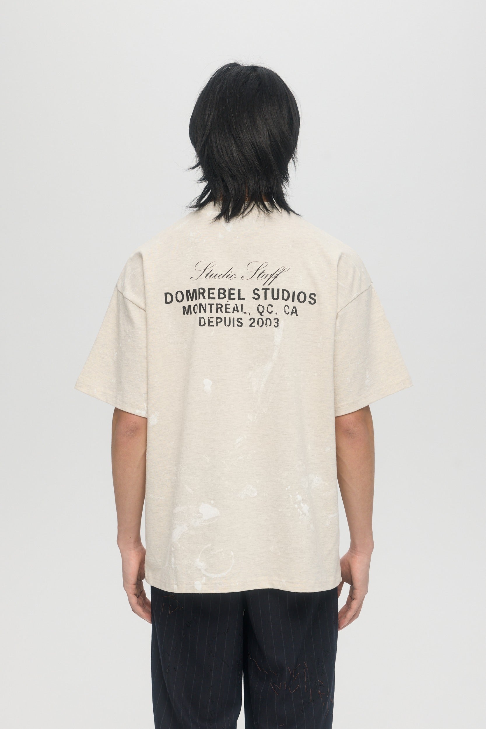 The Staff t-shirt is made from custom cotton jersey, milled and constructed in Canada. Paint stains are screen-printed throughout, with DOMREBEL logo print on chest and "Studio Staff" print on opposite side. Fit is regular and true to size.