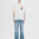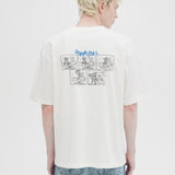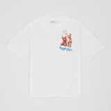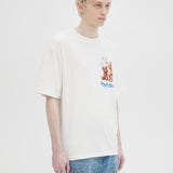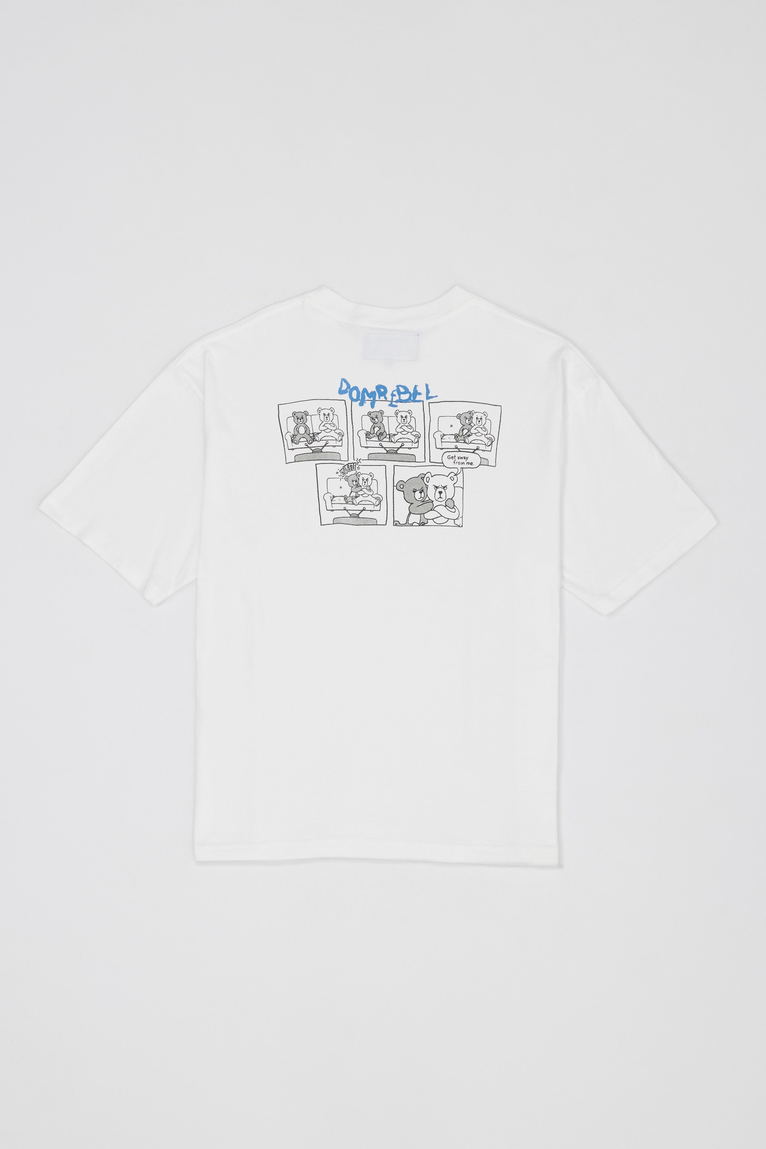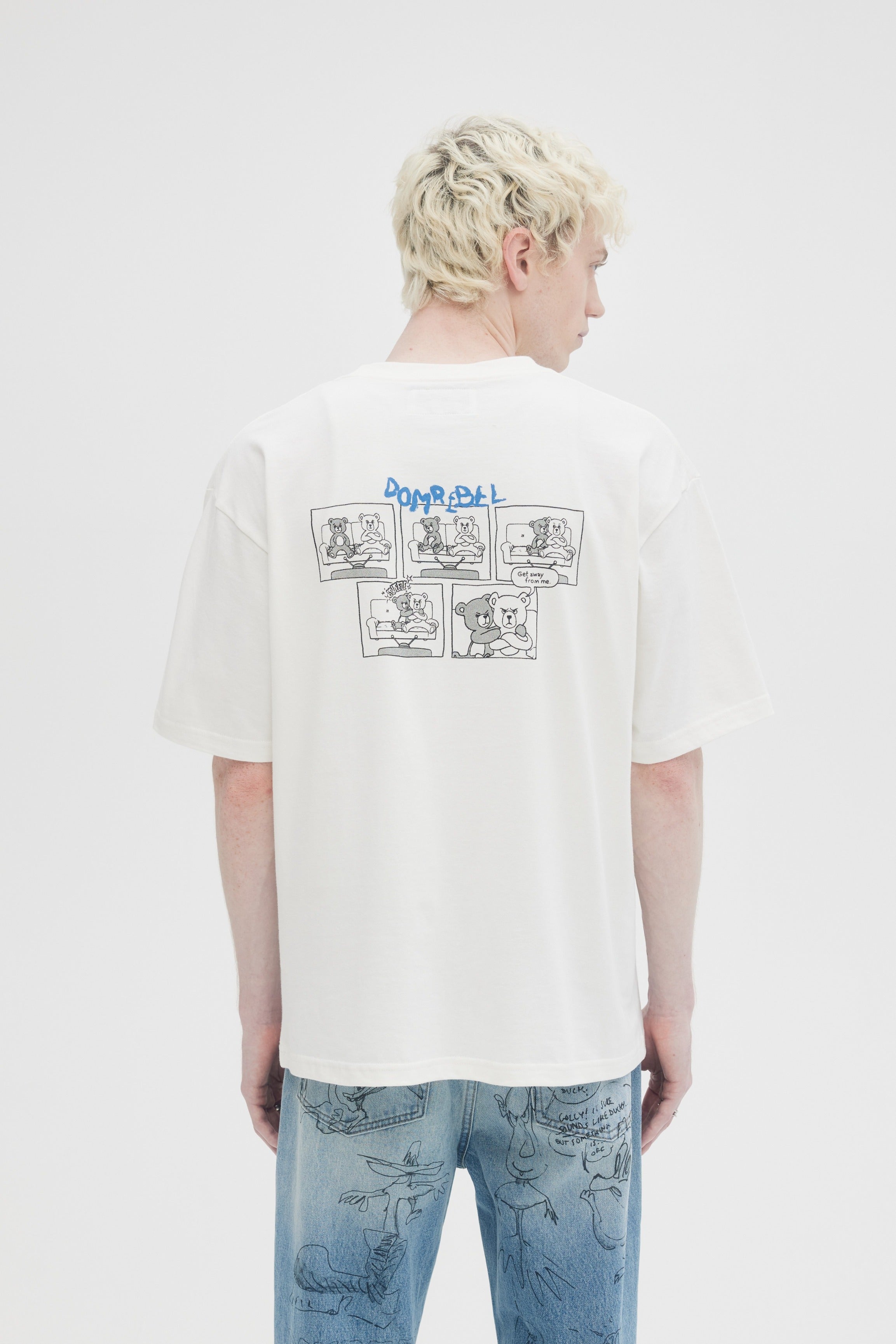 MADE-IN-CANADA DOMREBEL SHORT SLEEVE T-SHIRT IN IVORY COTTON JERSEY. SCREEN-PRINTED ARTWORKS ON FRONT AND BACK. FRONT ARTWORK FEATURES two teddy bears, with one saying "you suffocate me" and the other bear looking confused. BACK ARTWORK FEATURES THE teddy bears in a comic panel, watching tv, and one of them is very annoyed with how close the other one is sitting to them. PART OF OUR "BON VIVANT" COLLECTION, WHICH POKES FUN AT EVERY DAY LIFE WITH A LIGHT-HEARTED SENSE OF HUMOUR.